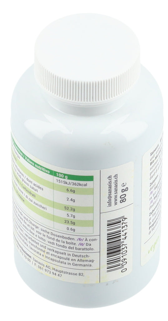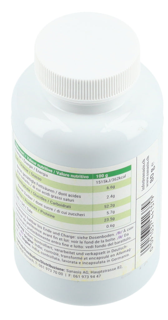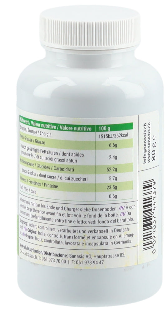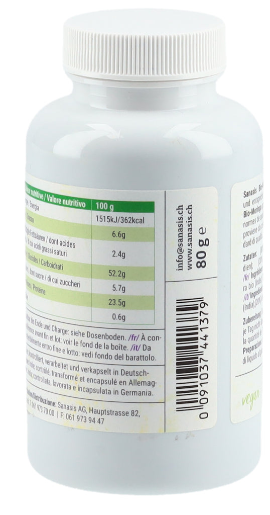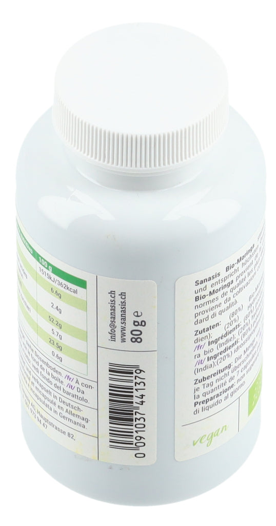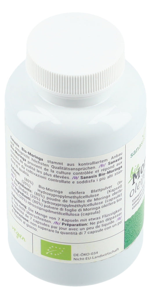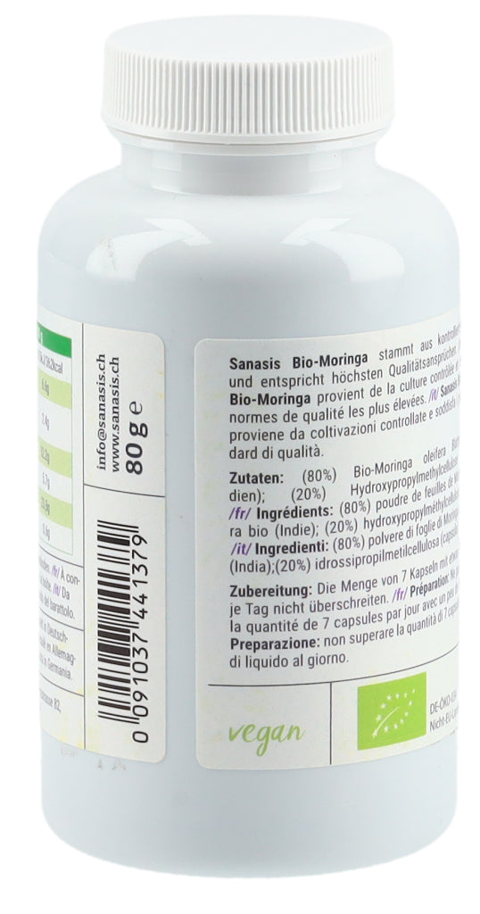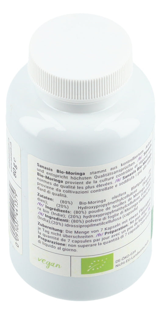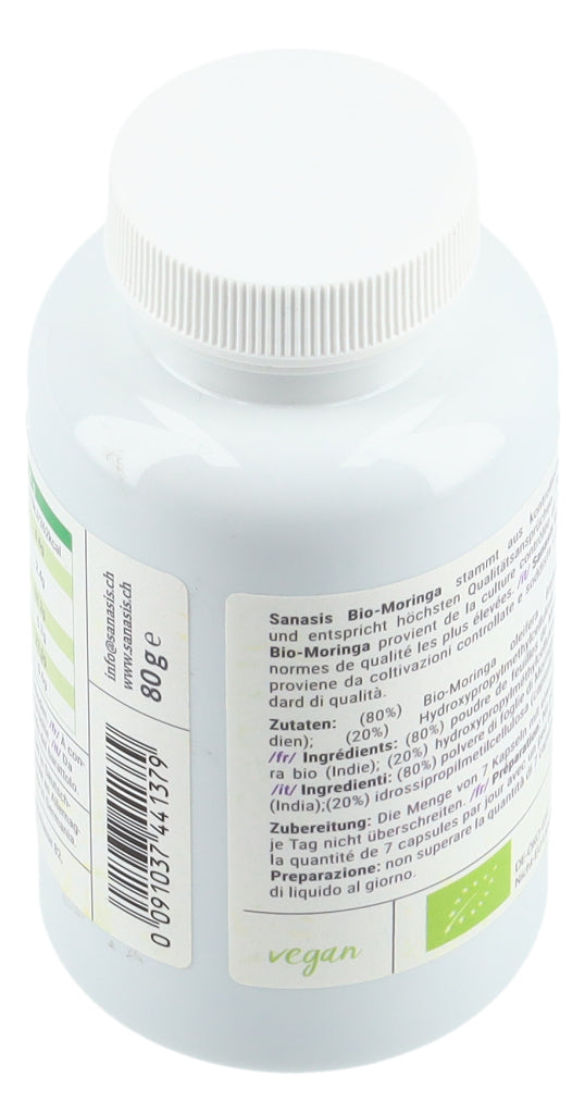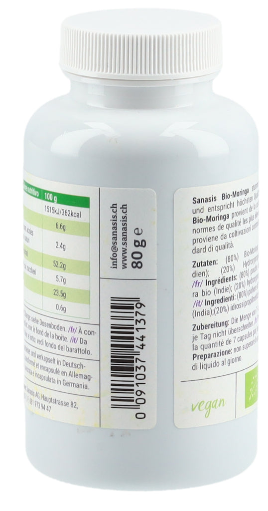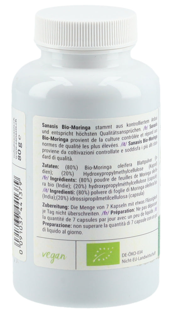 (80%) Bio-Moringa oleifera Blattpulver (Indien); (20%) Hydroxypropylmethylcellulose (Kapsel)..