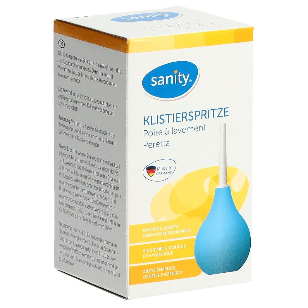 Die Klistierspritze aus SAROLIT ist ein Medizinprodukt zur Selbstdurchführung einer Darmspülung mit lauwarmem Wasser, für mehrfache Anwendungen bei einem Patienten.