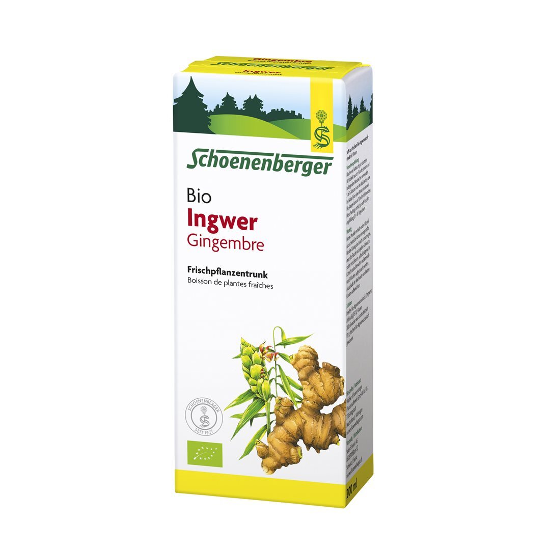 Der Schoenenberger Ingwer Frischpflanzentrunk enthält den reinen Presssaft aus frischem Bio-Ingwerwurzelstock (Zingiberis officinalis) (75 %) mit Wasser.