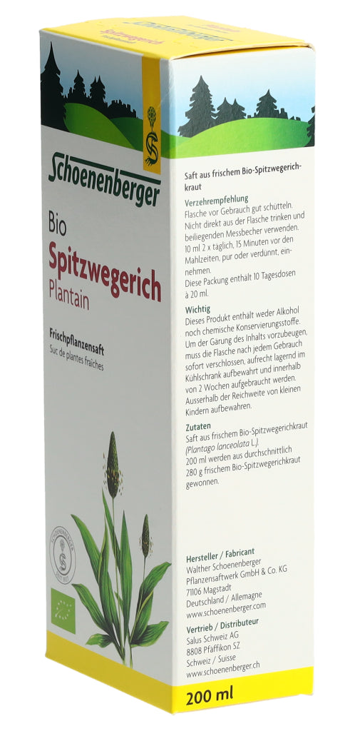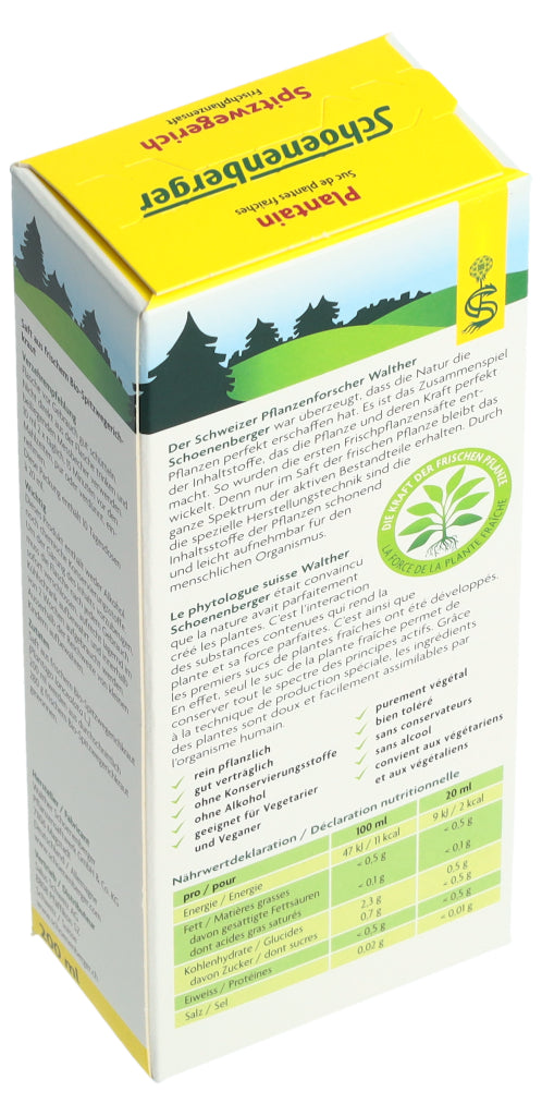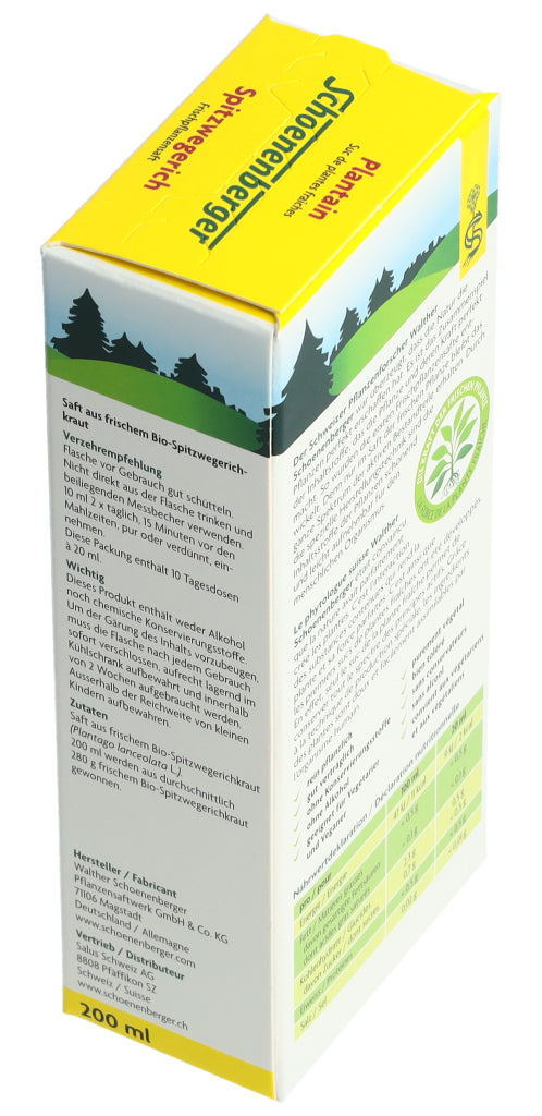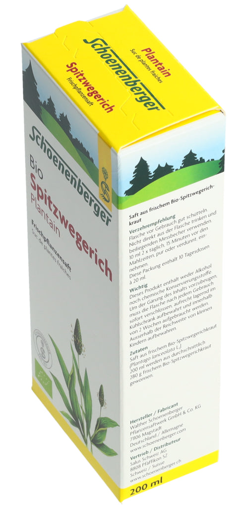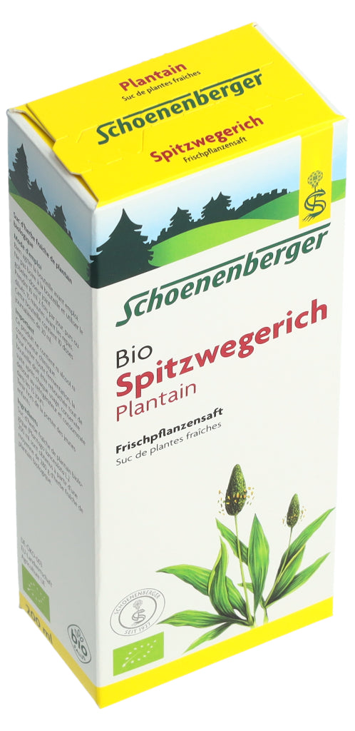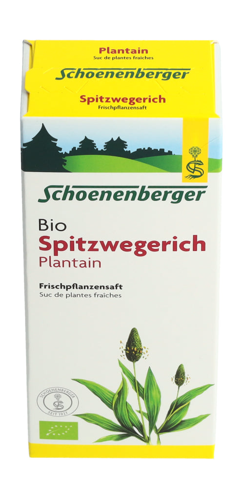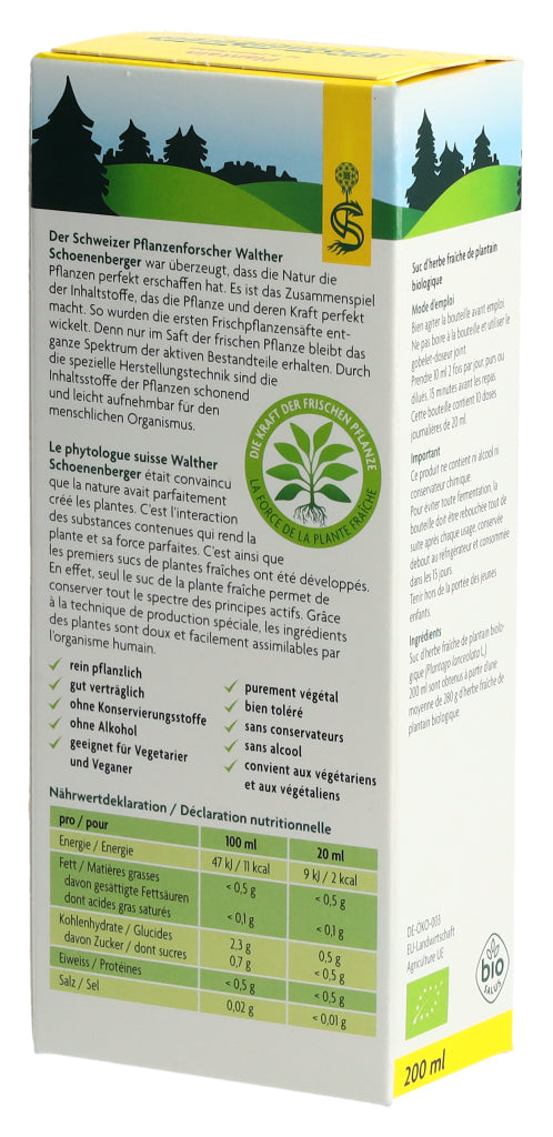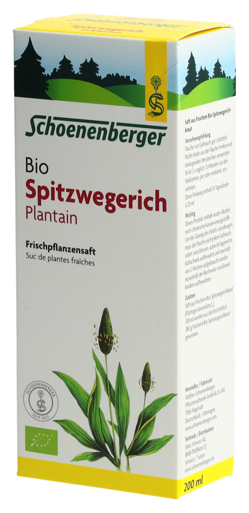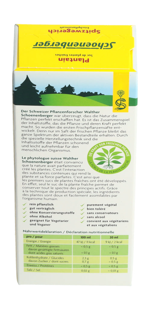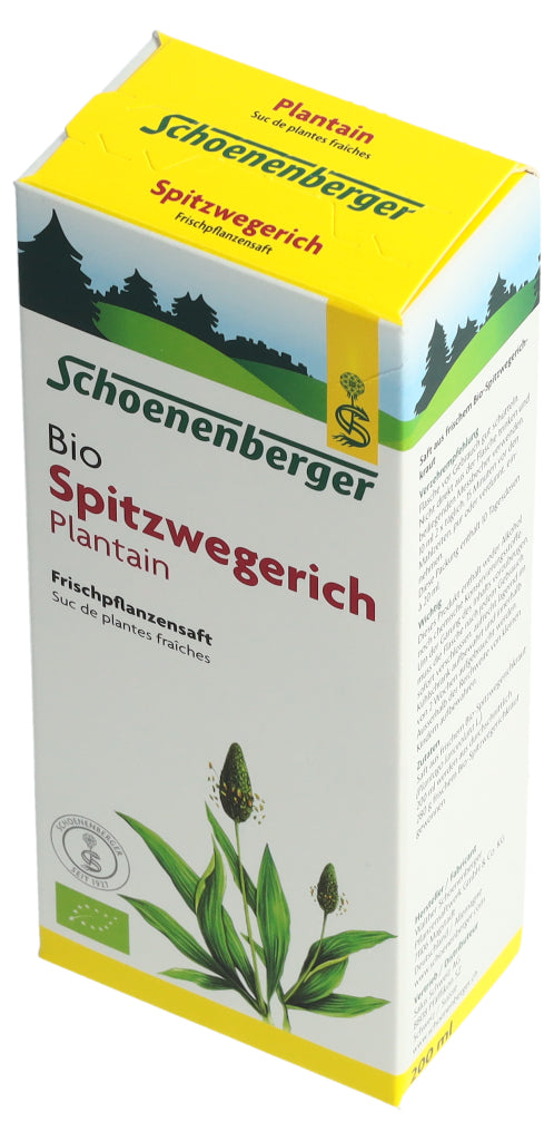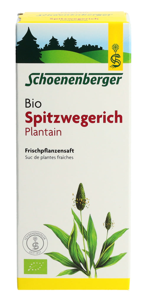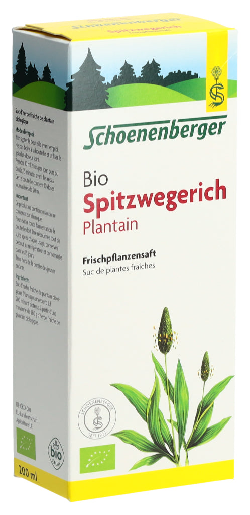 Der Schoenenberger Spitzwegerich Frischpflanzensaft enthält den reinen Presssaft aus frischem Bio-Spitzwegerichkraut (Plantago lanceolata L.).
