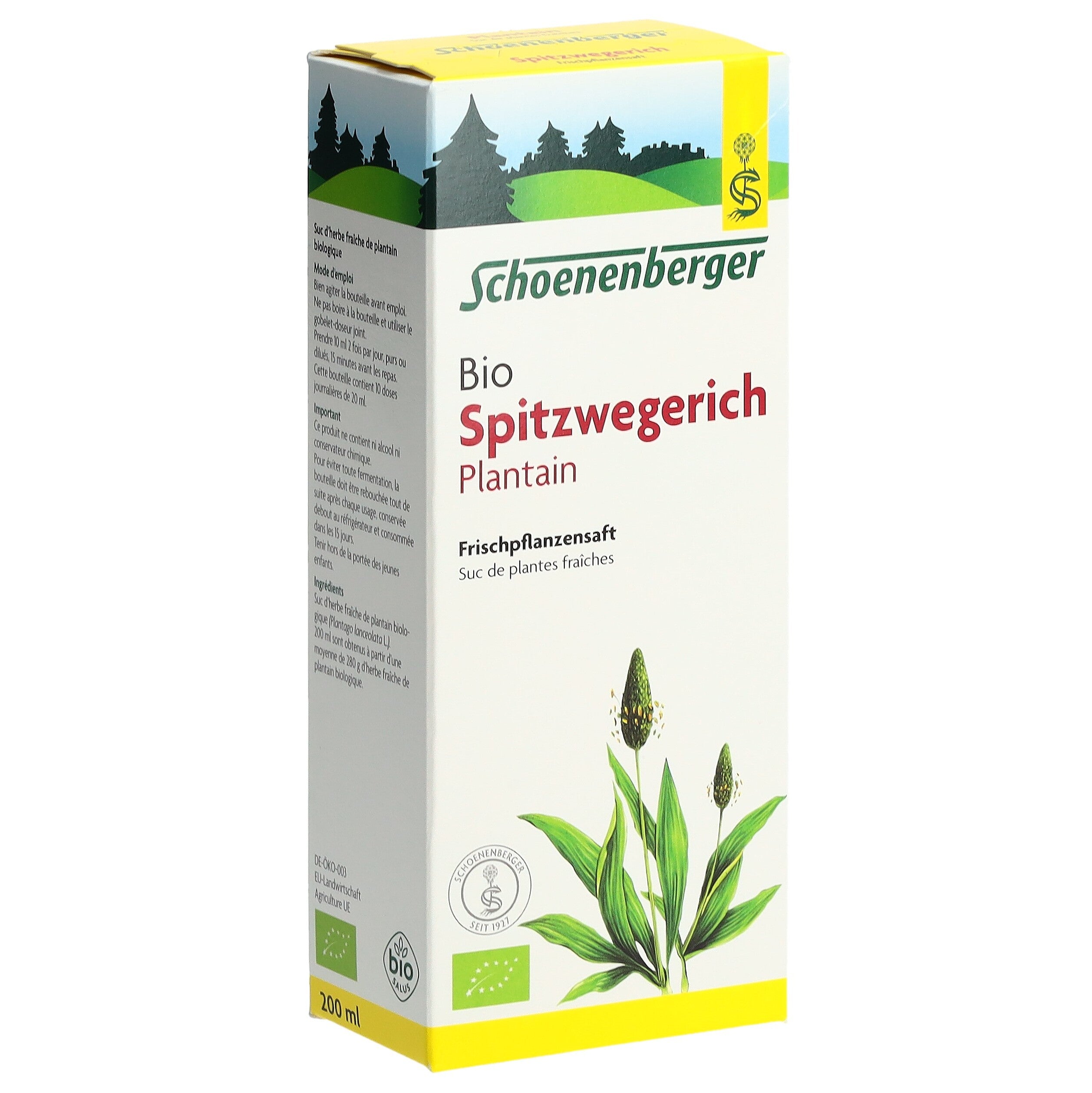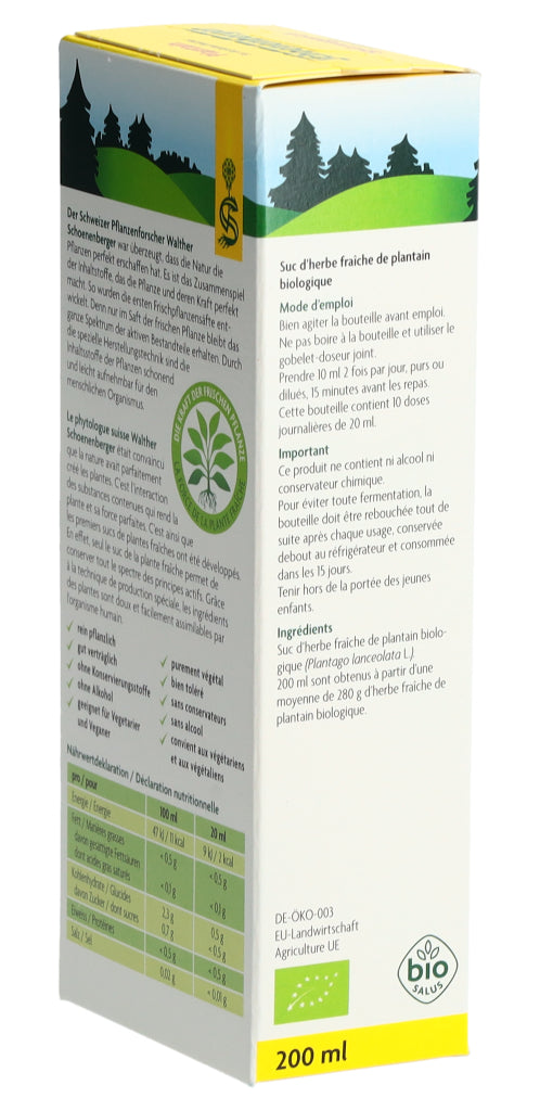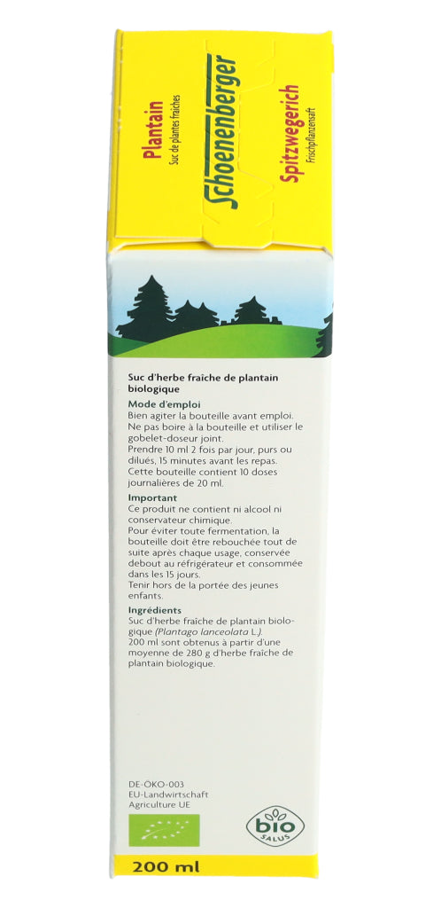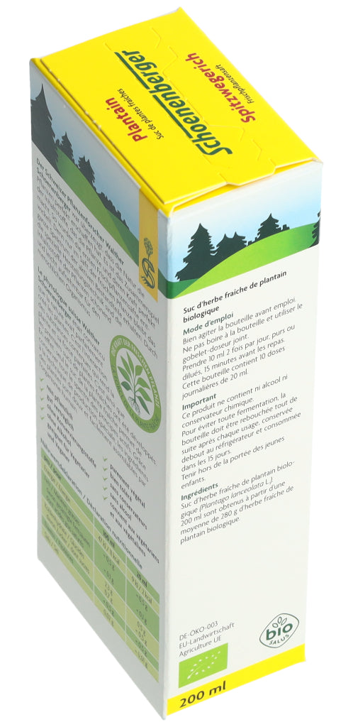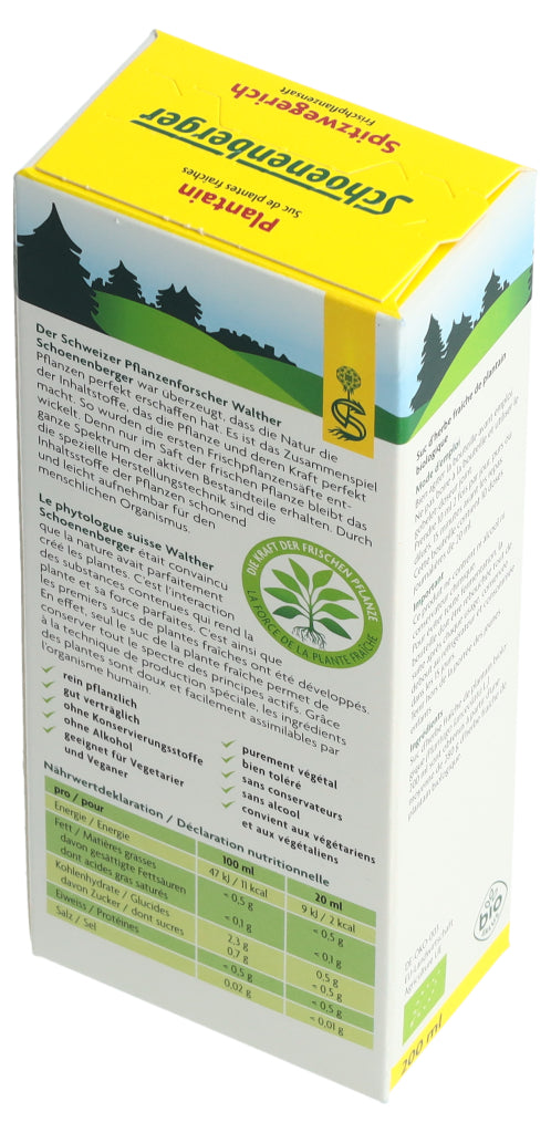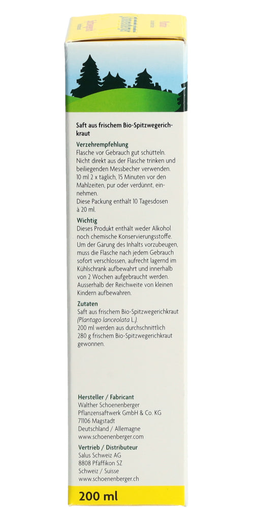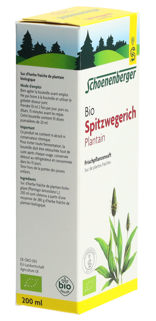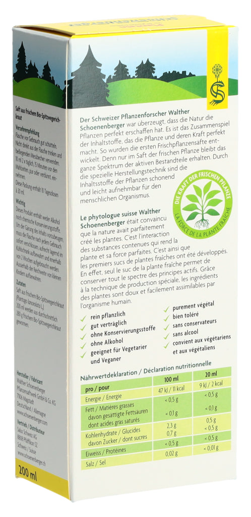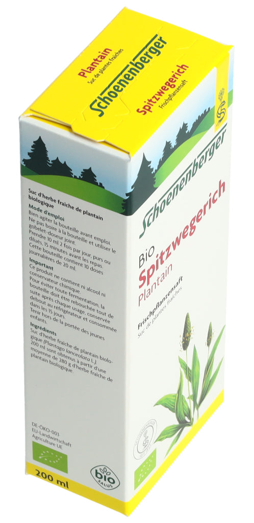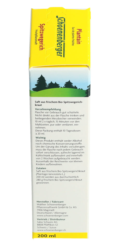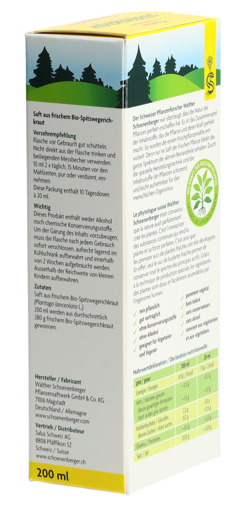 Der Schoenenberger Spitzwegerich Frischpflanzensaft enthält den reinen Presssaft aus frischem Bio-Spitzwegerichkraut (Plantago lanceolata L.).