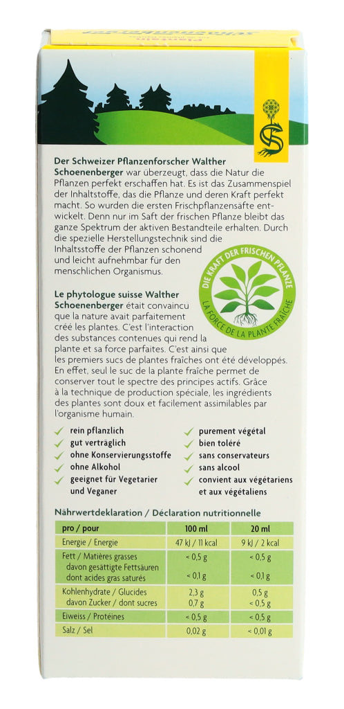Der Schweizer Pflanzenforscher Walther Schoenenberger war überzeugt, dass die Natur die Pflanzen perfekt erschaffen hat. Es ist das Zusammenspiel der Inhaltstoffe, das die Pflanze und deren Kraft perfekt macht. So wurden die ersten Frischpflanzensäfte entwickelt. Denn nur im Saft der frischen Pflanze bleibt das ganze Spektrum der aktiven Bestandteile erhalten. Durch die spezielle Herstellungstechnik sind die Inhaltsstoffe der Pflanzen schonend und leicht aufnehmbar für den menschlichen Organismus.