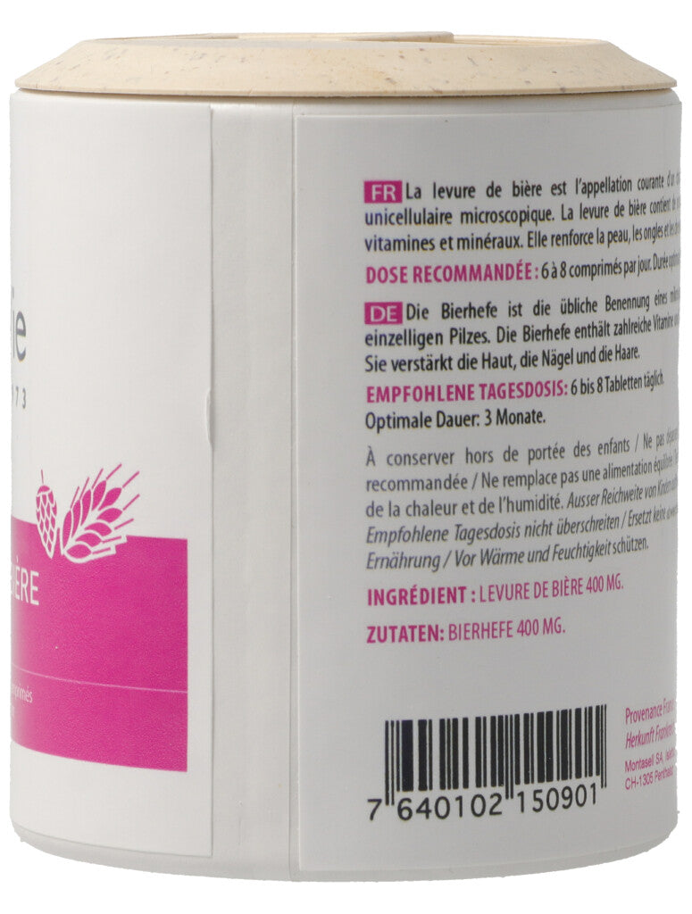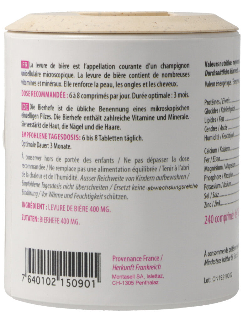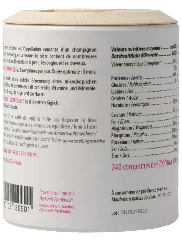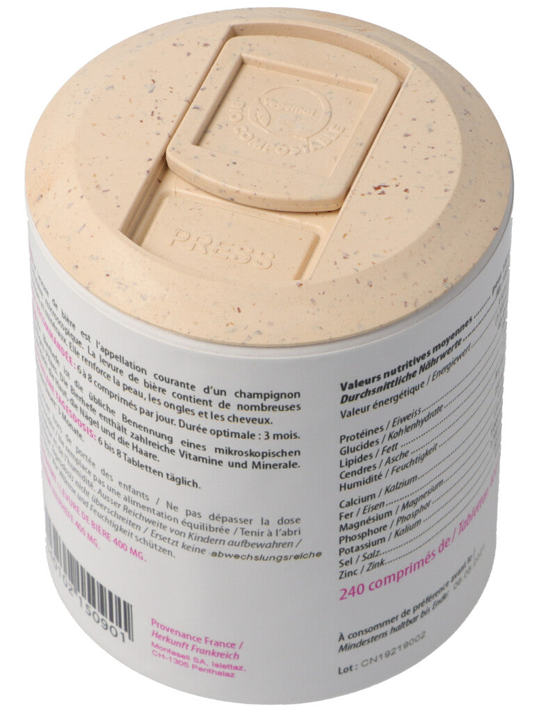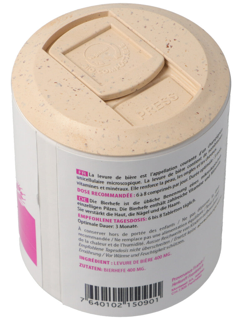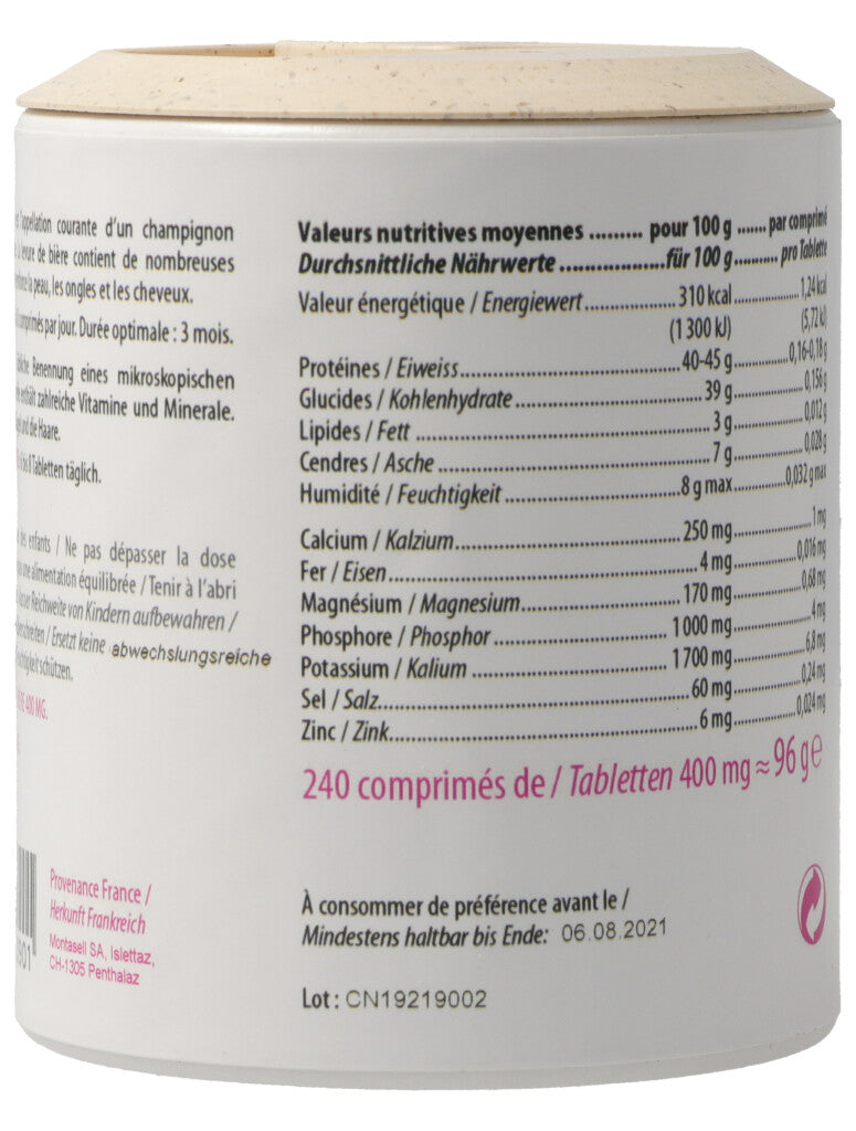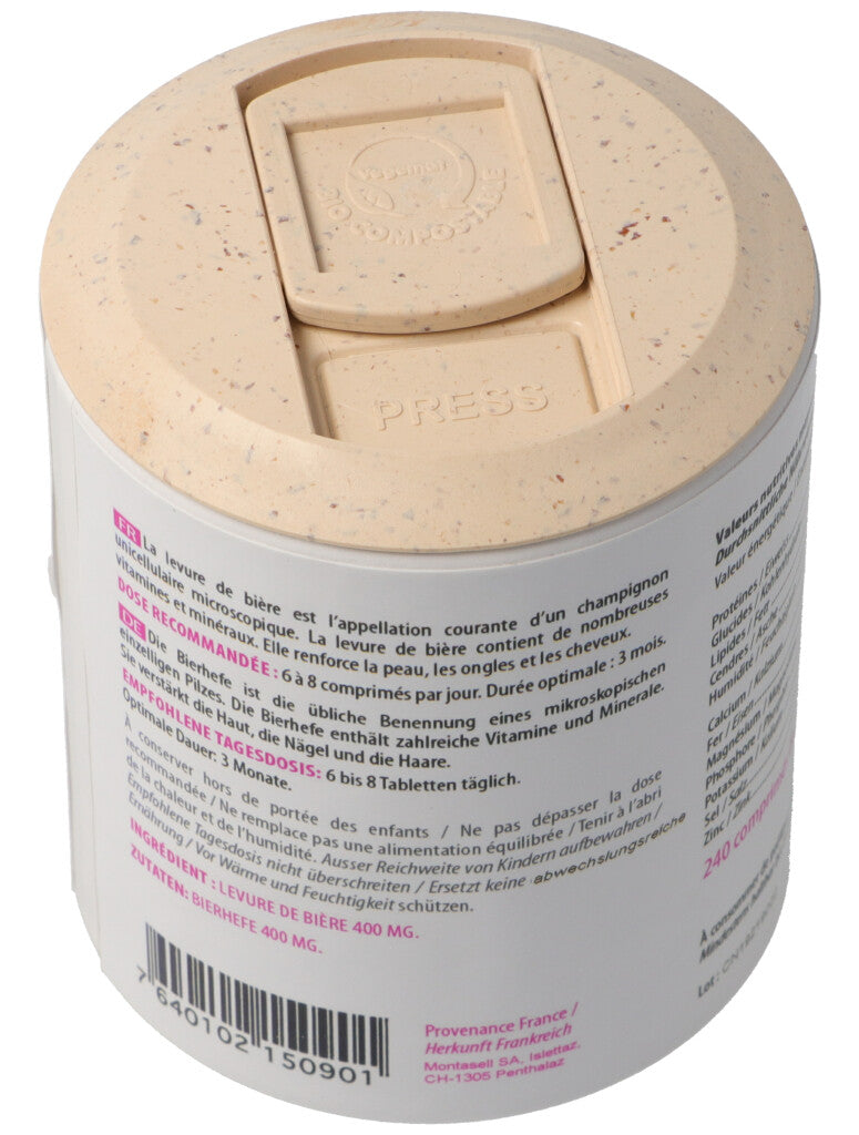 Die Bierhefe ist die übliche Benennung eines mikroskopischen einzelligen Pilzes. Die Bierhefeenthält zahlreiche Vitamine und Minerale. Sie verstärkt die Haut, die Nägel und die Haare. Empfohlene Tagesdosis: 6 bis 8 Tabletten täglich. Optimale Dauer: 3 Monate.