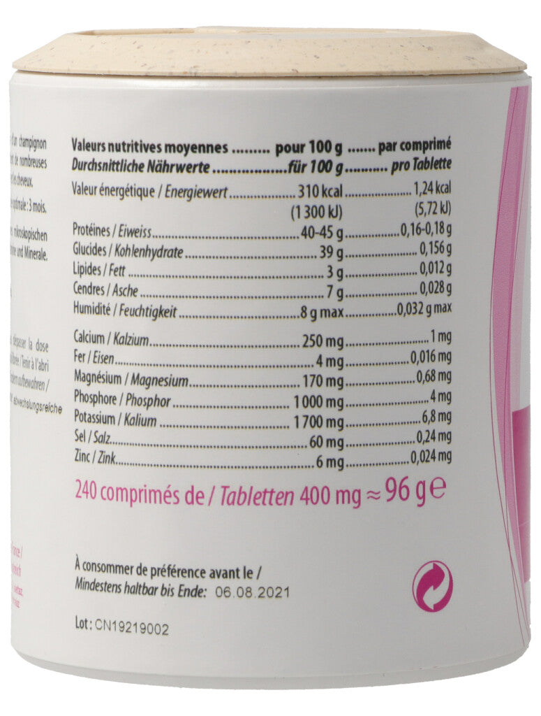 0.028 g Asche, max. 0.032 g Feuchtigkeit, 1 mg Calcium, 0.016 mg Eisen, 0.68 mg Magnesium, 4 mg Phosphor, 6.8 mg Kalium, 0.024 mg Zink, Pro Tablette.