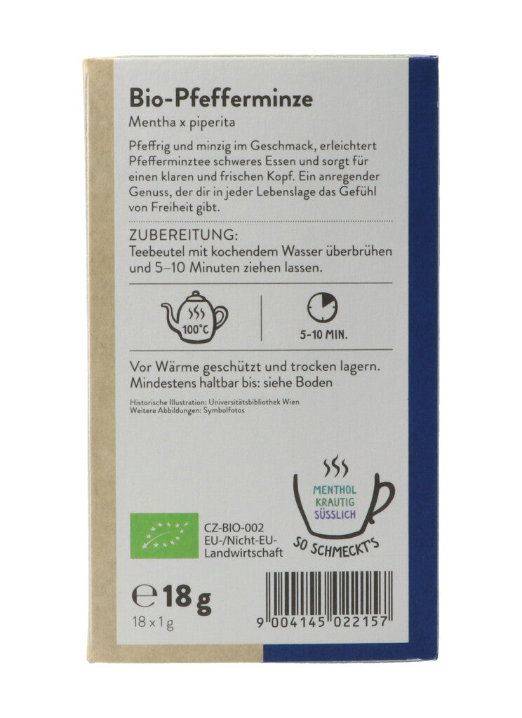 Pfeffrig und minzig im Geschmack, erleichtert Pfefferminztee schweres Essen und sorgt für einen klaren und frischen Kopf. Ein anregender Genuss, der dir in jeder Lebenslage das Gefühl von Freiheit gibt.