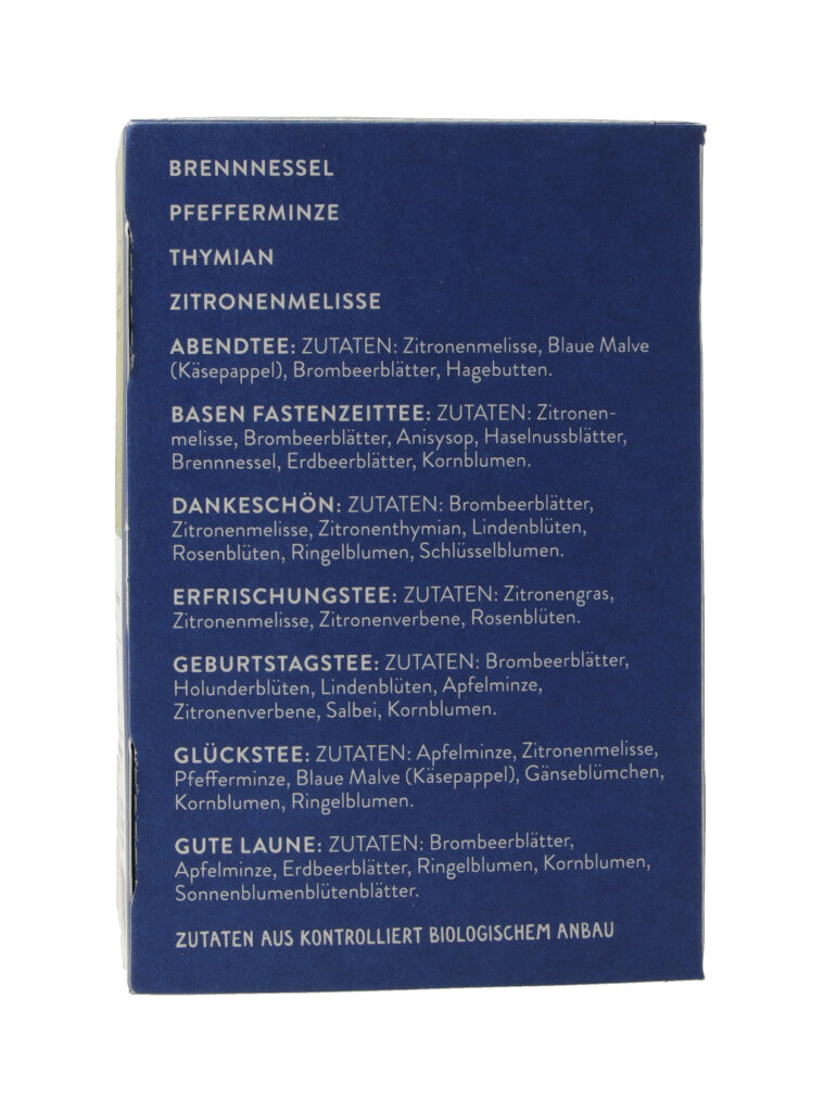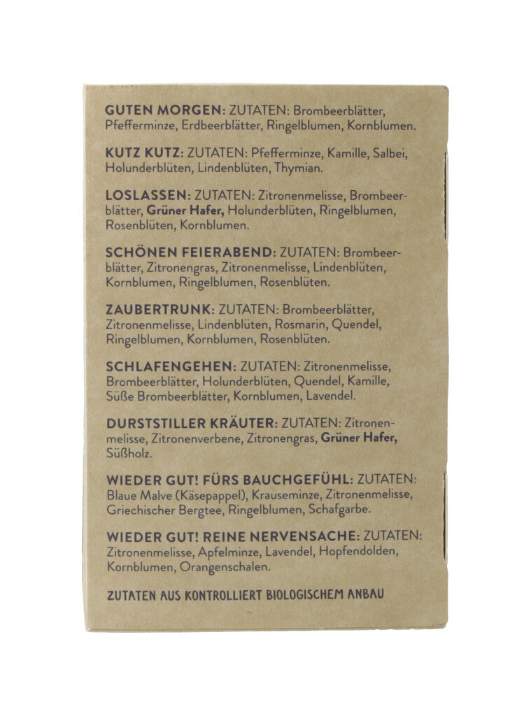 BRENNNESSEL PFEFFERMINZE THYMIAN ZITRONENMELISSE ABENDTEE: Zutaten: Zitronenmelisse, Blaue Malve (Käsepappel), Brombeerblätter, Hagebutten. BASEN FASTENZEITTEE: Zutaten: Zitronen- melisse, Brombeerblätter, Anisysop, Haselnussblätter, Brennnessel, Erdbeerblätter, Kornblumen. DANKESCHÖN: Zutaten: Brombeerblätter, Zitronenmelisse, Zitronenthymian, Lindenblüten, Rosenblüten, Ringelblumen, Schlüsselblumen. ERFRISCHUNGSTEE: Zutaten: Zitronengras, Zitronenmelisse, Zitronenverbene, Rosenblüten. GEBURTSTAGSTEE: Zutaten: Brombeerblätter, Holunderblüten, Lindenblüten, Apfelminze, Zitronenverbene, Salbei, Kornblumen. GLÜCKSTEE: Zutaten: Apfelminze, Zitronenmelisse, Pfefferminze, Blaue Malve (Käsepappel), Gänseblümchen, Kornblumen, Ringelblumen. GUTE LAUNE: Zutaten: Brombeerblätter, Apfelminze, Erdbeerblätter, Ringelblumen, Kornblumen, Sonnenblumenblütenblätter. GUTEN MORGEN: Zutaten: Brombeerblätter, Pfefferminze, Erdbeerblätter, Ringelblumen, Kornblumen. KUTZ KUTZ: Zutaten: Pfefferminze, Kamille, Salbei, Holunderblüten, Lindenblüten, Thymian. LOSLASSEN: Zutaten: Zitronenmelisse, Brombeer- blätter, Grüner Hafer, Holunderblüten, Ringelblumen, Rosenblüten, Kornblumen. SCHÖNEN FEIERABEND: Zutaten: Brombeer- blätter, Zitronengras, Zitronenmelisse, Lindenblüten, Kornblumen, Ringelblumen, Rosenblüten. ZAUBERTRUNK: Zutaten: Brombeerblätter, Zitronenmelisse, Lindenblüten, Rosmarin, Quendel, Ringelblumen, Kornblumen, Rosenblüten. SCHLAFENGEHEN: Zutaten: Zitronenmelisse, Brombeerblätter, Holunderblüten, Quendel, Kamille, Süße Brombeerblätter, Kornblumen, Lavendel. DURSTSTILLER KRÄUTER: Zutaten: Zitronen- melisse, Zitronenverbene, Zitronengras, Grüner Hafer, Süßholz. WIEDER GUT! FÜRS BAUCHGEFÜHL: Zutaten: Blaue Malve (Käsepappel), Krauseminze, Zitronenmelisse, Griechischer Bergtee, Ringelblumen, Schafgarbe. WIEDER GUT! REINE NERVENSACHE: Zutaten: Zitronenmelisse, Apfelminze, Lavendel, Hopfendolden, Kornblumen, Orangenschalen. Aus kontrolliert biologischem Anbau. .