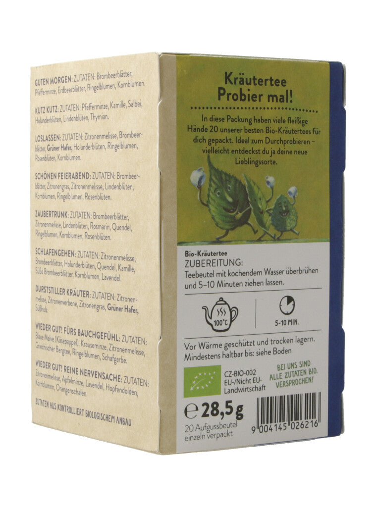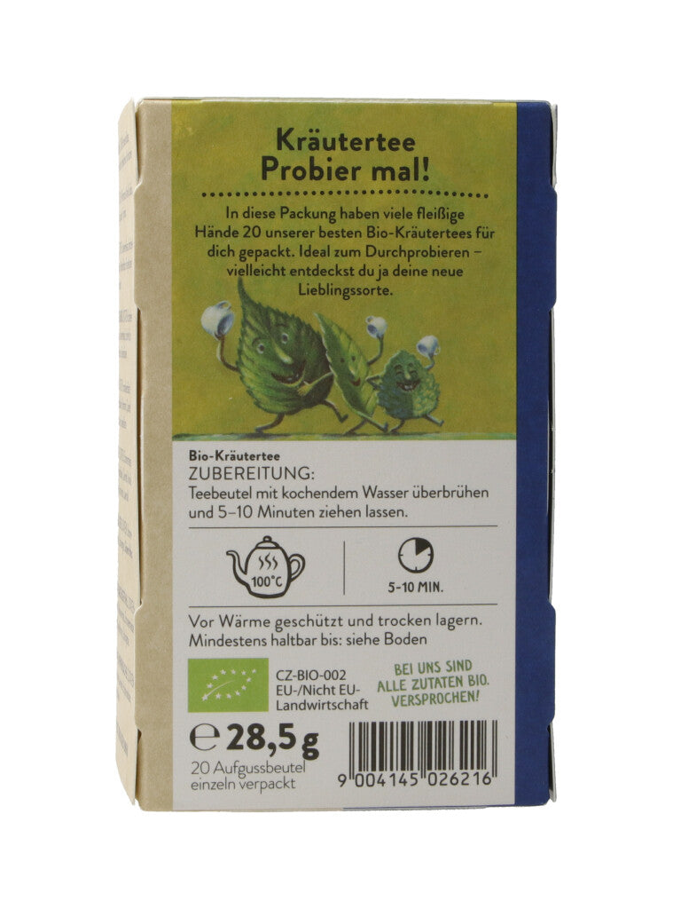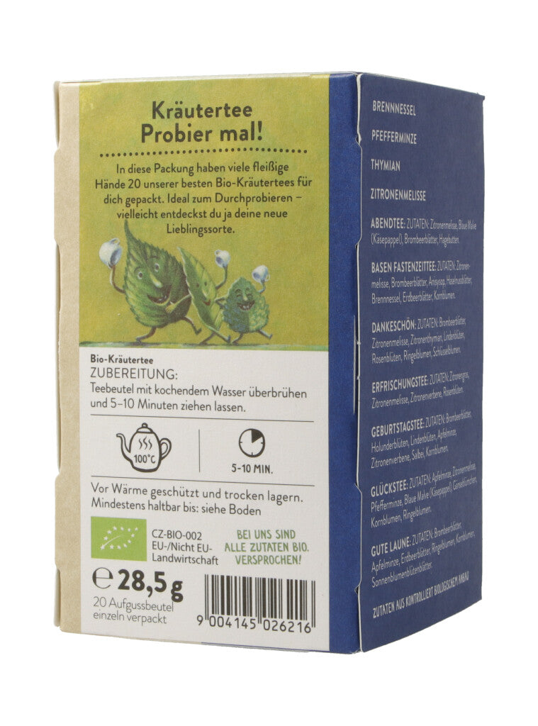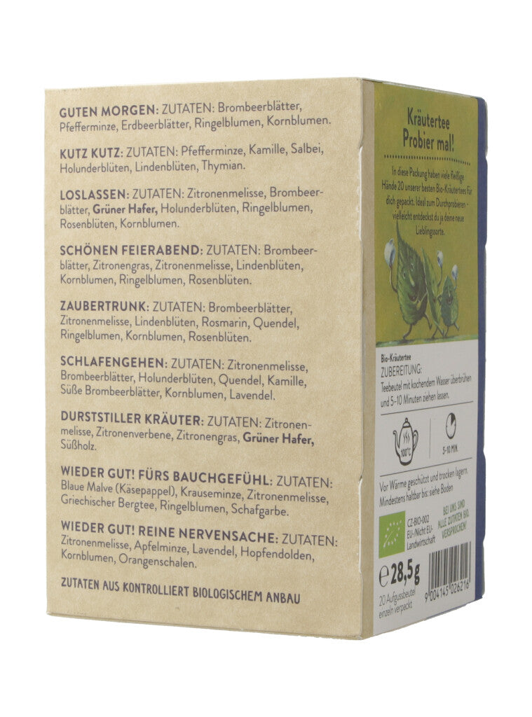 In diese Packung haben viele fleissige Hände 20 unserer besten Bio-Kräutertees für dich gepackt. Ideal zum Durchprobieren - vielleicht entdeckst du ja deine neue Liebligssorte.