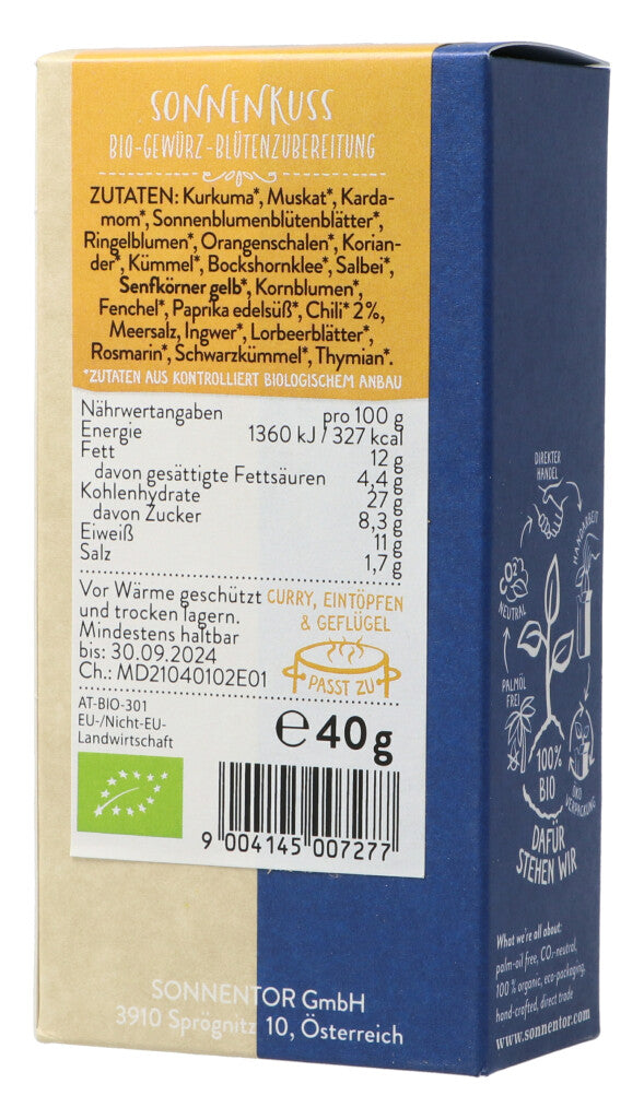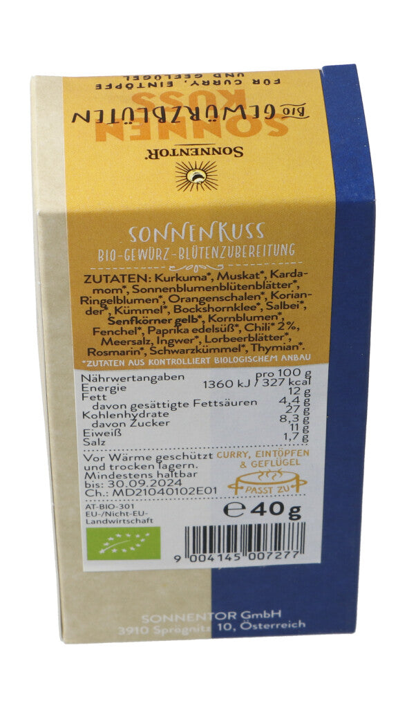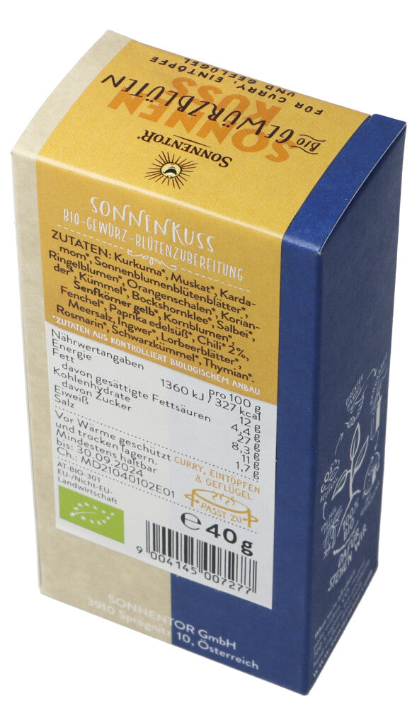 Zutaten: Kurkuma bio, Muskat gemahlen bio, Kardamom bio, Sonnenblumen-blütenblätter bio, Senfkörner Gelb bio, Salbei bio, Kornblumen blau bio, Fenchel bio, Paprika edelsüss bio, Chili gemahlen bio, Meersalz, Ingwerstücke bio, Lorbeerblätter bio, Rosmarin bio, Schwarzkümmel bio, Thymian bio