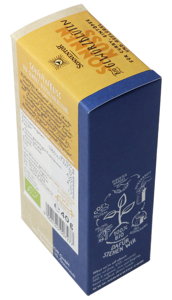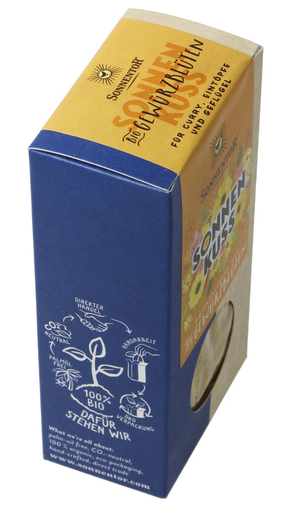Ein Kuss und gutes Essen sind die schönsten zwei Arten, um deine Liebsten zum Schweigen zu bringen. Diese leuchtend gelbe Mischung vereint beides. Orientalische Gewürze küssen Curry, Eintöpfe und Suppen wach und bunte Blüten sorgen für intensive Farbe am Teller. Ein Bussi für Köchin und Koch gibt’s obendrauf.