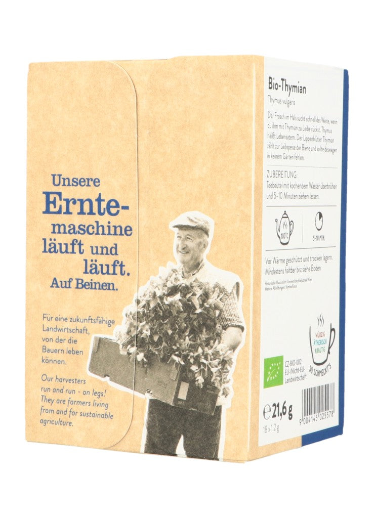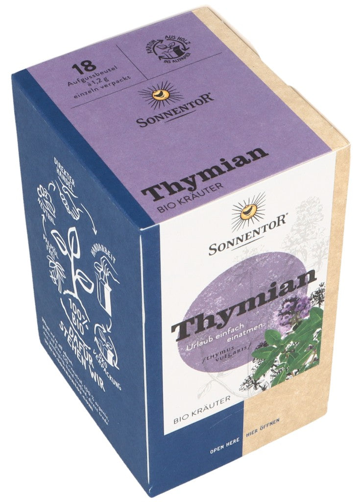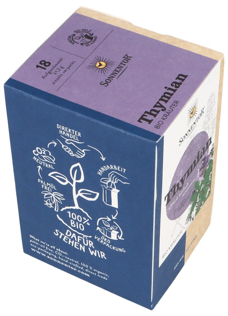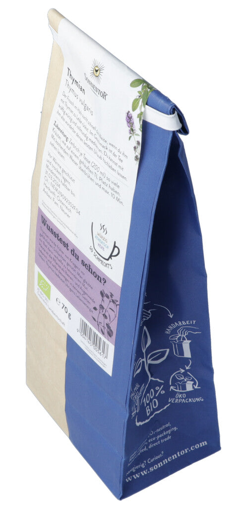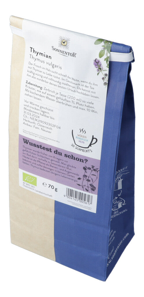 Der Frosch im Hals sucht schnell das Weite, wenn du ihm mit Thymian zu Leibe rückst. Im Geschmack ist der Tee kräftig und vollmundig mediterran. Thymian wurde früher von Kriegern vor gefährlichen Schlachten genutzt: Ein Bad darin sollte ihnen zu besonderem Mut verhelfen. Heute ist die Pflanze als Bienen- und Augenweide bekannt und sollte deswegen in keinem Garten fehlen. Thymus bedeutet übrigens Lebensenergie.