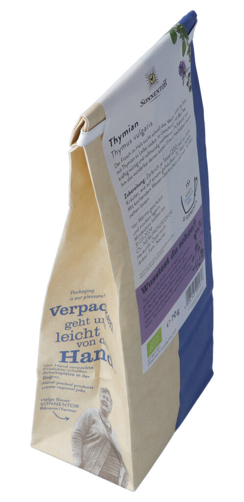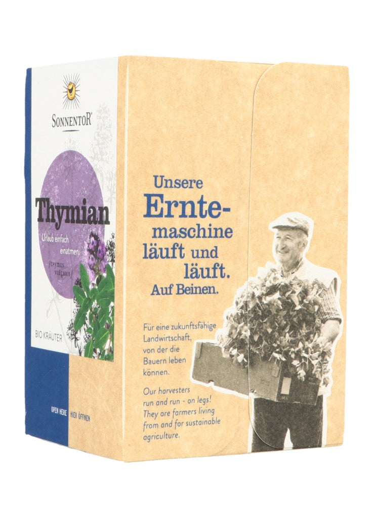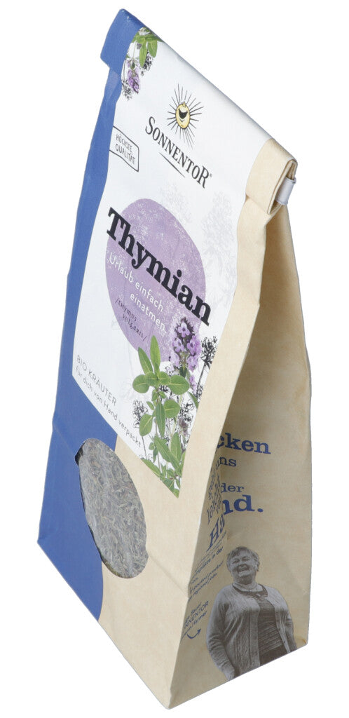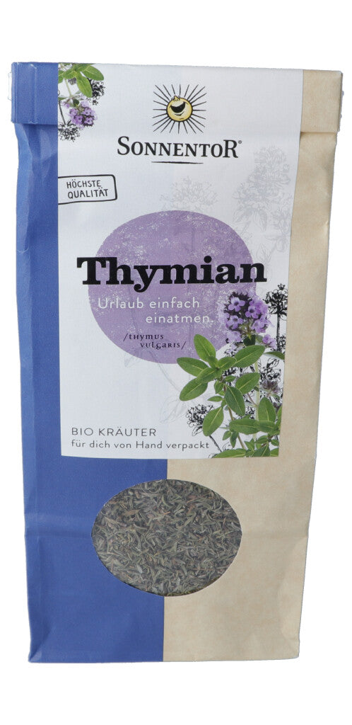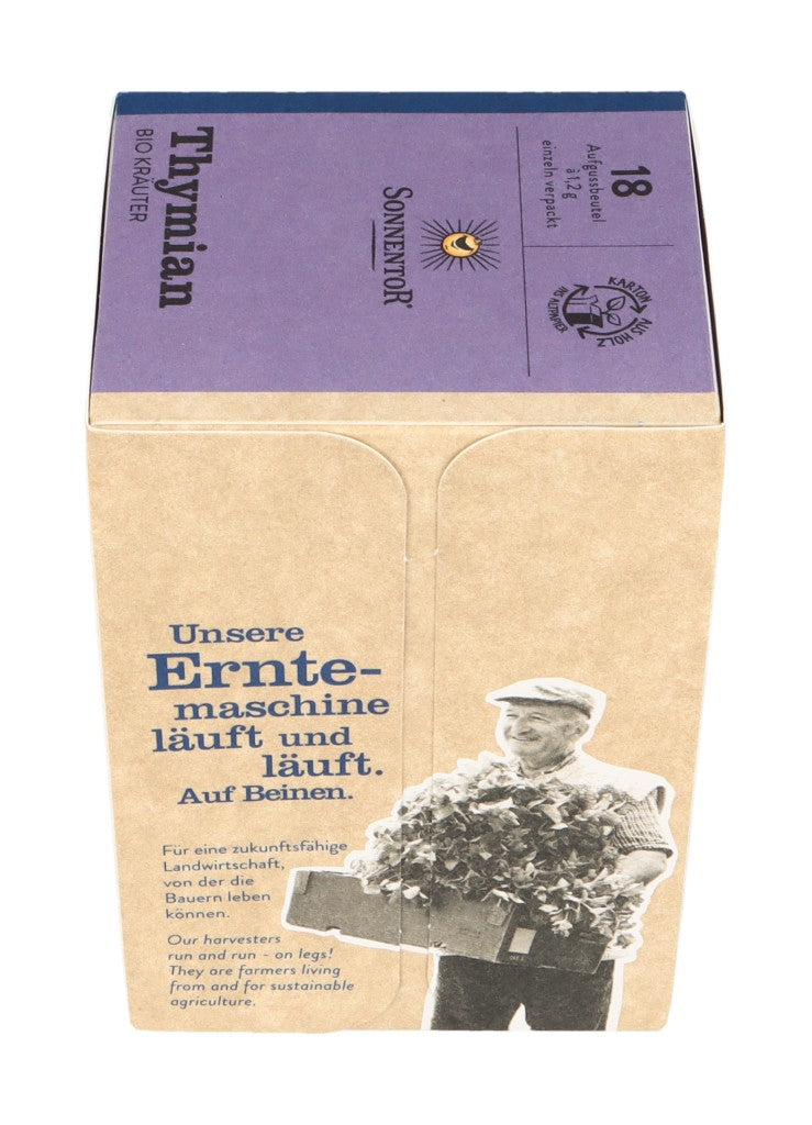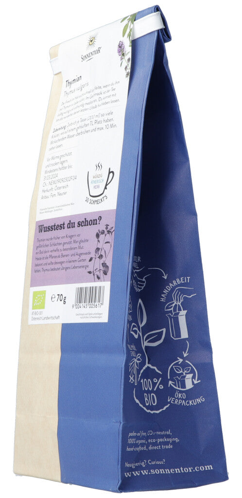 Der Frosch im Hals sucht schnell das Weite, wenn du ihm mit Thymian zu Leibe rückst. Im Geschmack ist der Tee kräftig und vollmundig mediterran. Thymian wurde früher von Kriegern vor gefährlichen Schlachten genutzt: Ein Bad darin sollte ihnen zu besonderem Mut verhelfen. Heute ist die Pflanze als Bienen- und Augenweide bekannt und sollte deswegen in keinem Garten fehlen. Thymus bedeutet übrigens Lebensenergie.