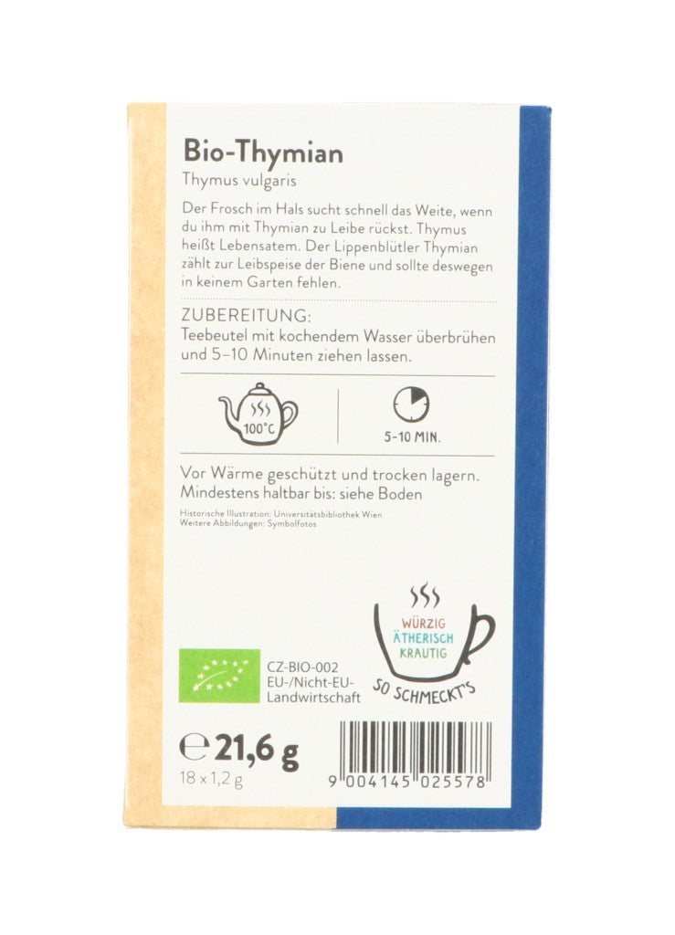 Der Frosch im Hals sucht schnell das Weite, wenn du ihm mit Thymian zu Leibe rückst. Im Geschmack ist der Tee kräftig und vollmundig mediterran. Thymian wurde früher von Kriegern vor gefährlichen Schlachten genutzt: Ein Bad darin sollte ihnen zu besonderem Mut verhelfen. Heute ist die Pflanze als Bienen- und Augenweide bekannt und sollte deswegen in keinem Garten fehlen. Thymus bedeutet übrigens Lebensenergie.