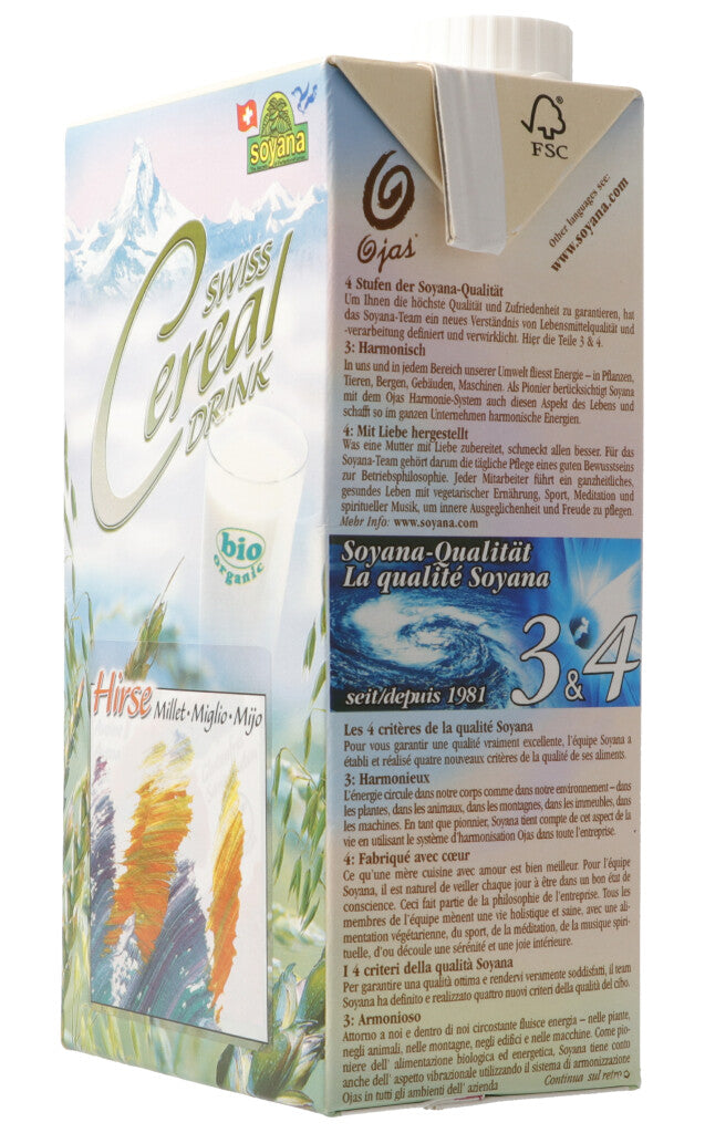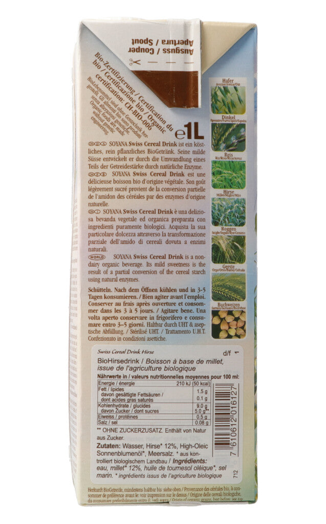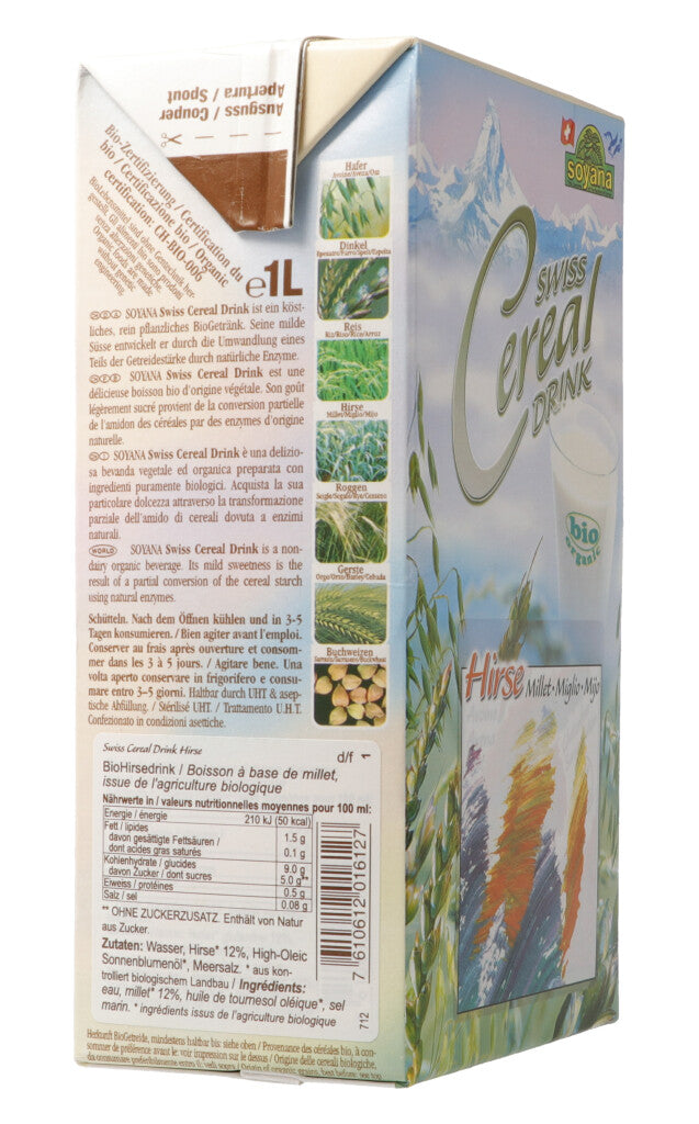 Soyana Swiss Cereal Hirse Drink Bio ist ein köstliches, rein pflanzliches Bio-Getränk. Seine milde Süsse entwickelt er durch die Umwandlung eines Teils der Getreidestärke durch natürliche Enzyme.