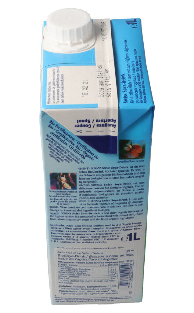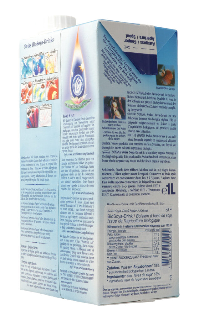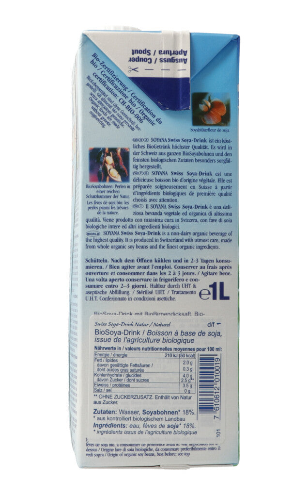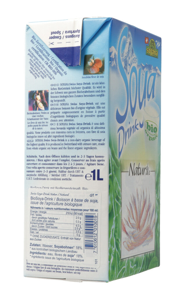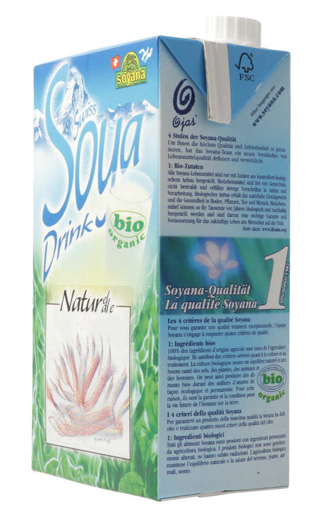 Soyana Swiss Sojadrink Natur Bio ist ein köstliches Bio-Getränk höchster Qualität. Es wird in der Schweiz aus ganzen Bio-Soyabohnen und den feinsten biologischen Zutaten besonders sorgfältig hergestellt.