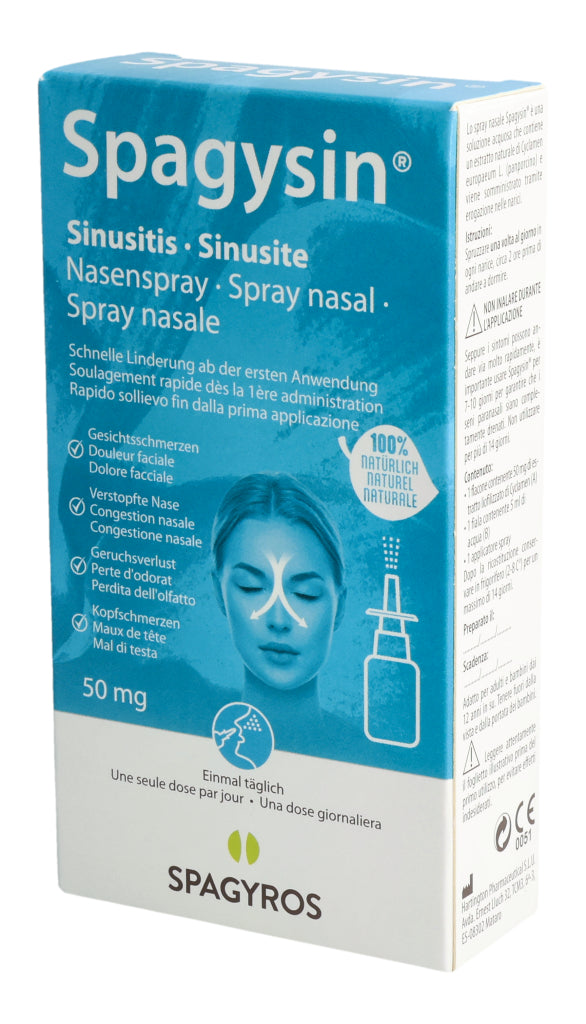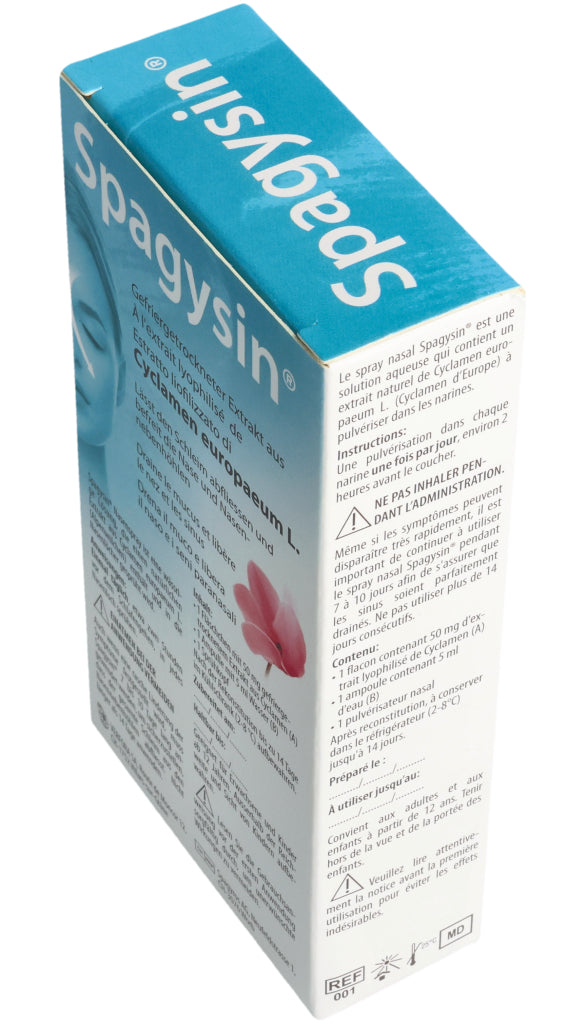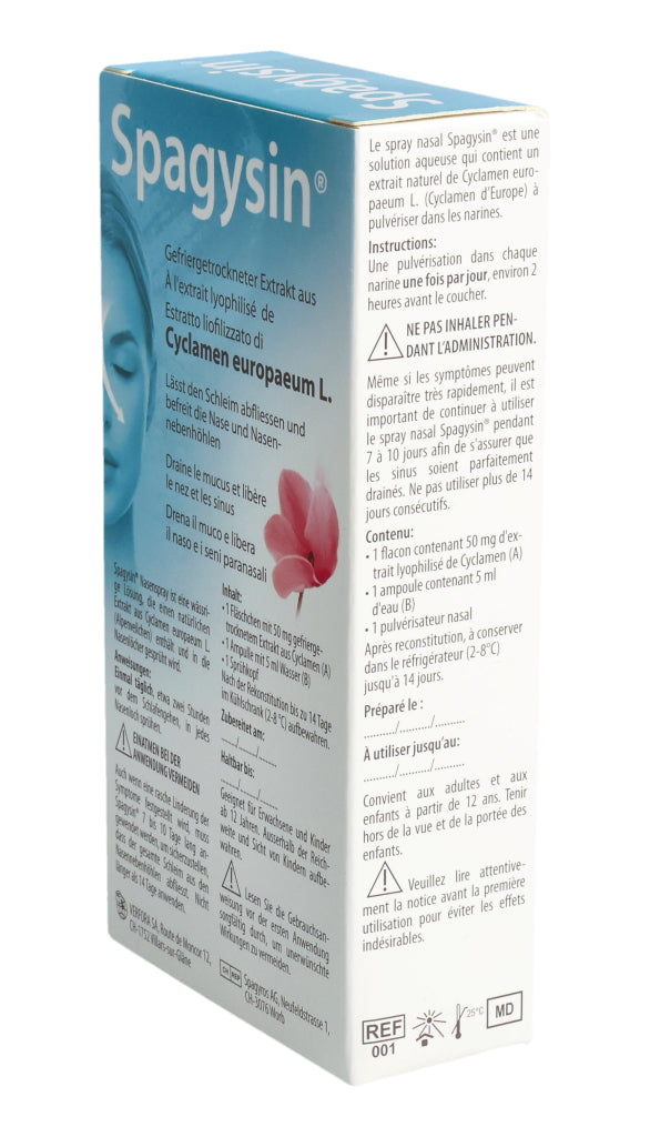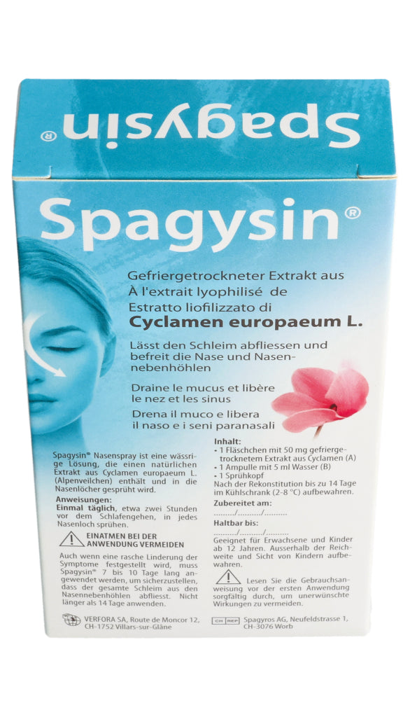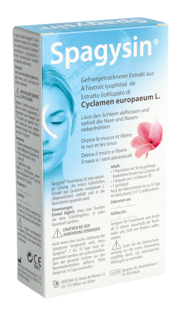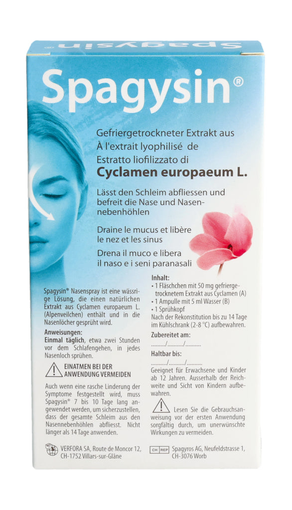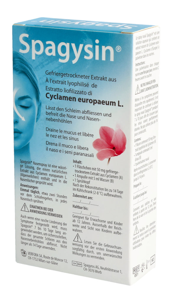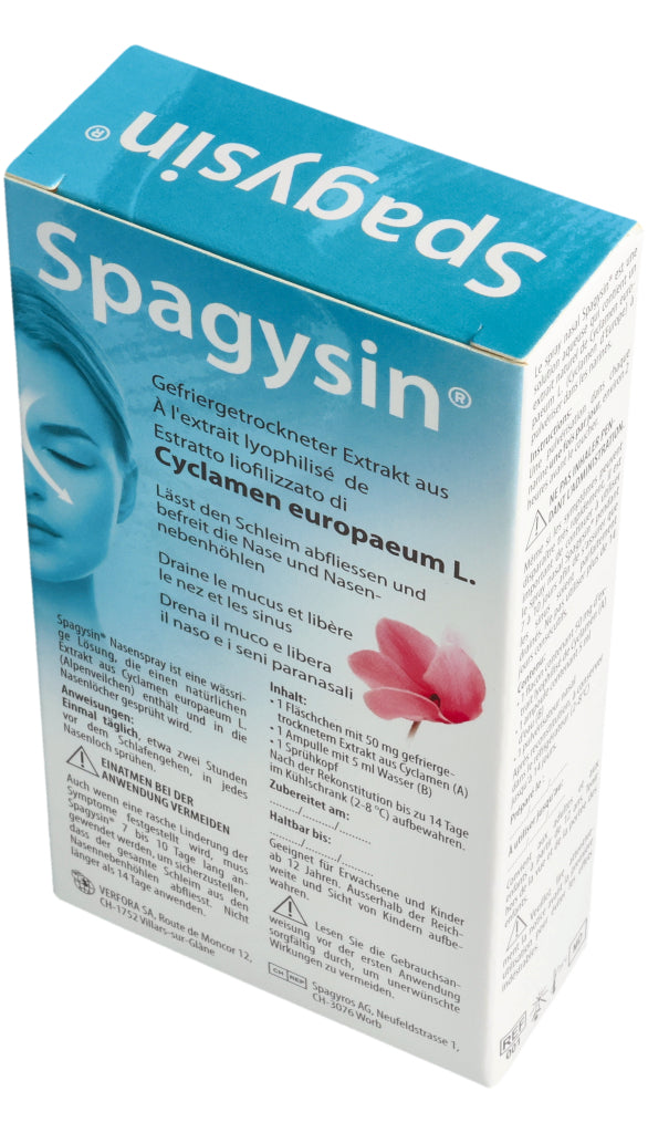 Spagysin® Nasenspray ist eine wässrige Lösung, die einen natürlichen Extrakt aus Cyclamen europaeum L. (Alpenveilchen) enthält und in die Nasenlöcher gesprüht wird.