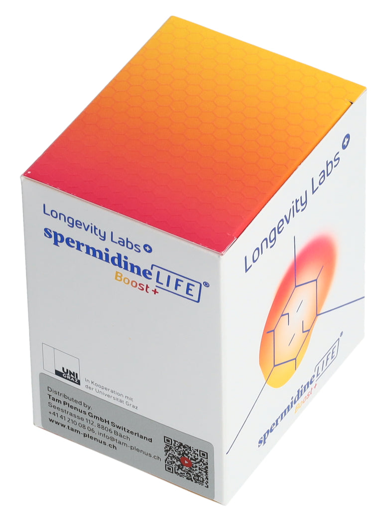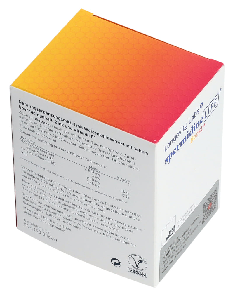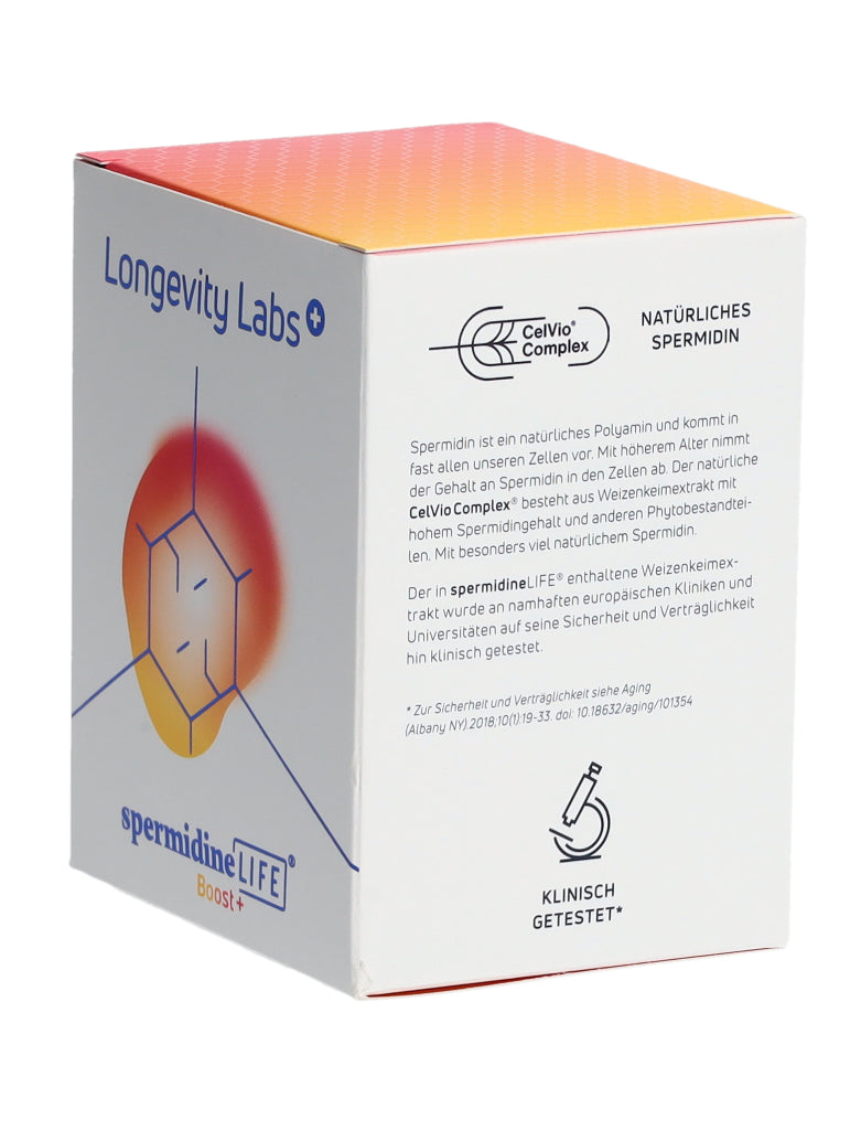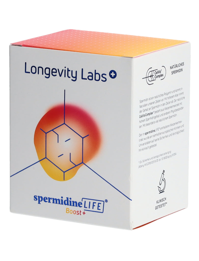 Erhaltungsdosis mit 3 mg natürlichem Spermidin. Der extra Energieschub für beanspruchte Zellen. In stressigen Lebensphasen oder mit zunehmendem Alter braucht der Körper oft mehr Unterstützung. Deshalb ist in spermidineLIFE Boost+ die Menge an Spermidin mit 3 mg pro Tagesdosis höher. Die spermidineLIFE Boost+ Sachets eignen sich als Erhaltungsdosis, für die tägliche Einnahme. Die Sachets enthalten einen speziellen innovativen CelVio® Complex, welcher die natürliche Zellreinigung (Autophagie) der Körperzelle unterstützt. Der CelVio® Complex besteht aus einem Weizenkeimextrakt mit hohem Spermidingehalt und anderen Phytobestandteilen.