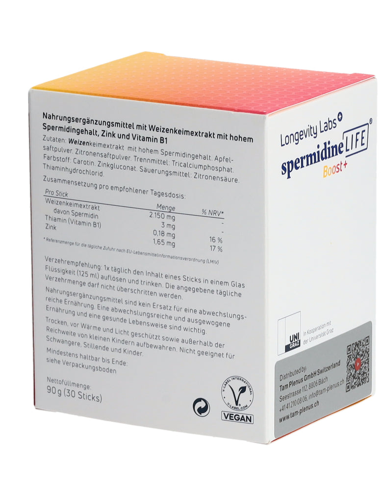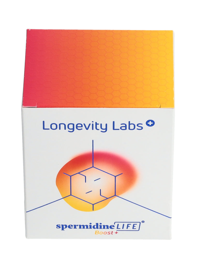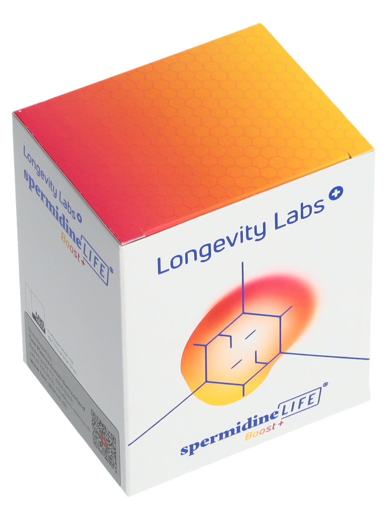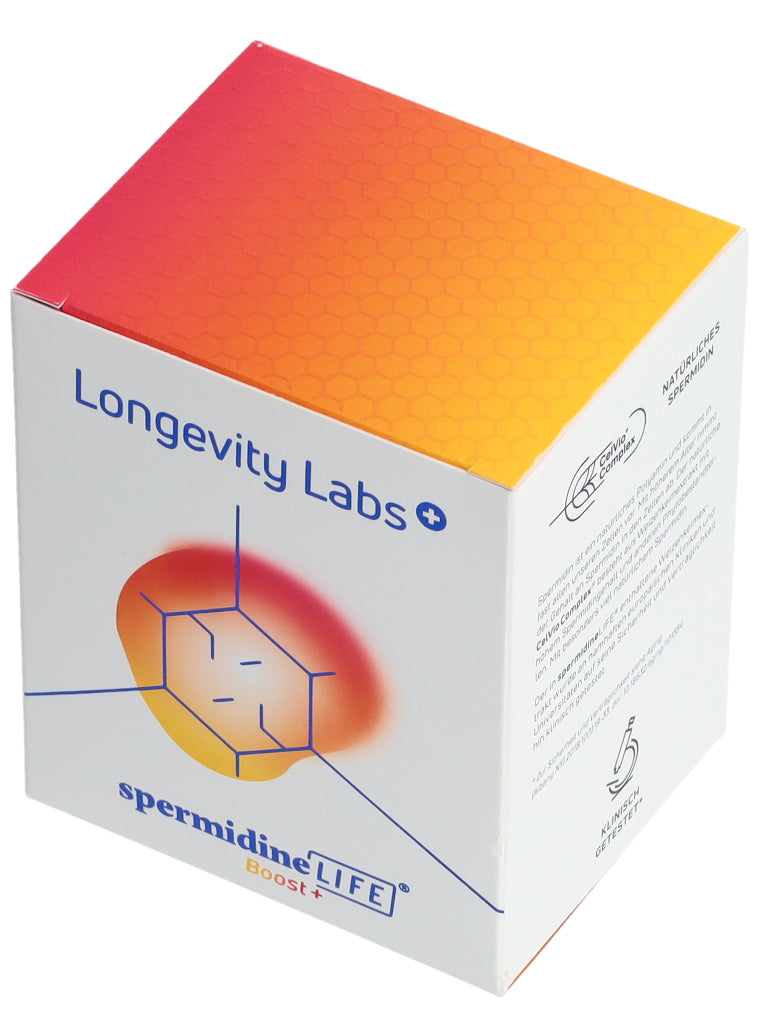 Erhaltungsdosis mit 3 mg natürlichem Spermidin. Der extra Energieschub für beanspruchte Zellen. In stressigen Lebensphasen oder mit zunehmendem Alter braucht der Körper oft mehr Unterstützung. Deshalb ist in spermidineLIFE Boost+ die Menge an Spermidin mit 3 mg pro Tagesdosis höher. Die spermidineLIFE Boost+ Sachets eignen sich als Erhaltungsdosis, für die tägliche Einnahme. Die Sachets enthalten einen speziellen innovativen CelVio® Complex, welcher die natürliche Zellreinigung (Autophagie) der Körperzelle unterstützt. Der CelVio® Complex besteht aus einem Weizenkeimextrakt mit hohem Spermidingehalt und anderen Phytobestandteilen.