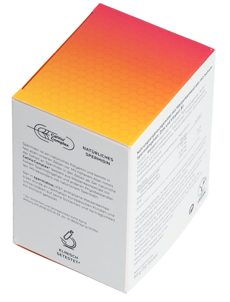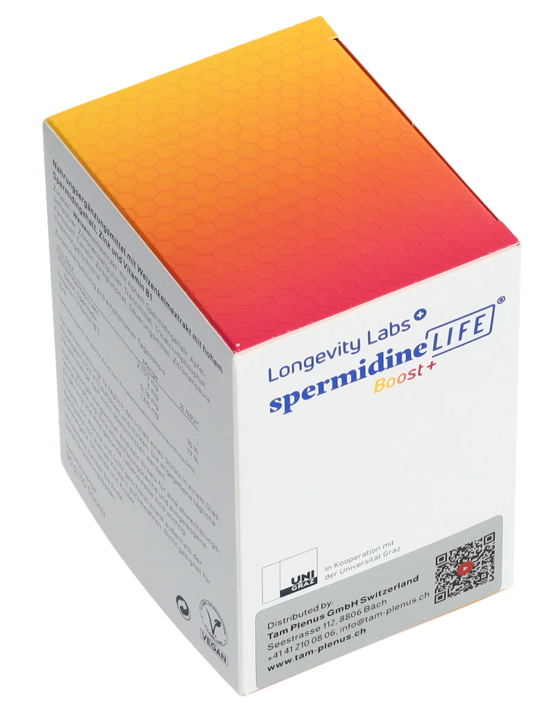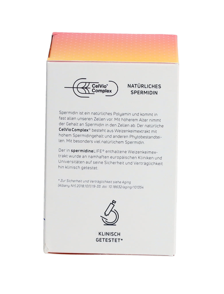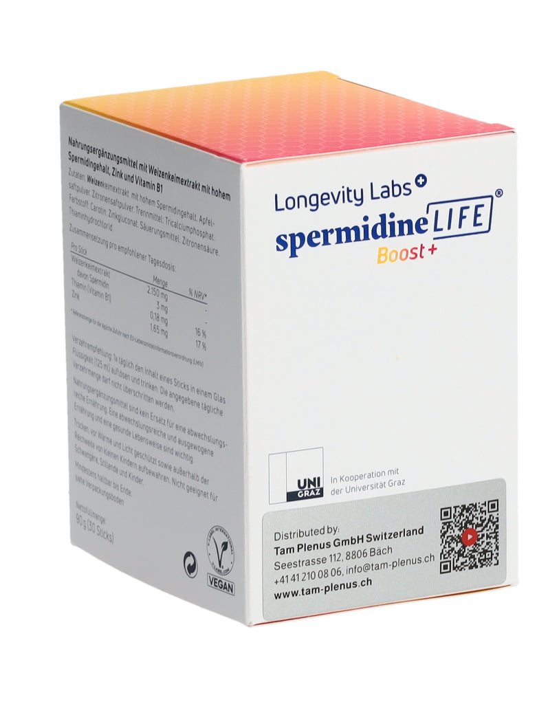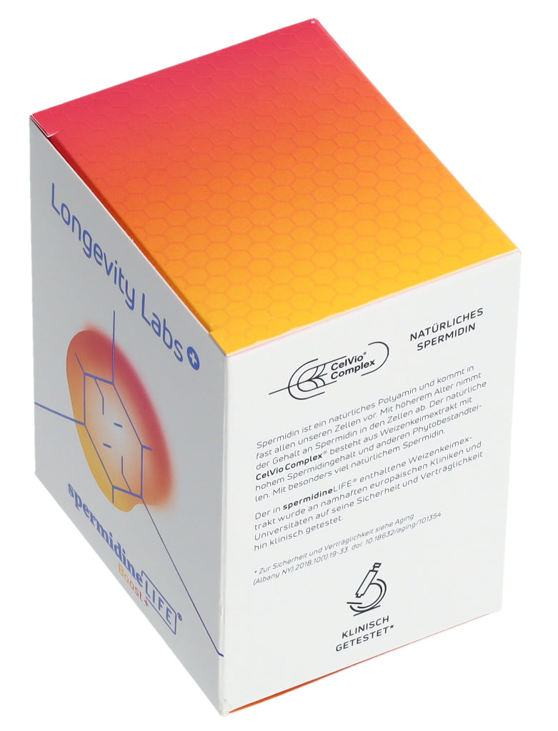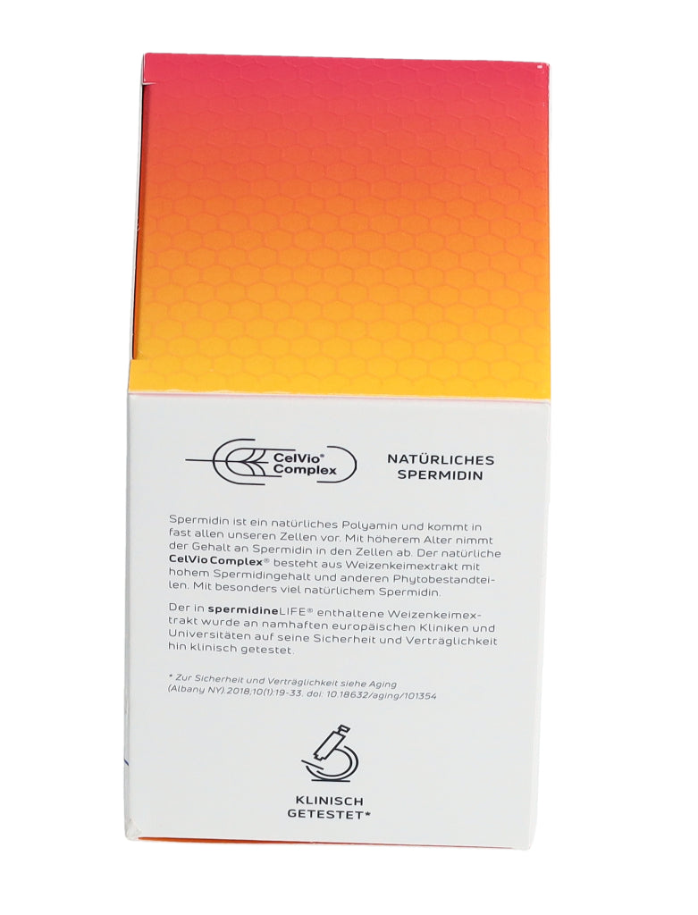 Spermidin ist ein natürliches Polyamin, das als Botenstoff in jeder Körperzelle vorkommt. Es ist eine Verbindung aus Aminosäuren und sehr eng mit dem Zellwachstum verbunden. Eine seiner wesentlichen Funktionen im Zellstoffwechsel ist das «Einschalten» der zellulären Reinigungsprozesse, genannt Autophagie. Autophagie ist eine Art Recycling-Anlage der menschlichen Zellen. Bei diesem Selbstreinigungsprozess werden fehlerhafte oder nicht mehr benötigte Zellbestandteile abgebaut, verwertet und wieder in Zellenergie umgewandelt. Weil die Autophagie im Alter an Effizienz verliert, kommt es zu krankheitsrelevanten Ablagerungen in den Zellen, die wiederum zu Demenz, Diabetes, Tumoren und Atherosklerose führen können. Die vermehrte Aufnahme von Spermidin signalisiert den Zellen, die Selbstreinigungsprozesse zu starten und schützt damit vor Ablagerungen, vorzeitiger Alterung sowie altersbedingten, degenerativen Krankheiten. Der in spermidineLIFE enthaltene Weizenkeimextrakt wurde an namhaften europäischen Instituten und Universitäten auf seine Sicherheit und Verträglichkeit getestet und hat eine Novel Food Zulassung.
