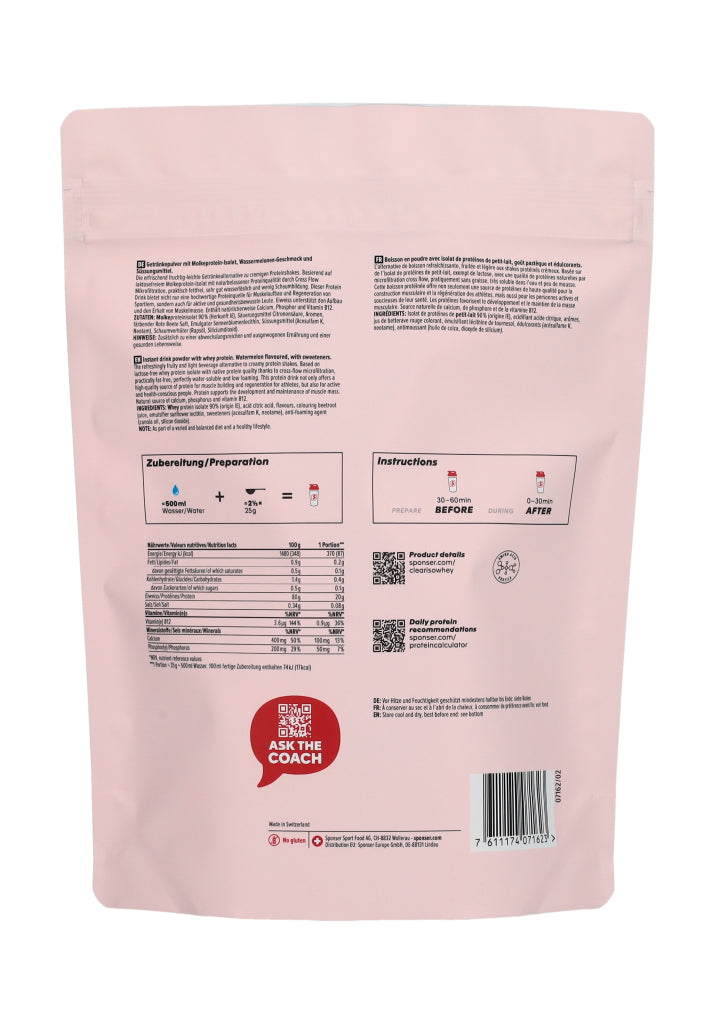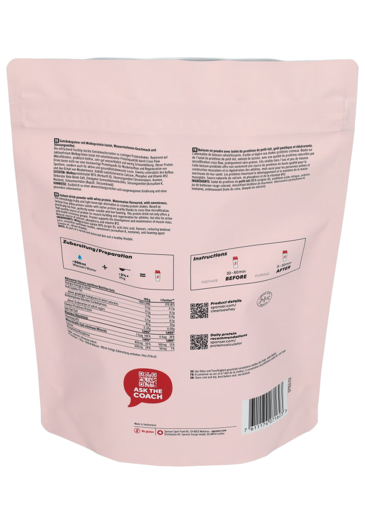 Getränkepulver mit Molkeprotein-Isolat, Wassermelonen-Geschmack und Süssungsmittel, Laktosearm <0.1%