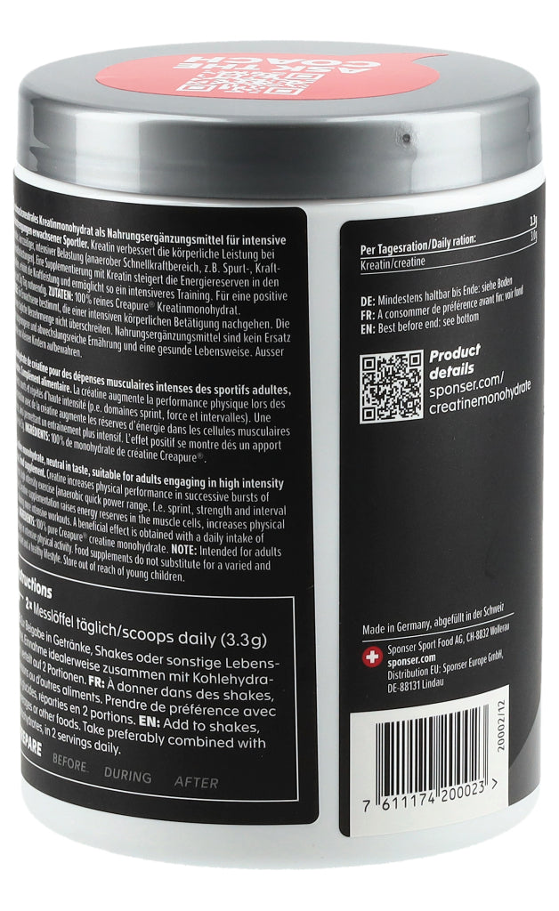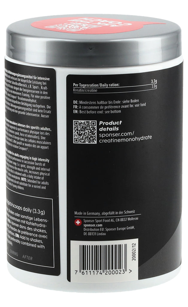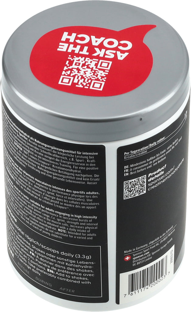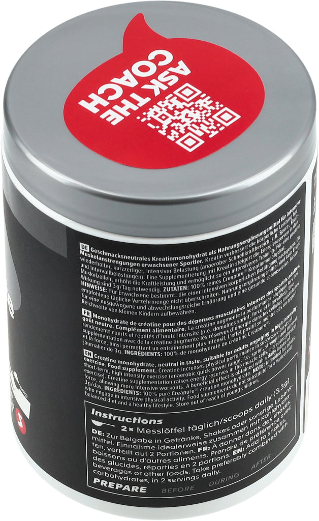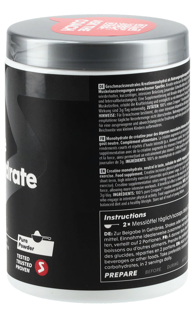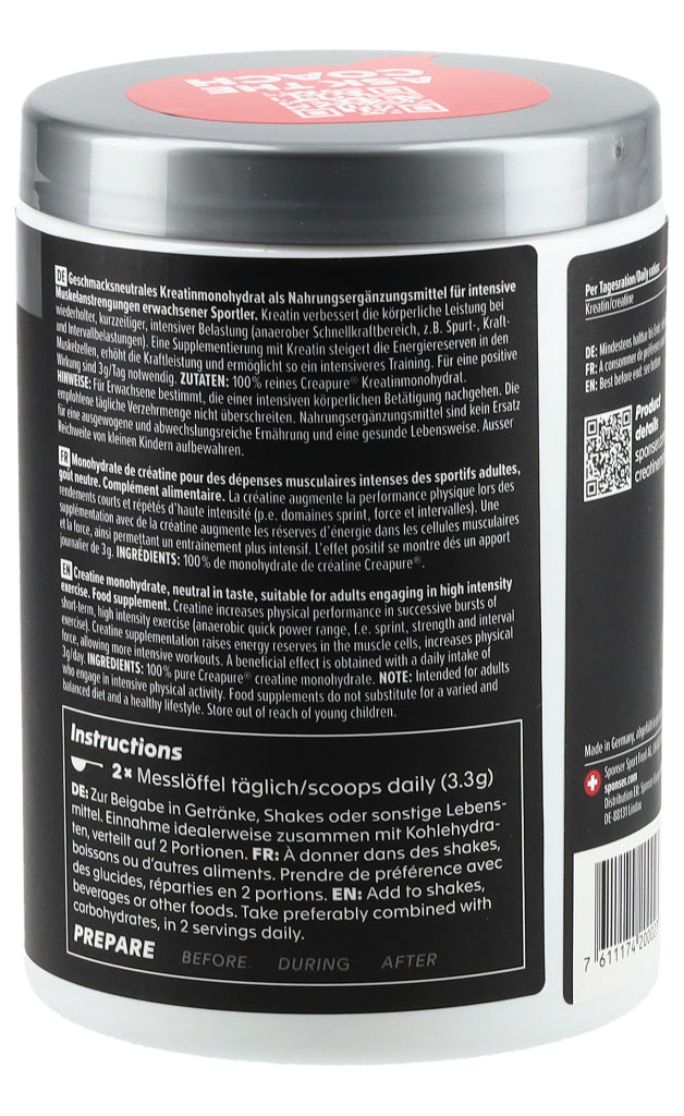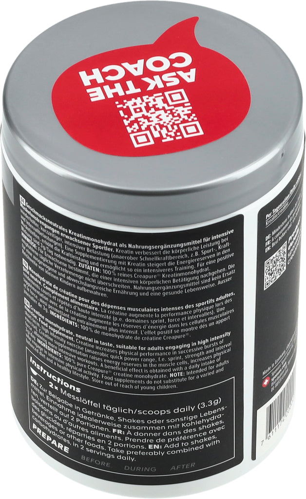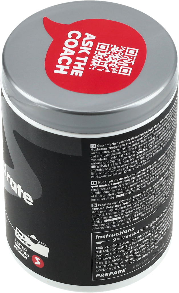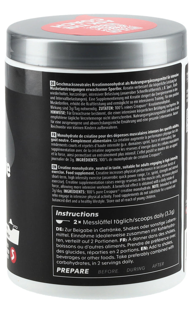Kreatin steigert die körperliche Leistung im Rahmen kurzzeitiger, intensiver körperlicher Belastung (z.B. Sprint, Hanteltraining). Creatine Monohydrat enthält als einzige Zutat reines Kreatin-Monohydrat und ist vollkommen geschmacksneutral.
