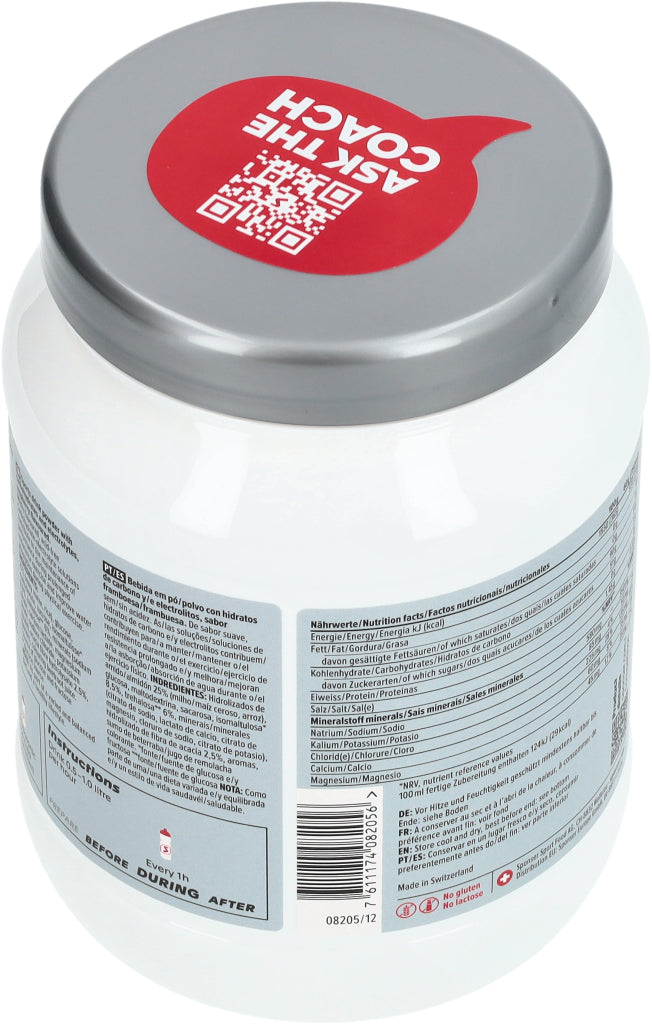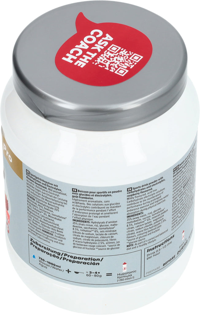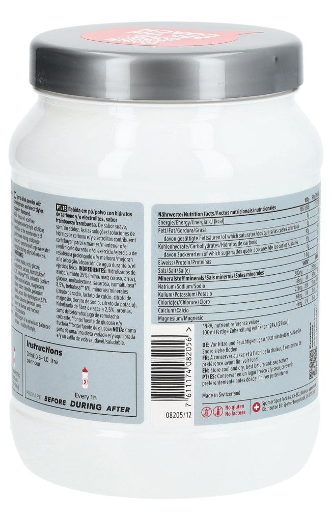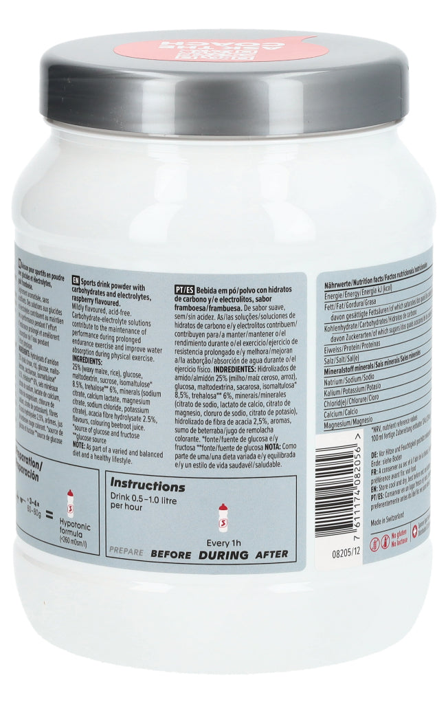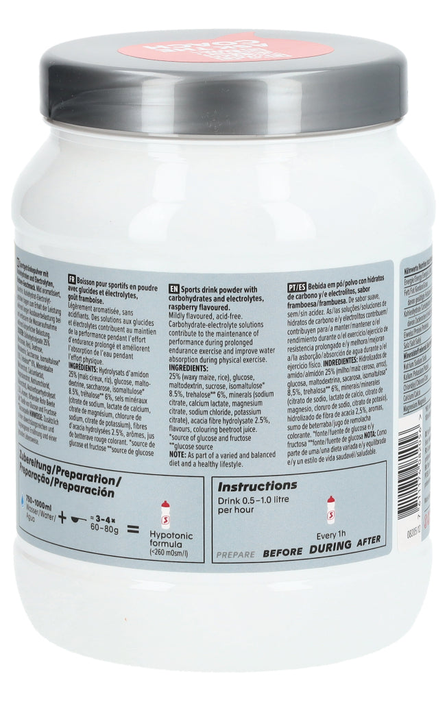 Sportgetränkepulver mit Kohlenhydraten und Electrolyten, Himbeer-Geschmack. Mild aromatisiert, säurefrei. Kohlenhydrat-Electrolytgetränke tragen zum Erhalt der Leistung während langer Ausdauerbelastung bei und verbessern die Wasseraufnahme während körperlicher Belastung.