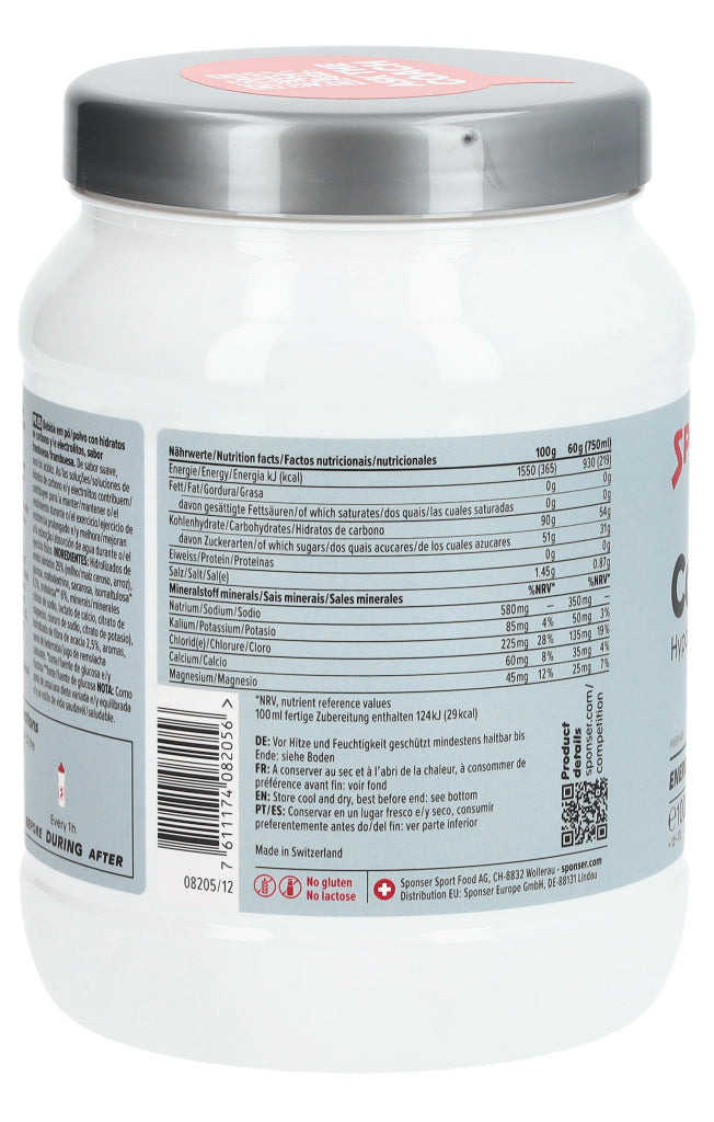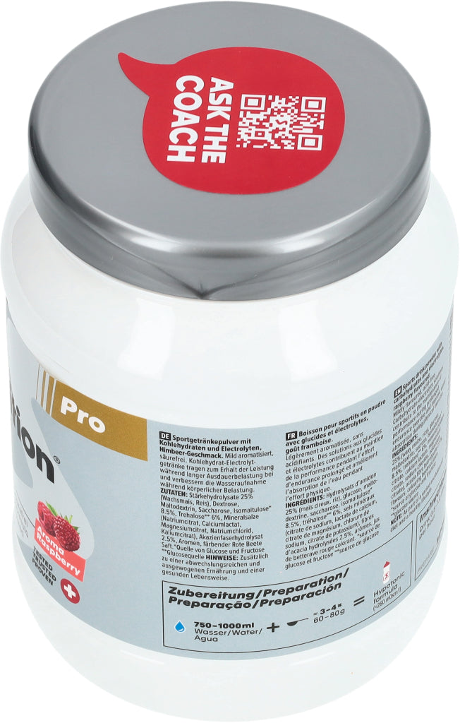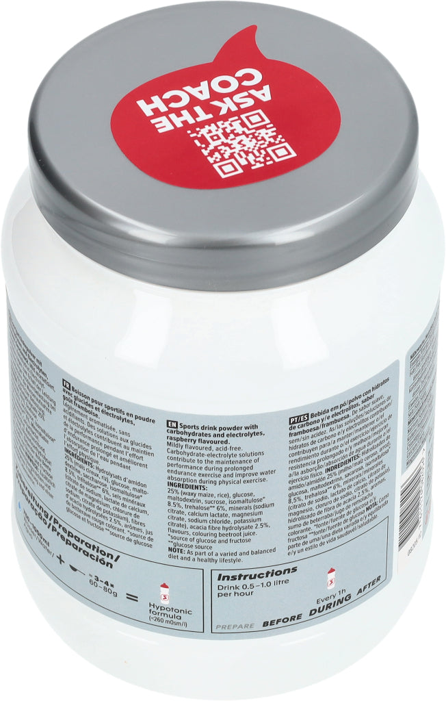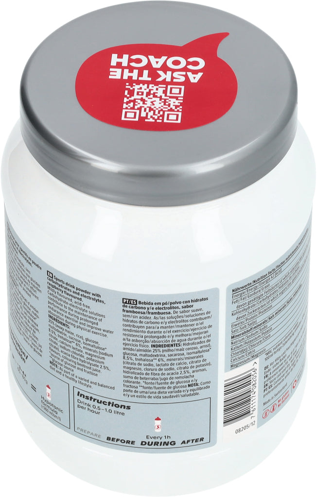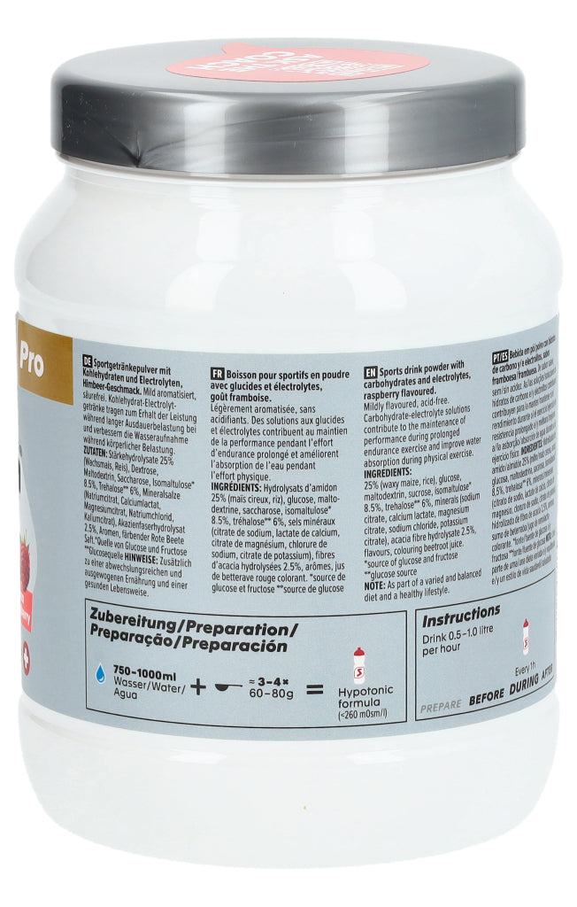 Sportgetränkepulver mit Kohlenhydraten und Electrolyten, Himbeer-Geschmack. Mild aromatisiert, säurefrei. Kohlenhydrat-Electrolytgetränke tragen zum Erhalt der Leistung während langer Ausdauerbelastung bei und verbessern die Wasseraufnahme während körperlicher Belastung.