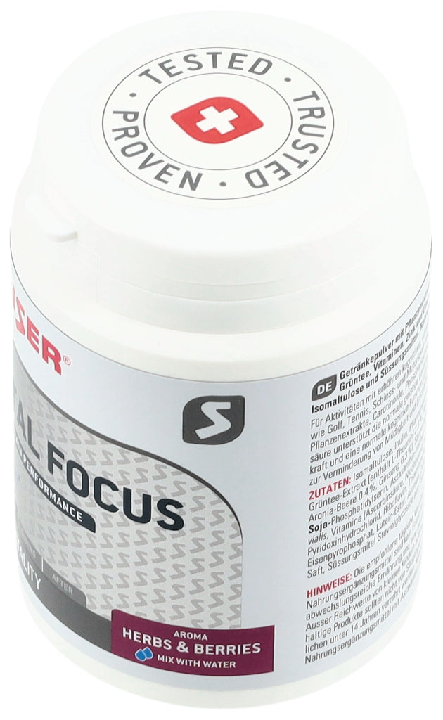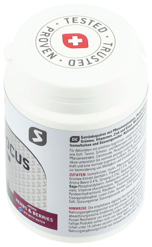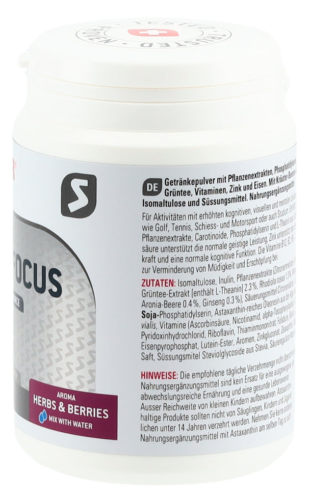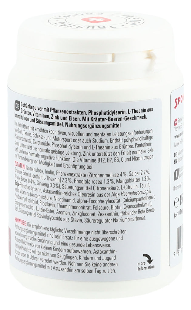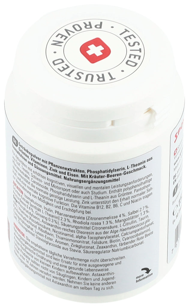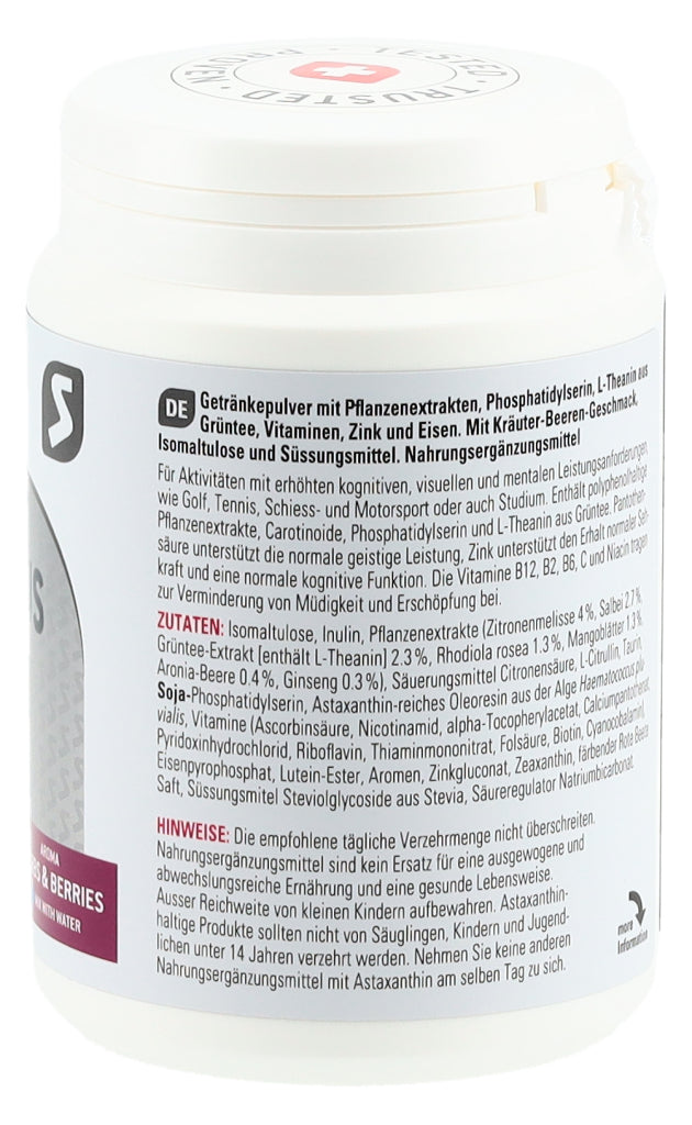Getränkepulver mit Phosphatidylserin, Pflanzenextrakten, L-Theanin aus Grüntee, Vitaminen, Zink und Eisen. Mit Kräuter-Beeren-Geschmack, Isomaltulose und Süssungsmittel.