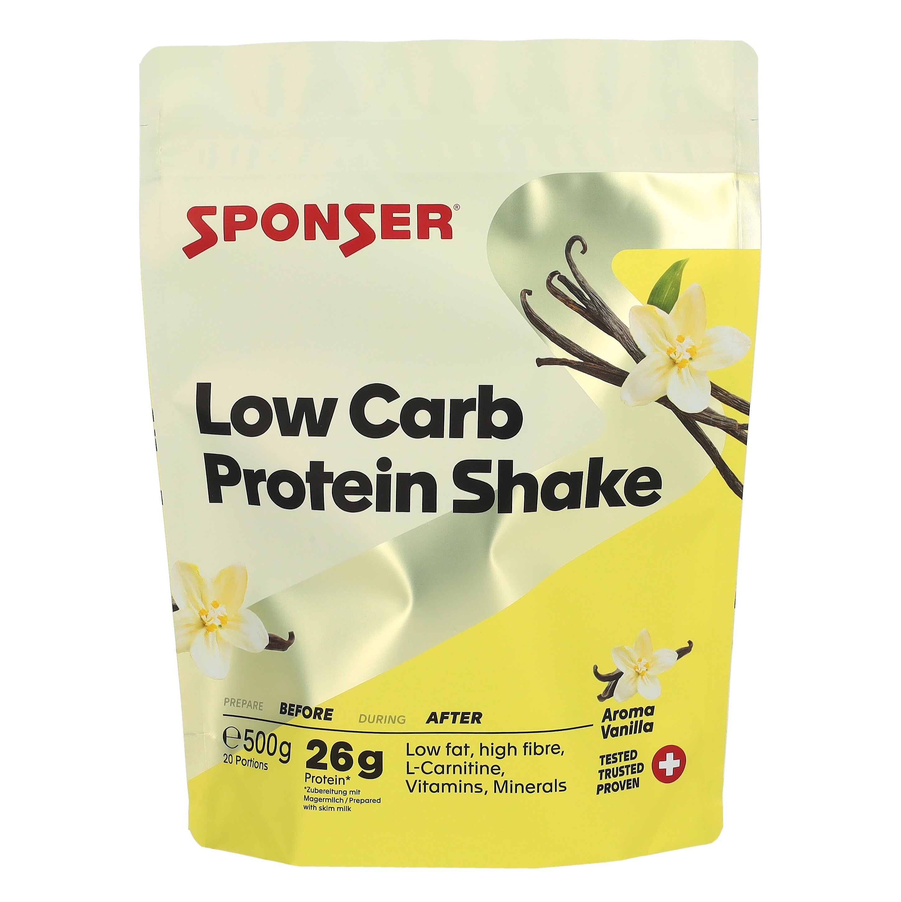 SPONSER® PROTEIN SHAKE - Milchshake mit hoher biologischer Wertigkeit dank Milch- und Eiproteinen. Eiweiss unterstützt den Muskelaufbau und –Erhalt und ist besonders wichtig im Rahmen einer kalorienreduzierten Ernährungsweise. Der Low-Carb-Protein Shake lässt sich in eine gesunde Ernährungsweise mit hochwertigen Proteinen und einem definierten Anteil an komplexen Kohlenhydraten (Low Carb) integrieren. Er ist geeignet als Bestandteil einer Mahlzeit in Kombination mit Obst, Gemüse und Salaten. Angereichert mit L-Carnitin in CarniPure Qualität. Vorteile – Mit 300 mg L-Carnitin pro Portion – 1 Portion (25 g Pulver + 300 ml Mager- oder Drinkmilch) deckt rund ¼ des Tagesbedarfs von 10 ausgewählten Vitaminen – Angereichert mit wertvollen Nahrungsfasern – Bequeme Zubereitung im Shaker anwendung 2-3 x täglich 1 Shake zusammen mit Salat, Gemüse oder Früchten nach Belieben. Dazu zuckerfreie Getränke wie Tee oder Wasser. Zusätzlich zu einer abwechslungsreichen und ausgewogenen Ernährung und einer gesunden Lebensweise. aroma / Gebinde Banana, Vanilla, Chocolate Dose 550 g (22 Portionen) Vanilla Display 20 x 25 g zutaten Proteinpulver 85% (Milcheiweiss, Eialbumin, Molkeprotein-Isolat), Nahrungsfasern 10% (Inulin, Akazie, Fructooligosaccharide, Guar), Aromen, L-Carnitintartrat, Magnesiumcarbonat, Cholinbitartrat, Vitamine (Ascorbinsäure, Nicotinsäureamid, alpha-Tocopherylacetat, seite 2 Calciumpantothenat, Pyridoxinhydrochlorid, Riboflavin, Thiaminmononitrat, Folsäure, Biotin, Cyanocobalamin), Süssstoffe (Acesulfam K, Neotam), Antioxidationsmittel Ascorbinsäure. nährwerte TYPISCHE NährwertE per 100 g Pulver 1 portion** Energie kJ (kcal) 1420 (335) 820 (167) Fett 0.8 g 0.5 g davon gesättigte Fettsäuren 0.4 g 0.1 g Kohlenhydrate 5.0 g 13g davon Zuckerarten 2.4 g 12 g Ballaststoffe 10 g 2.5 g Eiweiss 72 g 27 g Kochsalz *** 0.88 g 0.22 g Vitamine %NRV* %NRV* E 12 mg 100% 3.0 mg 25% C 80 mg 100% 20 mg 25% B1 1.1 mg 100% 0.3 mg 27% B2 1.4 mg 100% 0.4 mg 29% B6 1.4 mg 100% 0.4 mg 29% B12 2.5 μg 100% 0.9 μg 36% Niacin 16 mg 100% 4.3 mg 27% Folsäure 200 μg 100% 60 μg 30% Biotin 50 μg 100% 15 μg 30% Pantothensäure 6.0 mg 100% 2.4 mg 40% Mineralstoffe %NRV* %NRV* Calcium 650 mg 81% 460 mg 58% Magnesium 250 mg 67% 90 mg 24% Kalium 500 mg 25% 410 mg 21% Phosphor 700 mg 100% 400 mg 57% *Nährstoffbezugswerte **1 Portion = 25 g + 250 ml Magermilch (0.1% Fett). 100 ml fertige Zubereitung enthalten 330 kJ (67 kcal). ***gemäss Gesetz berechnet mit Faktor 2.5 aus Natriumgehalt 350 mg/100 g Per 100 g (25 g): L-Carnitin1200 mg (300 mg), Cholin 400 mg (100 mg) Multiproteinpulver mit L-Carnitin, Cholin, Nahrungsfasern Vitaminen und Mineralstoffen. Mit Süssungsmitteln. Vanille-Aroma.