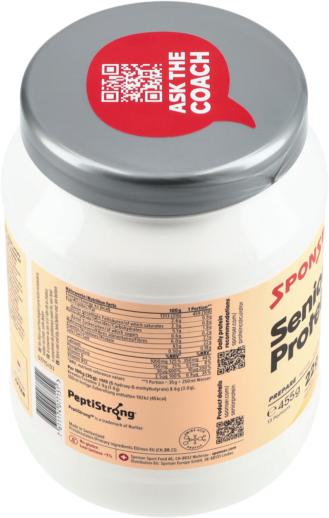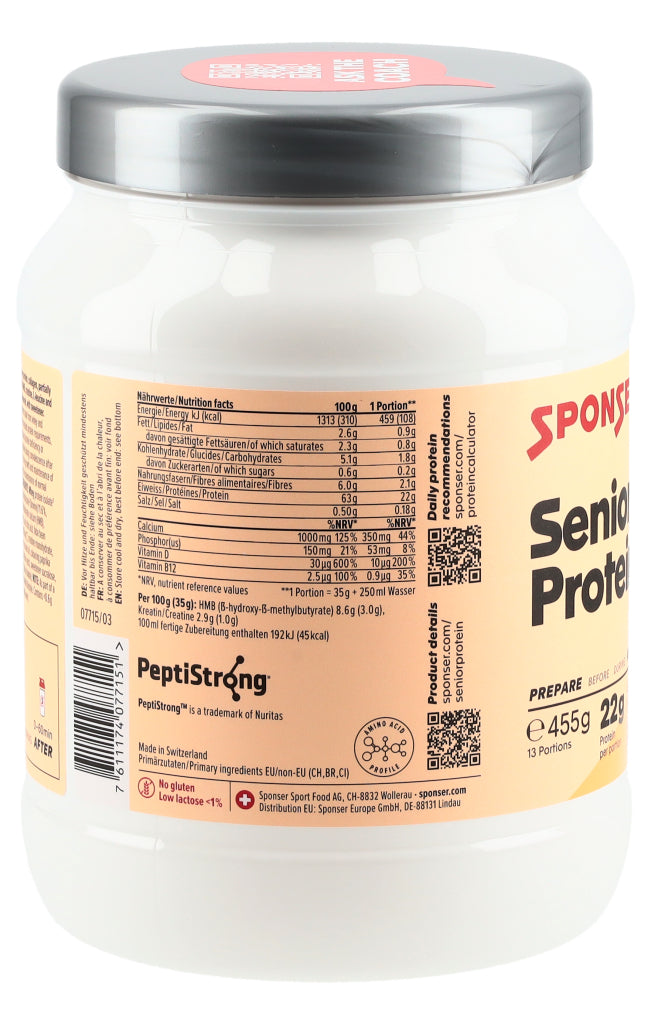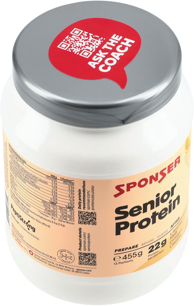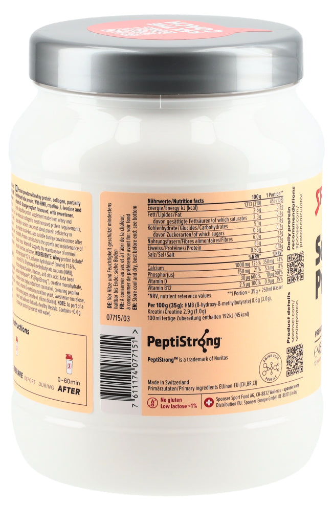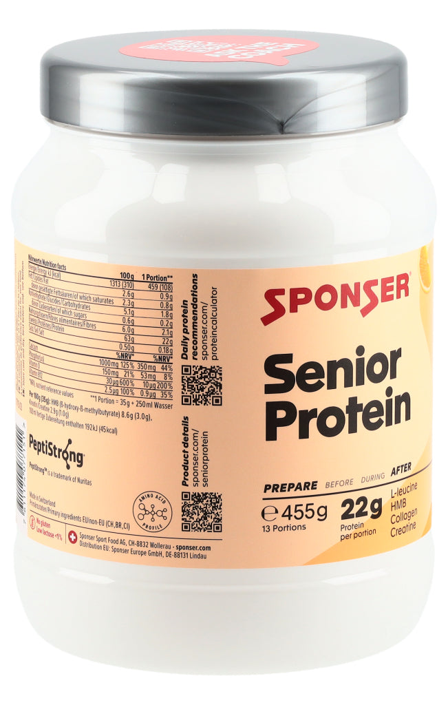 SENIOR PROTEIN ist eine hochwertige Ergänzung mit Leucin, HMB und Kollagen zur Deckung eines erhöhten Proteinbedarfs, insbesondere bei Senioren. Protein unterstützt den Aufbau und Erhalt von Muskelmasse.