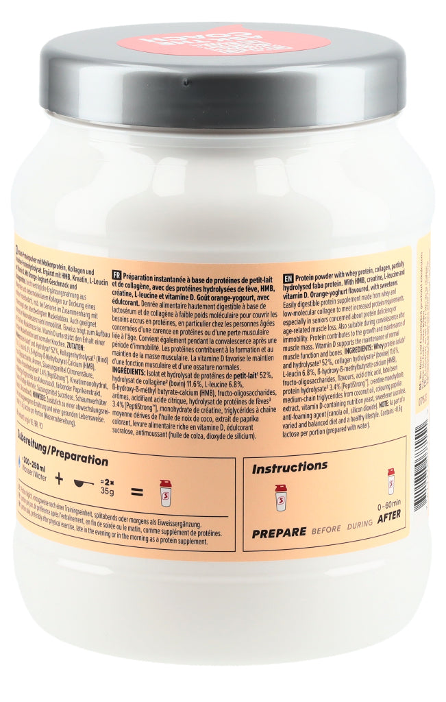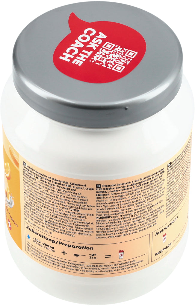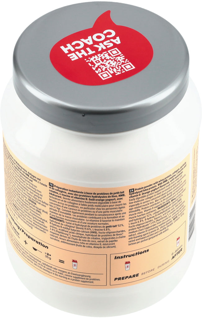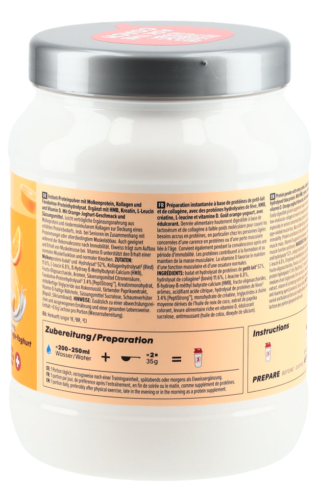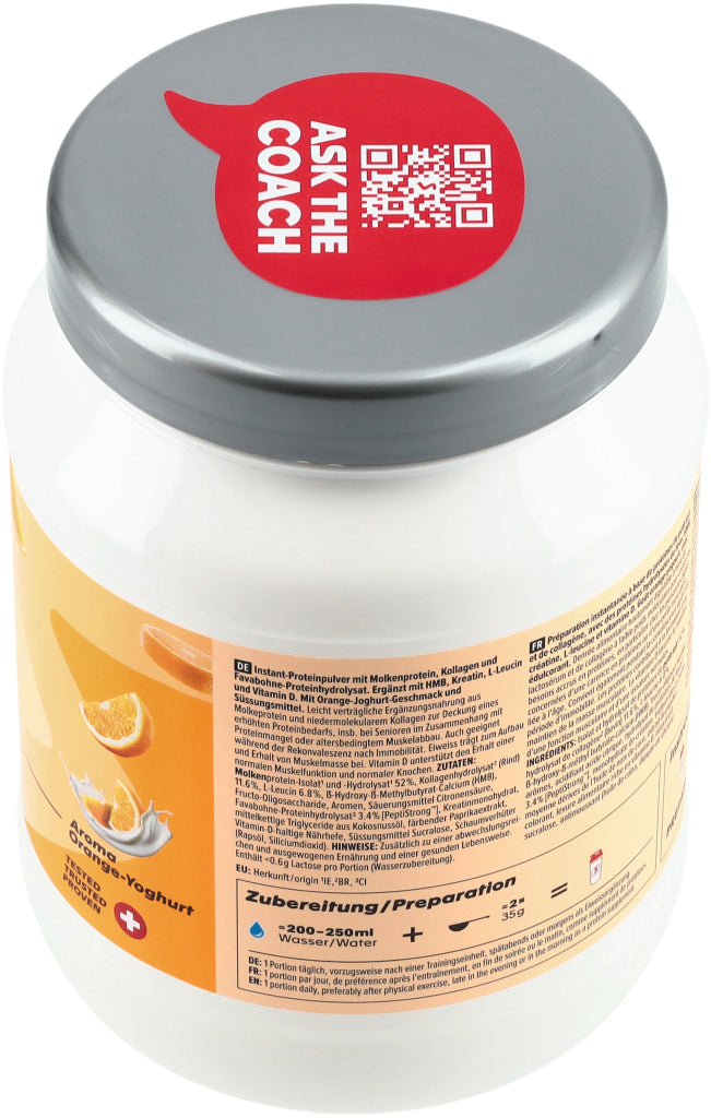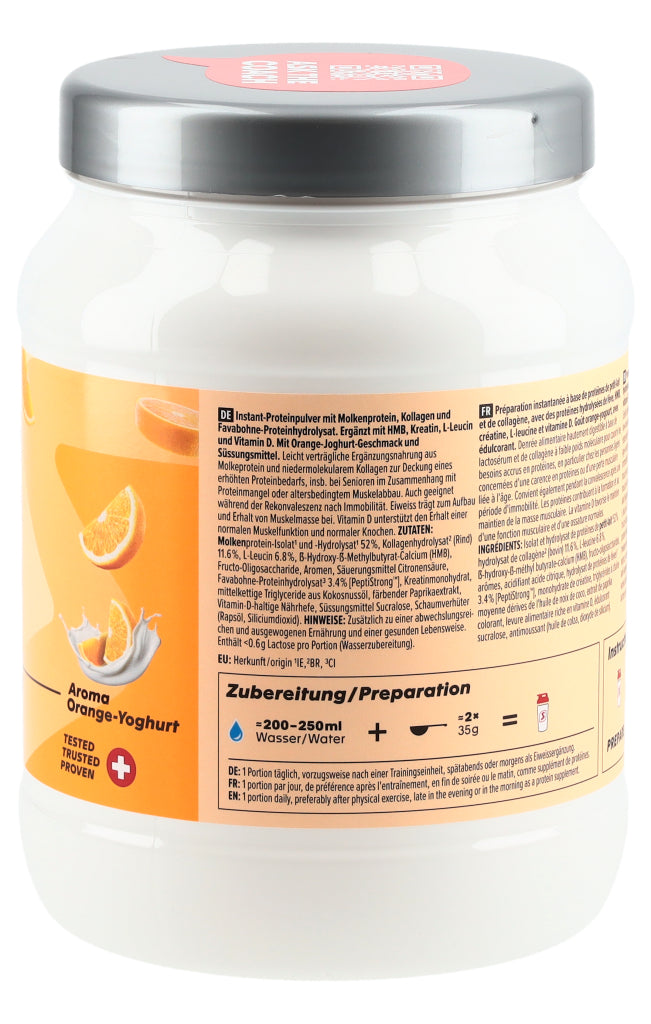 Eiweisspräparat mit Molkenprotein und Kollagen zur Instantzubereitung, mit HMB, L-Leucin und Vitamin D. Mit Orange-Yoghurt und Süssungsmittel. Lactosearm und glutenfrei.