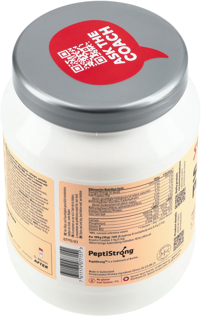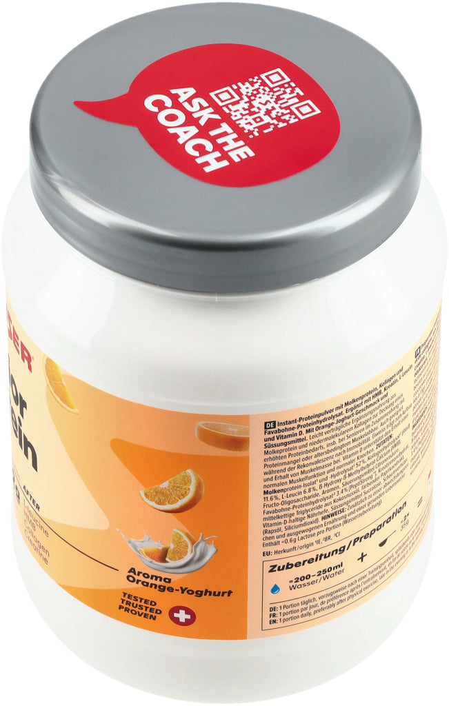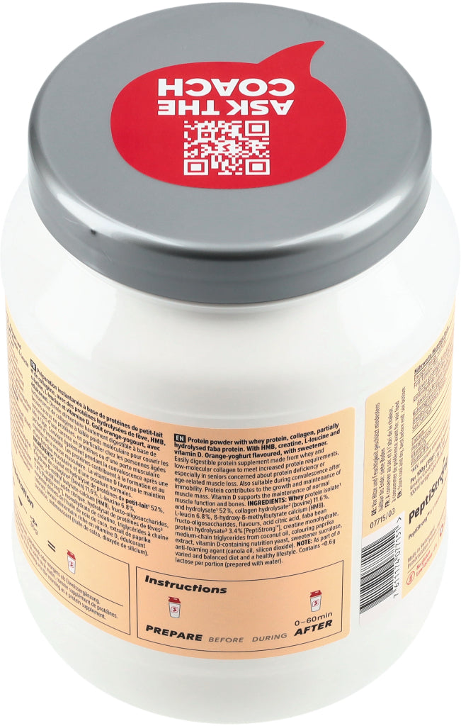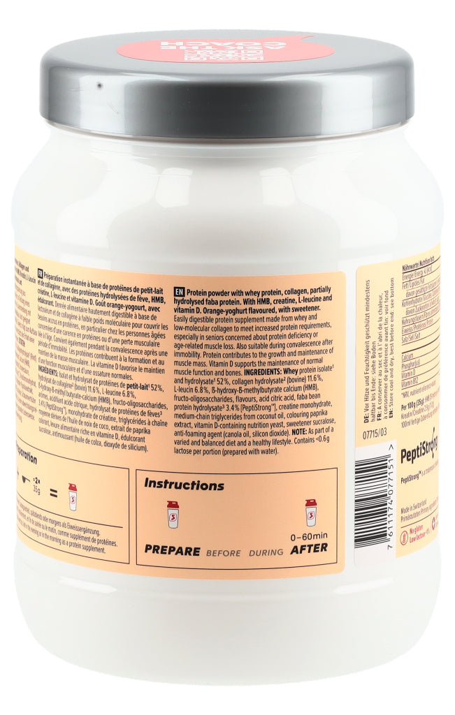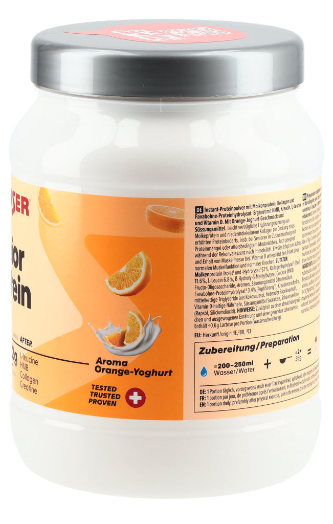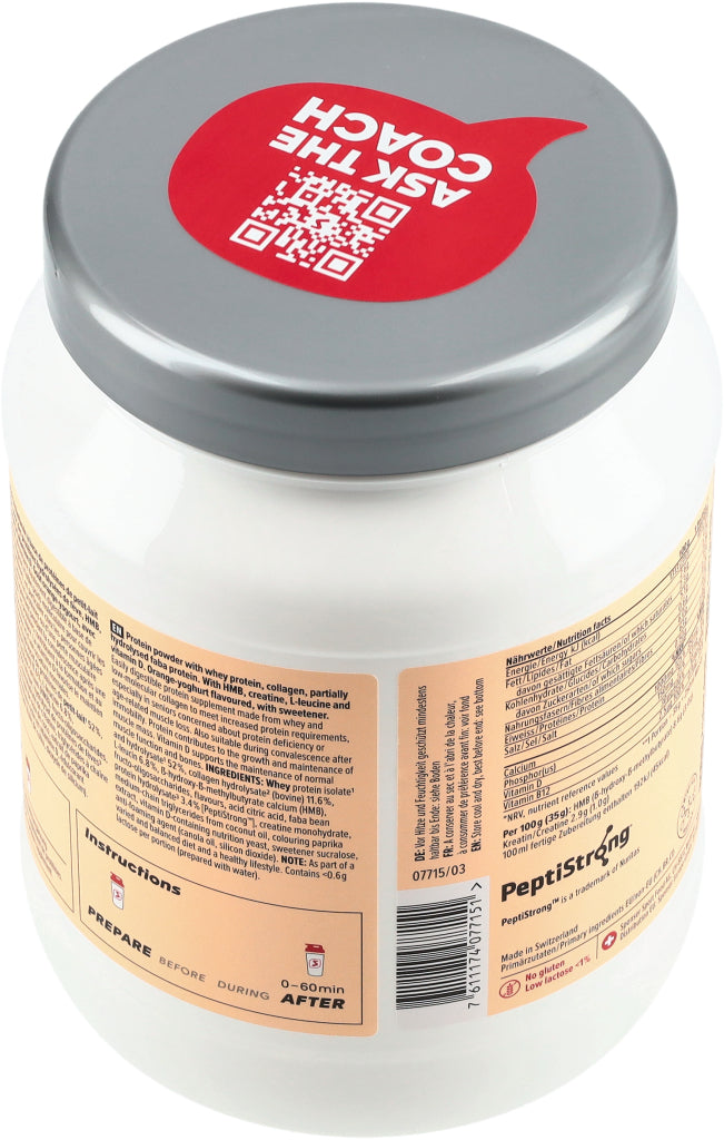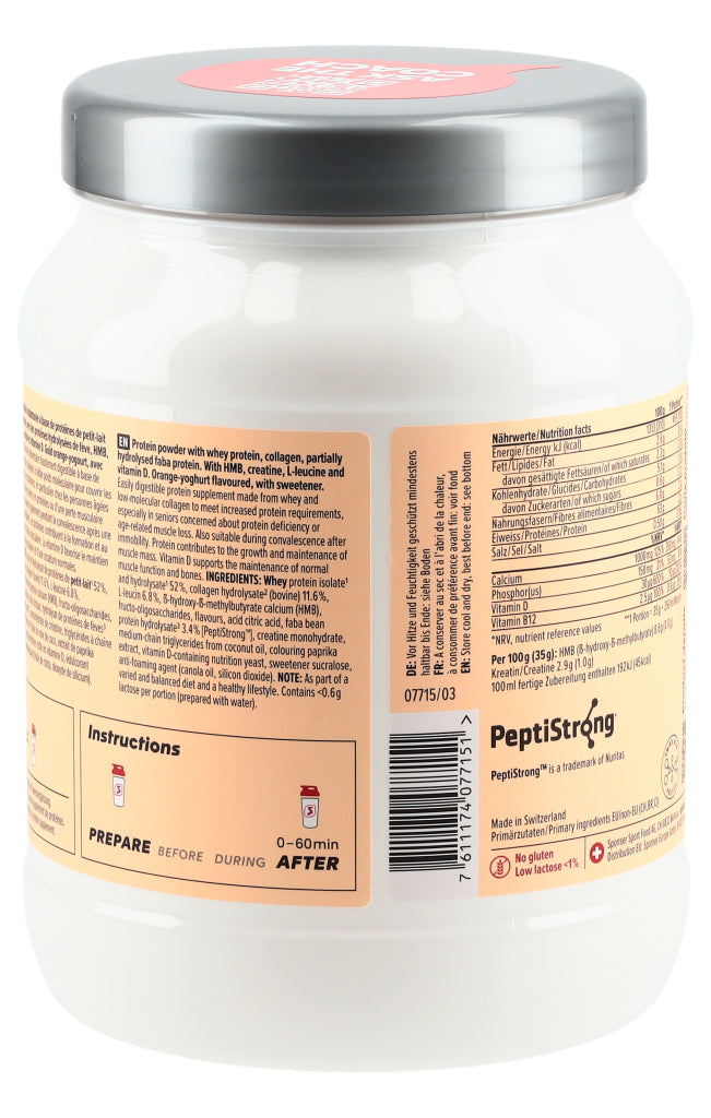 Eiweisspräparat mit Molkenprotein und Kollagen zur Instantzubereitung, mit HMB, L-Leucin und Vitamin D. Mit Orange-Yoghurt und Süssungsmittel. Lactosearm und glutenfrei.