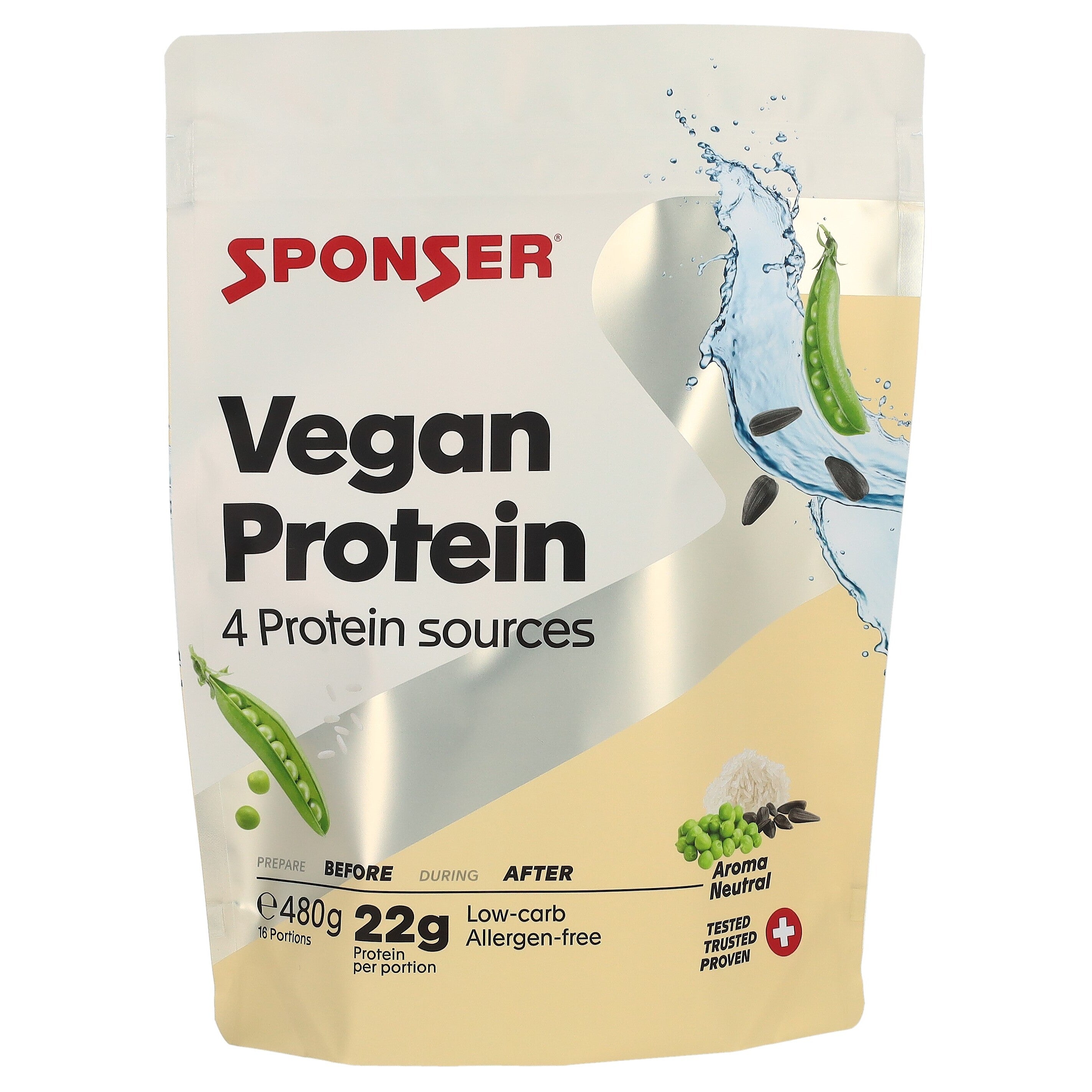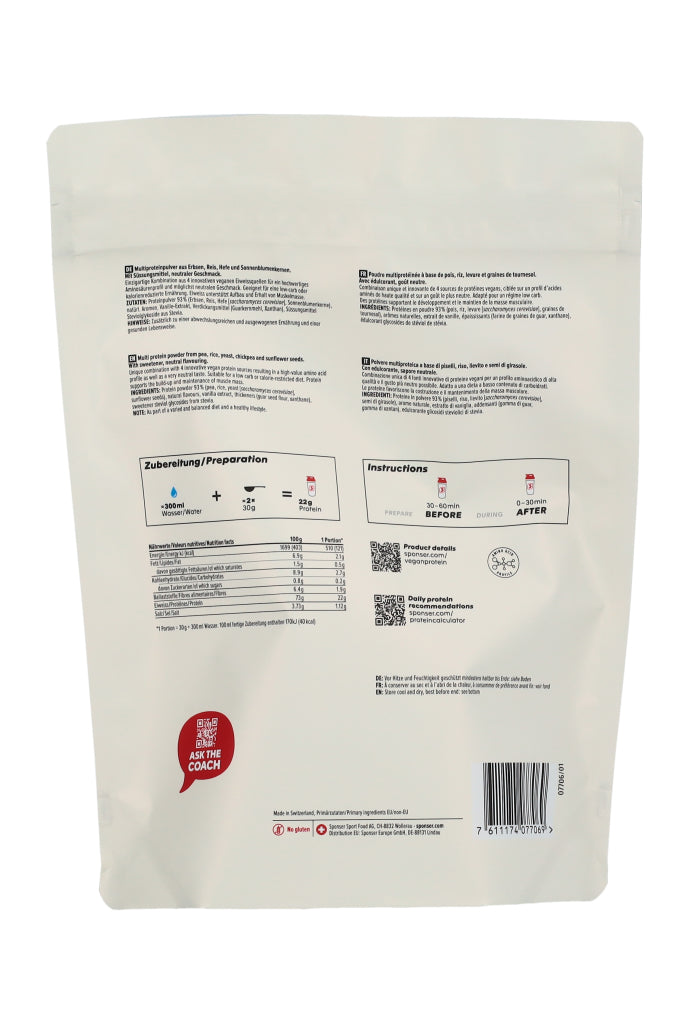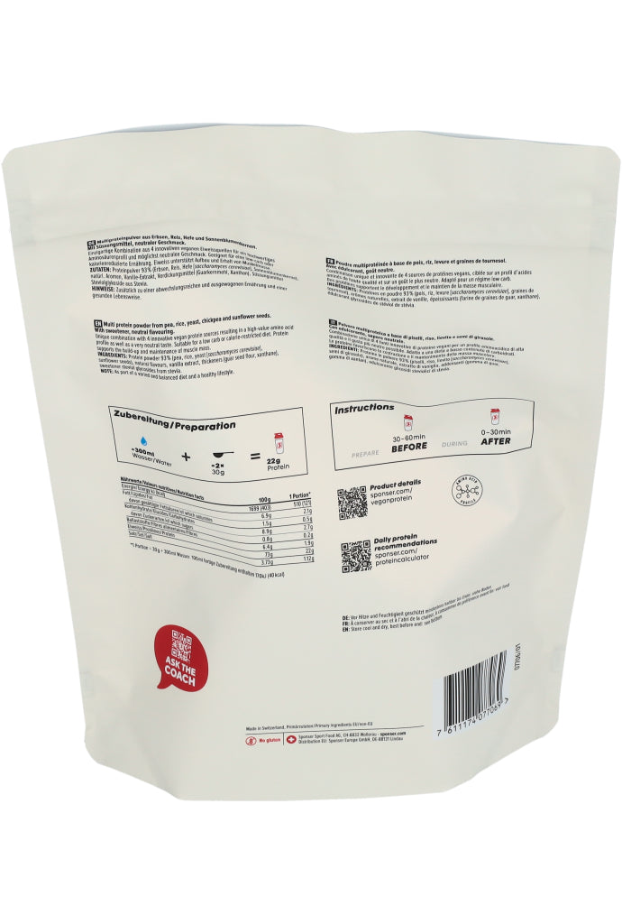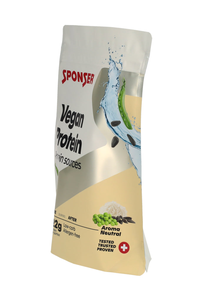 SPONSER® VEGAN PROTEIN verbindet Eiweissquellen aus Quinoa, Sonnenblumenkernen, Erbsen und Reis zu einem hochwertigen veganen Proteinpulver, das ein volles Spektrum an Aminosäuren und 20 g Protein pro Portion liefert. Die innovative Proteinmischung aus rein pflanzlichen Quellen sorgt für ein ausgewogenes Aminosäurenprofil. Eiweiss unterstützt Aufbau und Erhalt von Muskelmasse. Angereichert mit 3.9 g Nahrungsfasern pro Portion. Die Kombination Eiweiss-Nahrungsfasern macht Vegan Protein zu einem wertvollen Supplement im Rahmen der Low Carb Ernährung. Angereichert mit L-Carnitin, Vitaminen und Mineralstoffen sowie Cholinbitartrat, welches den Fettstoffwechsel unterstützt. L-Carnitin ist üblicherweise in Fleisch enthalten. Eine rein pflanzliche oder ovo-lactovegetabile Ernährungsweise liefert nur geringe Mengen an L-Carnitin. Veganer profitieren daher von einer zielgerichteten Zufuhr.