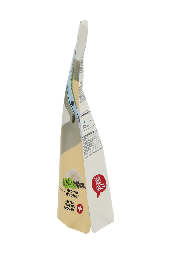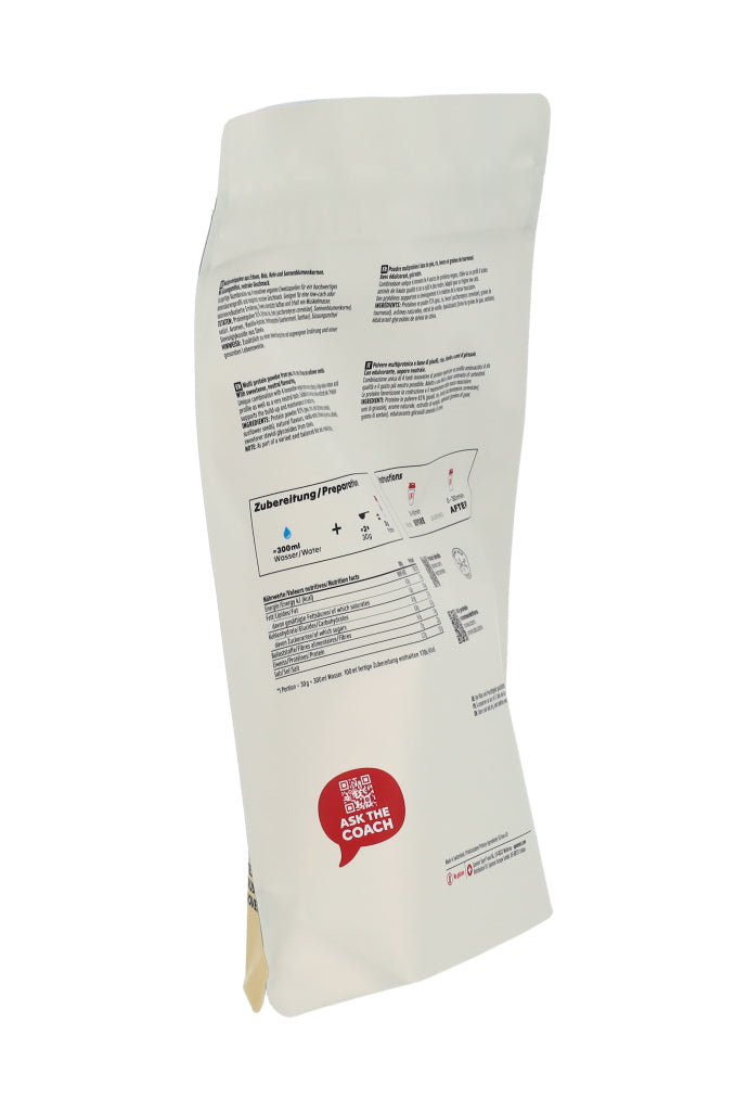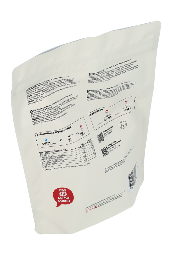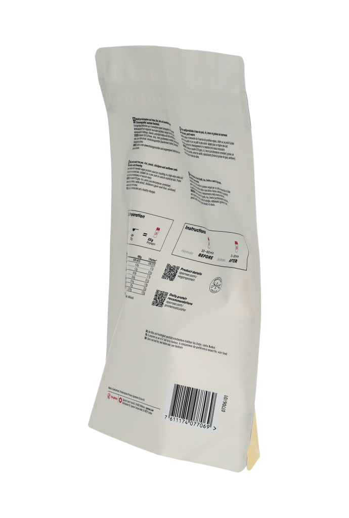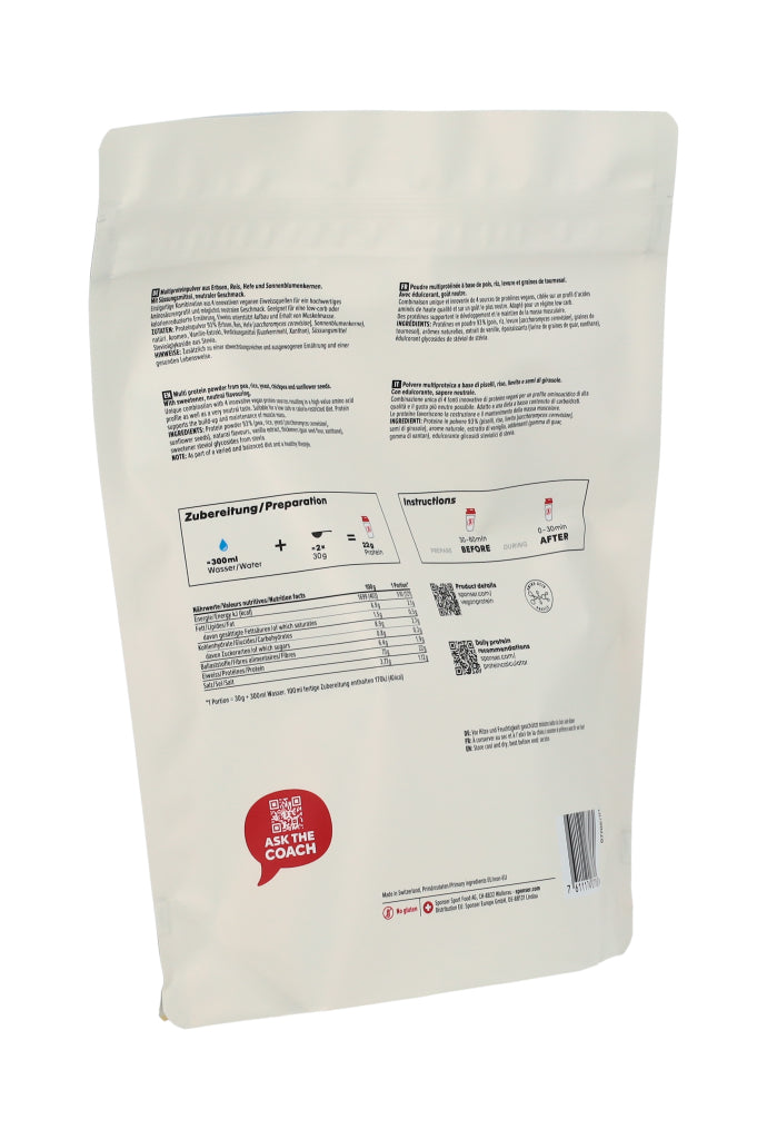 Multiproteinpulver aus Quinoa, Sonnenblumenkernen, Erbsen und Reis. Mit L-Carnitin, Cholin, Nahrungsfasern, Vitaminen und Mineralstoffen. Neutraler Eigengeschmack, mit Vanille-Extrakt und Süssungsmittel.