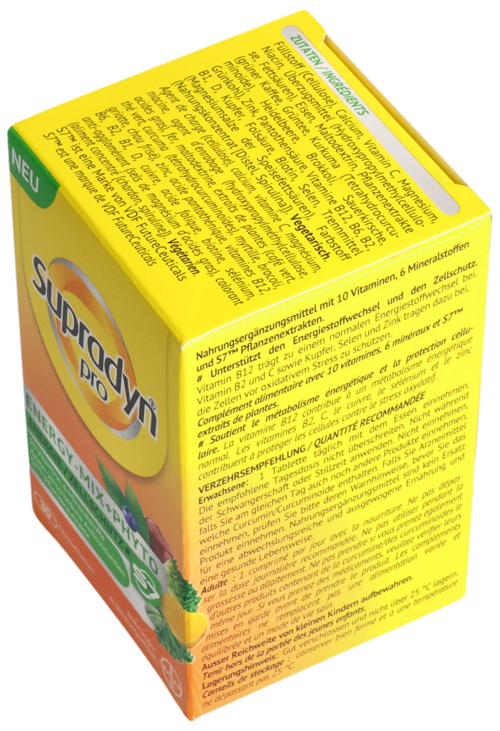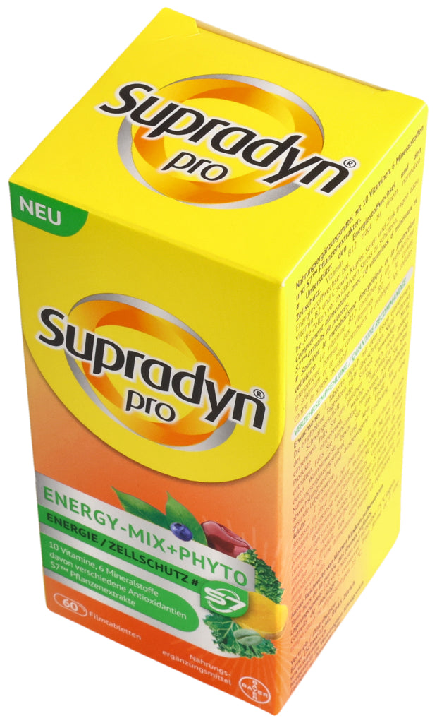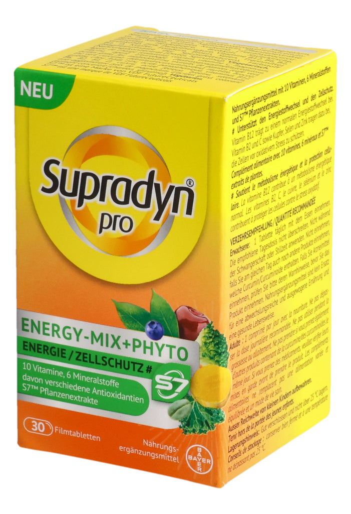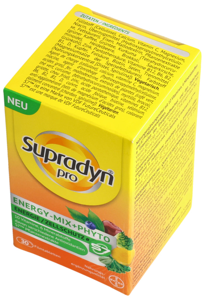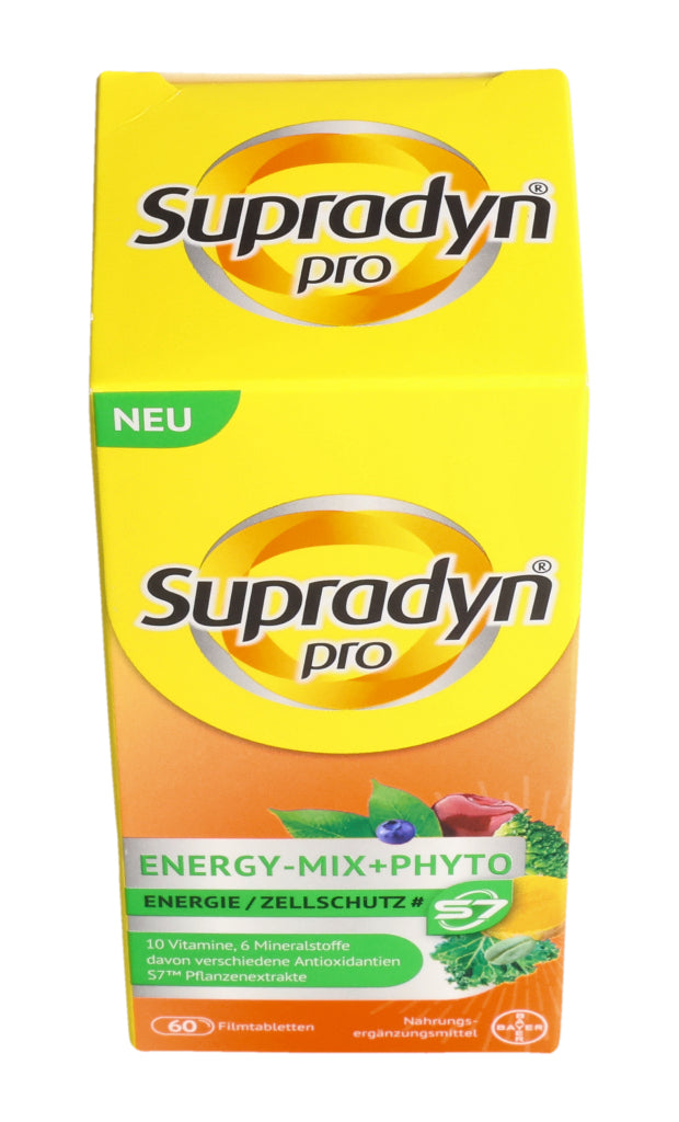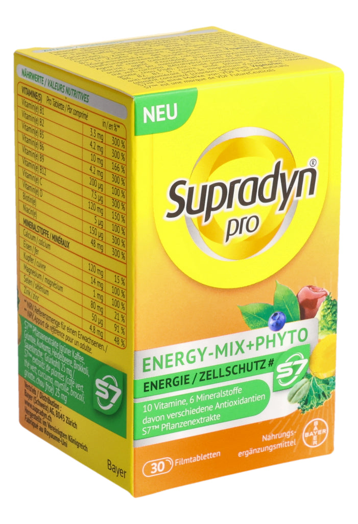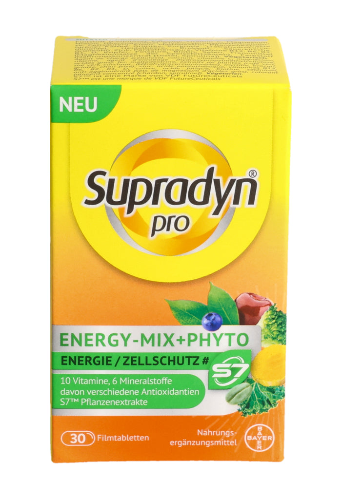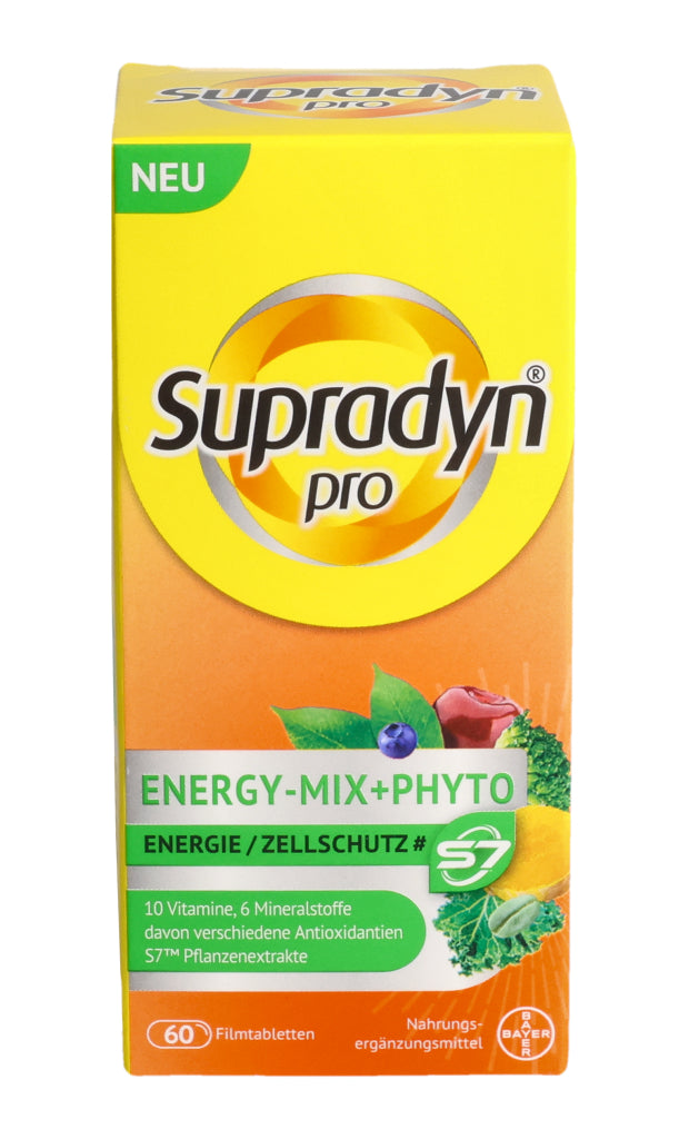 Supradyn® pro Energy-Mix+Phyto ist ein einzigartiges Multivitamin- und Mineralstoffpräparat mit 10 Vitaminen, 6 Mineralstoffen und speziellen S7TM Pflanzenextrakten. Unterstützt die Energieproduktion und den Zellschutz*. Bei anhaltender Ermüdung*. Für Personen, die ein Multivitamin-Mineralstoffpräparat mit dem Zusatz von Pflanzenextrakten suchen. Anwendungsmöglichkeiten sind körperliche Ermüdung, ein hektischer Alltag, intensive körperliche Belastung.