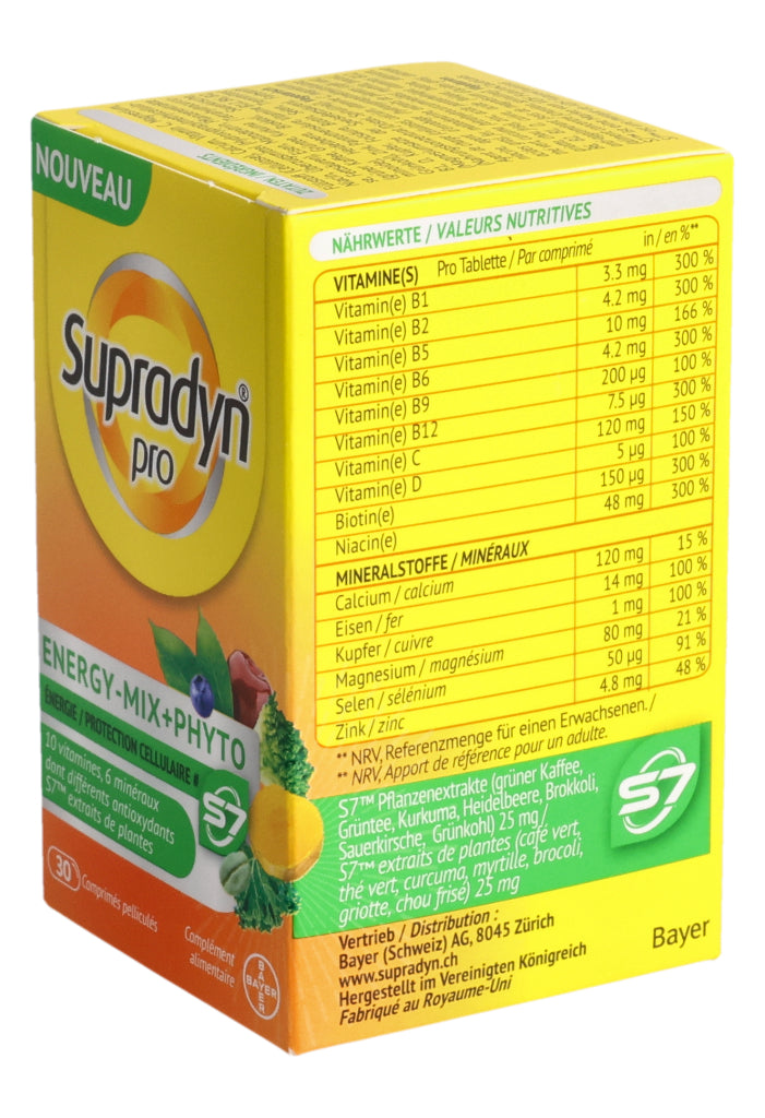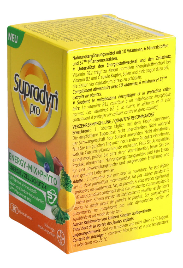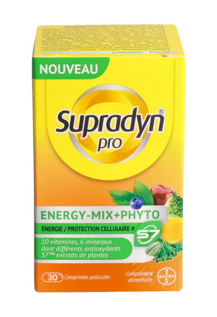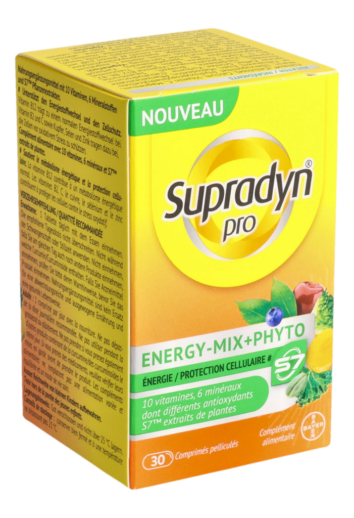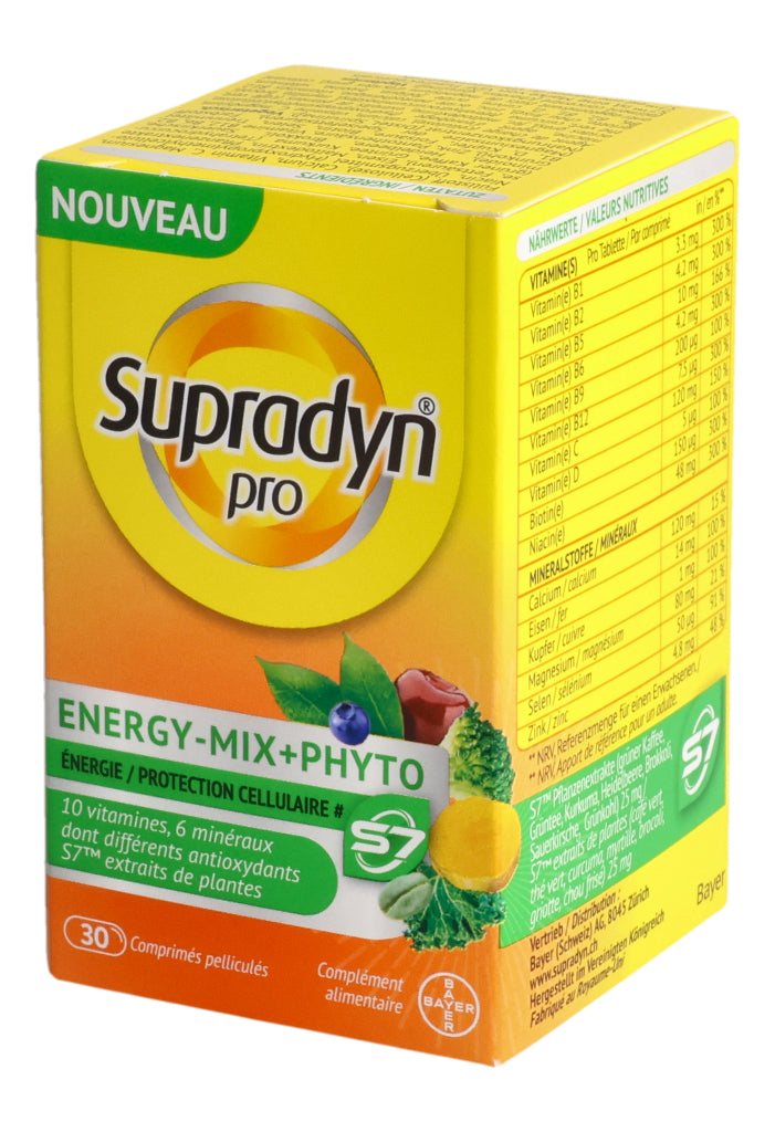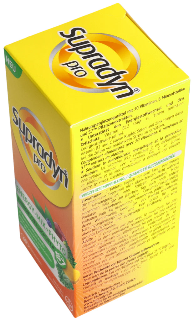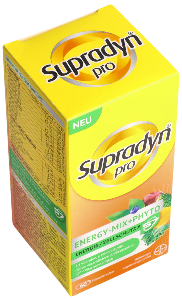 Supradyn® pro Energy-Mix+Phyto ist ein einzigartiges Multivitamin- und Mineralstoffpräparat mit 10 Vitaminen, 6 Mineralstoffen und speziellen S7TM Pflanzenextrakten. Unterstützt die Energieproduktion und den Zellschutz*. Bei anhaltender Ermüdung*. Für Personen, die ein Multivitamin-Mineralstoffpräparat mit dem Zusatz von Pflanzenextrakten suchen. Anwendungsmöglichkeiten sind körperliche Ermüdung, ein hektischer Alltag, intensive körperliche Belastung.