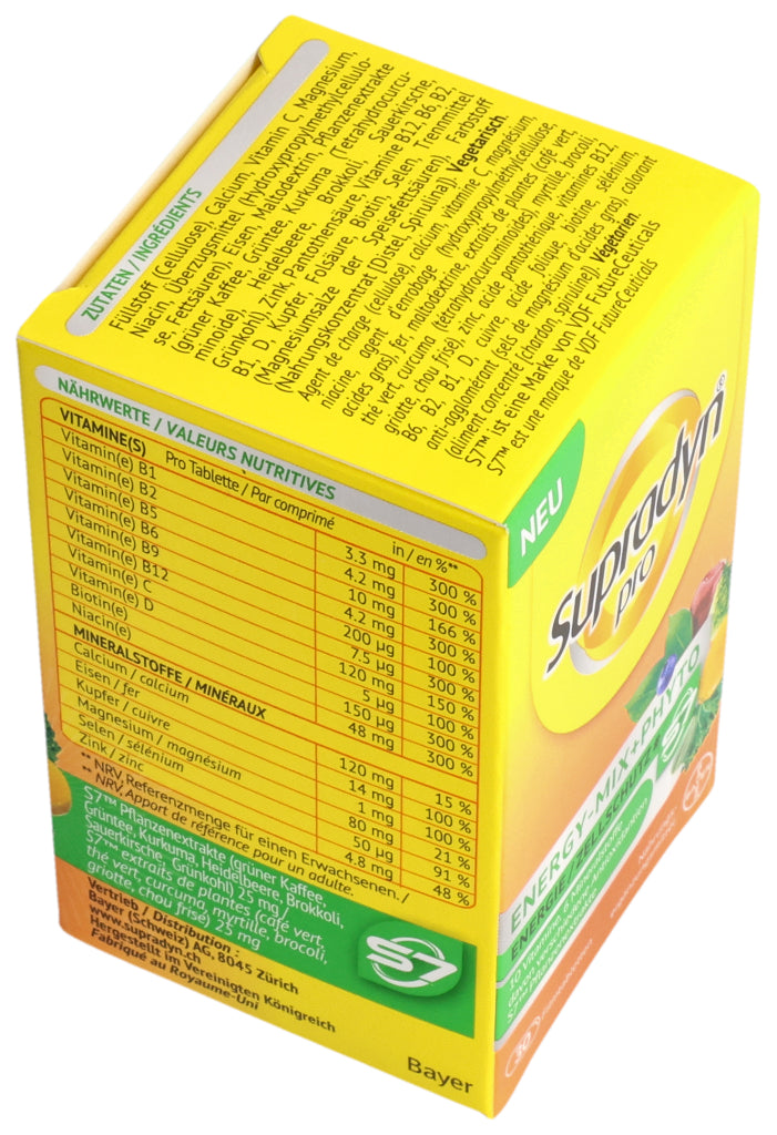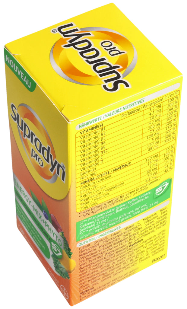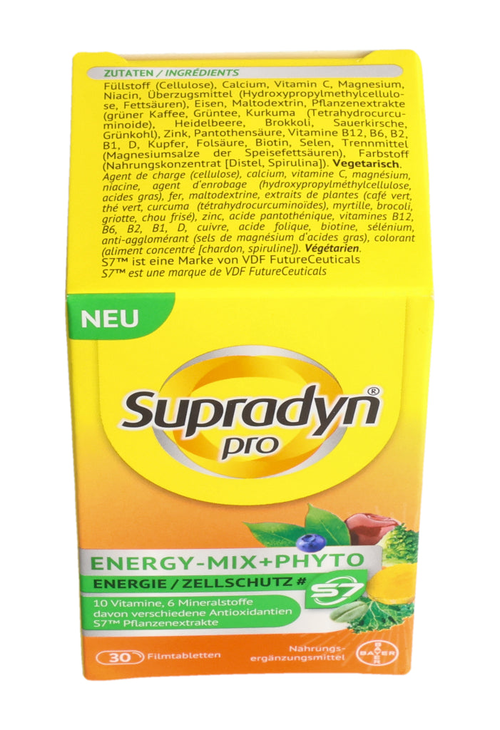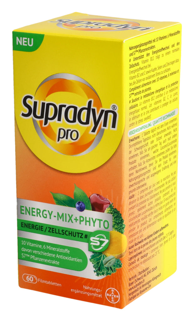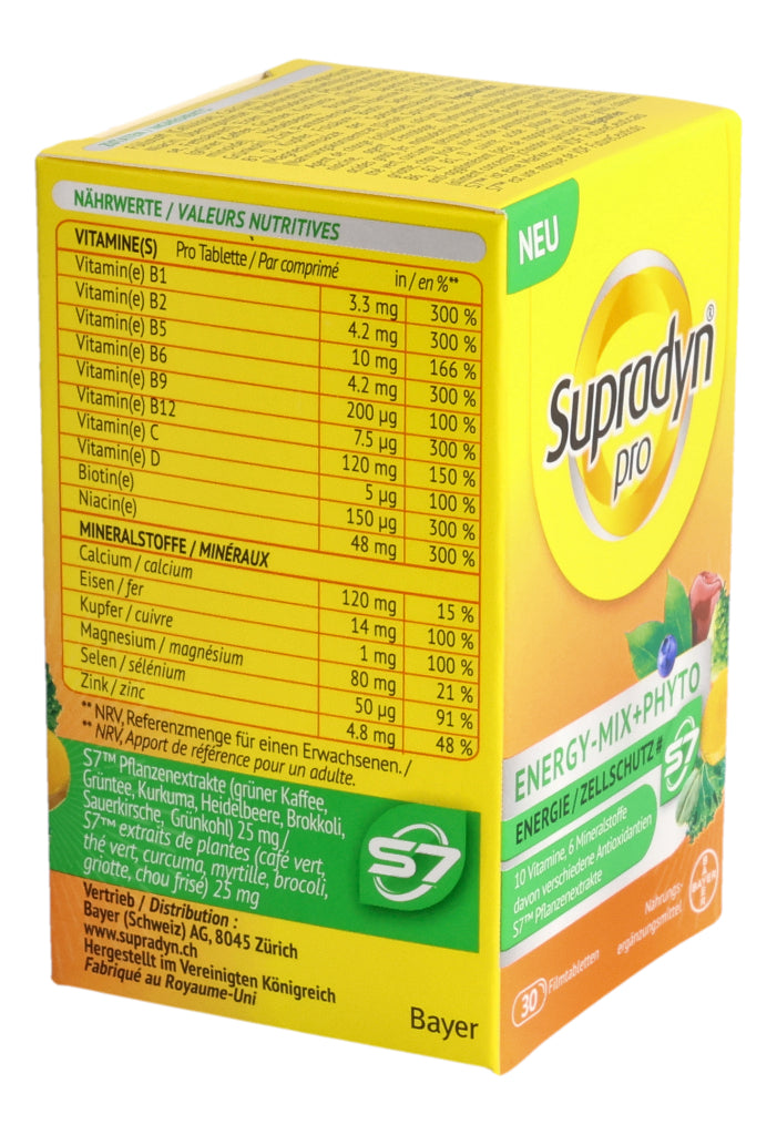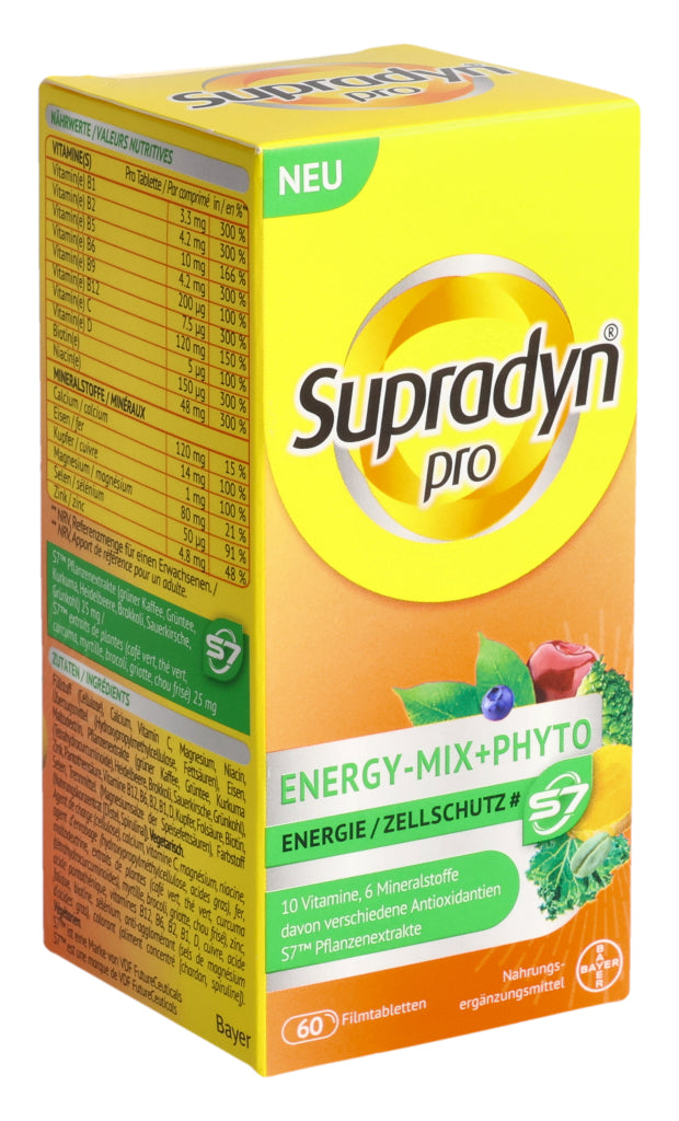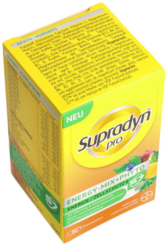 Supradyn® pro Energy-Mix+Phyto enthält 10 Vitamine und 6 Mineralstoffe, darunter verschiedene Antioxidantien*. Mit S7™-Pflanzenextrakten**. Mit 300% der täglichen Referenzmenge für Erwachsen bei den Vitaminen B1, B2, B6, B 12, Biotin und Niacin. Enthält natürliche Farbstoffe.