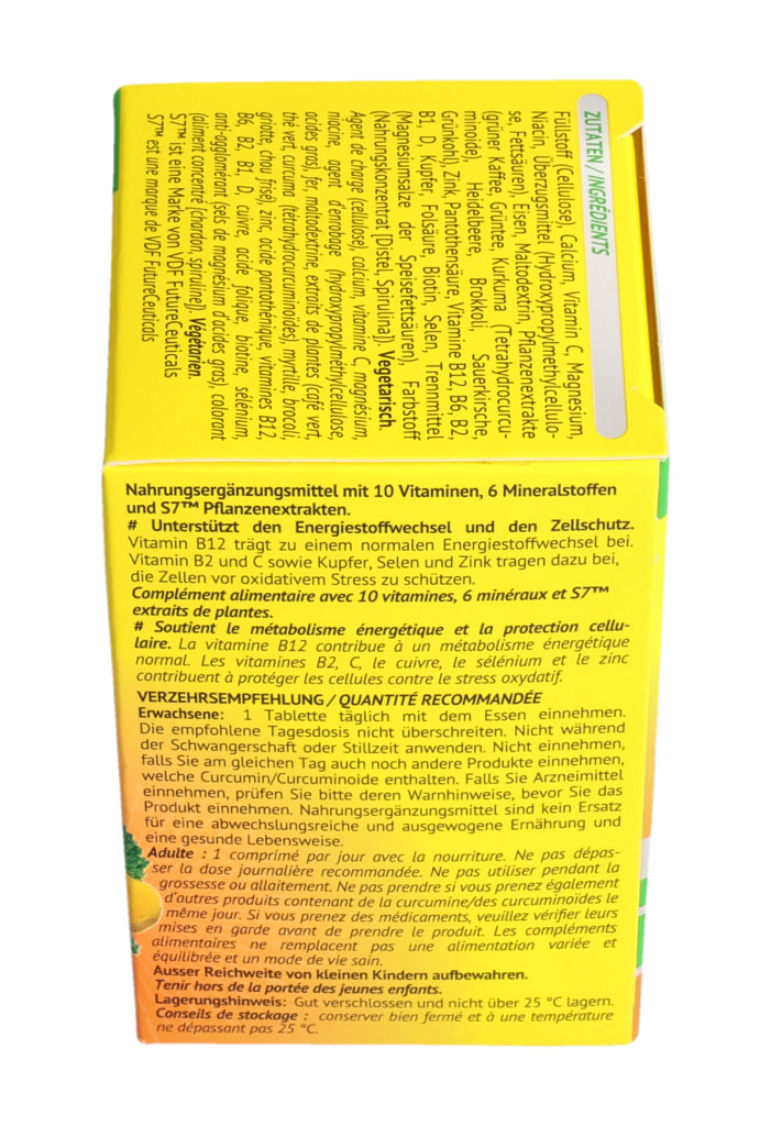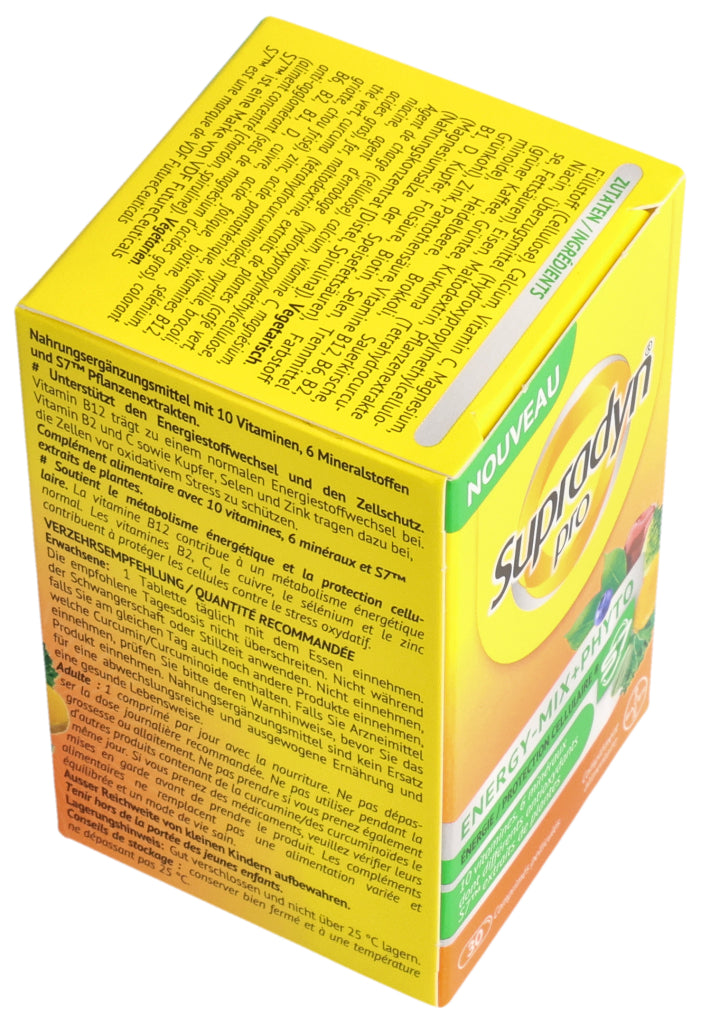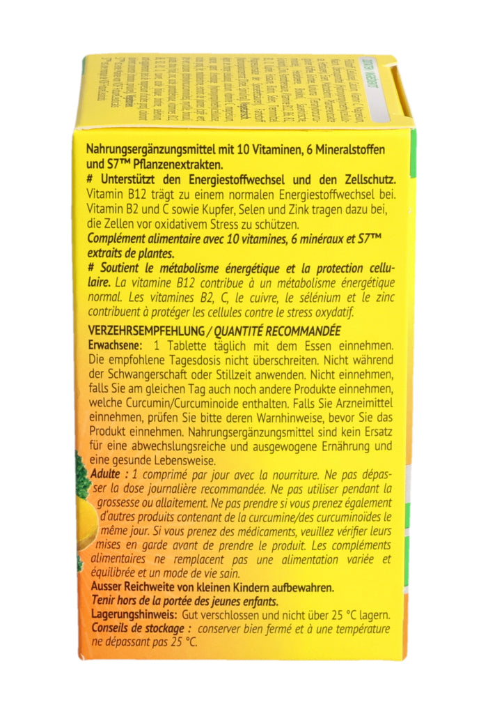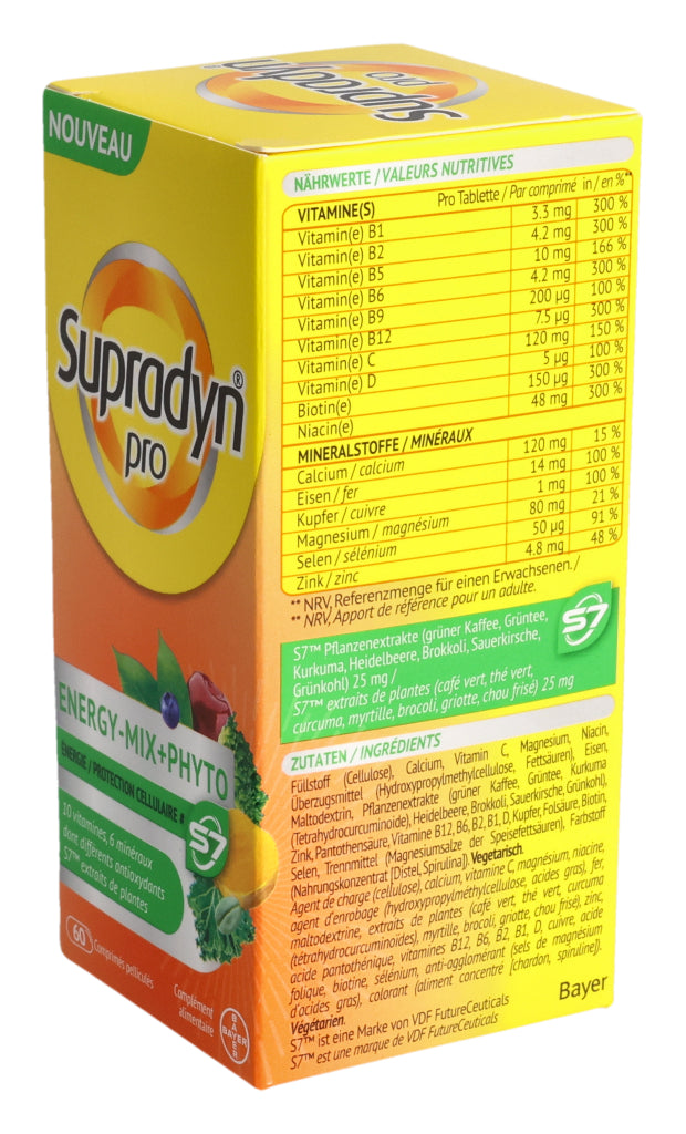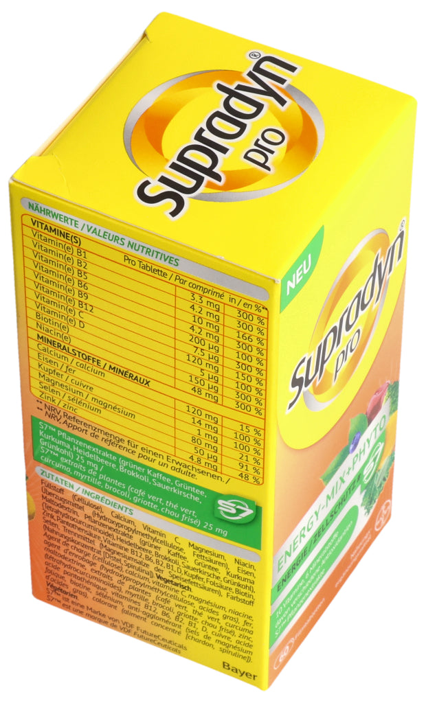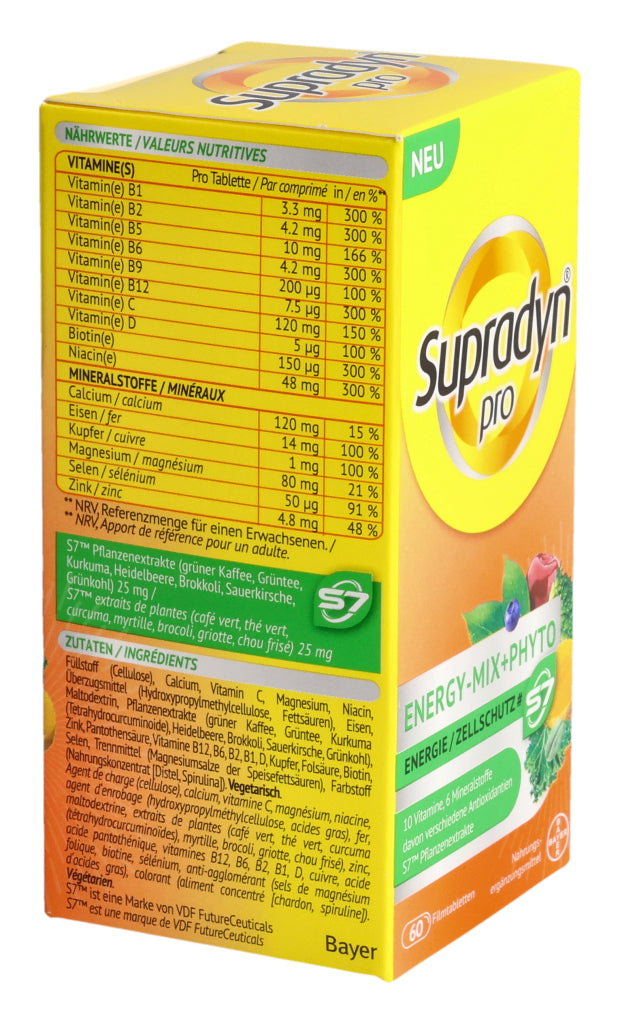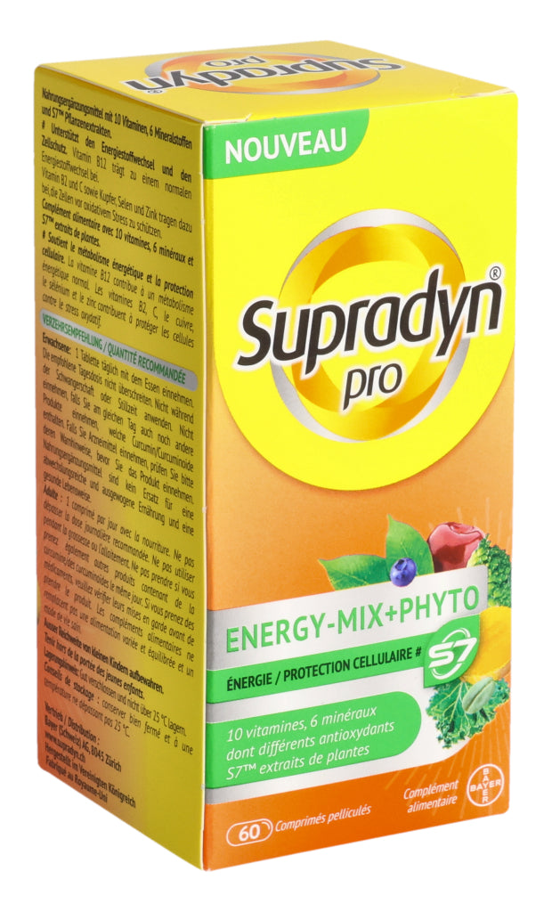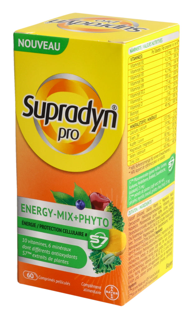 Supradyn® pro Energy-Mix+Phyto enthält 10 Vitamine und 6 Mineralstoffe, darunter verschiedene Antioxidantien*. Mit S7™-Pflanzenextrakten**. Mit 300% der täglichen Referenzmenge für Erwachsen bei den Vitaminen B1, B2, B6, B 12, Biotin und Niacin. Enthält natürliche Farbstoffe.