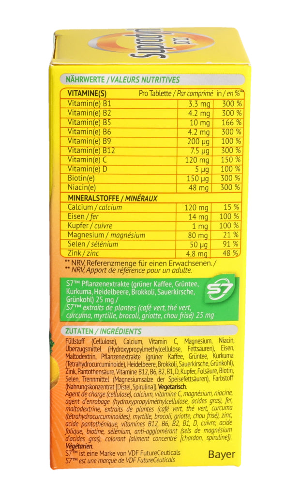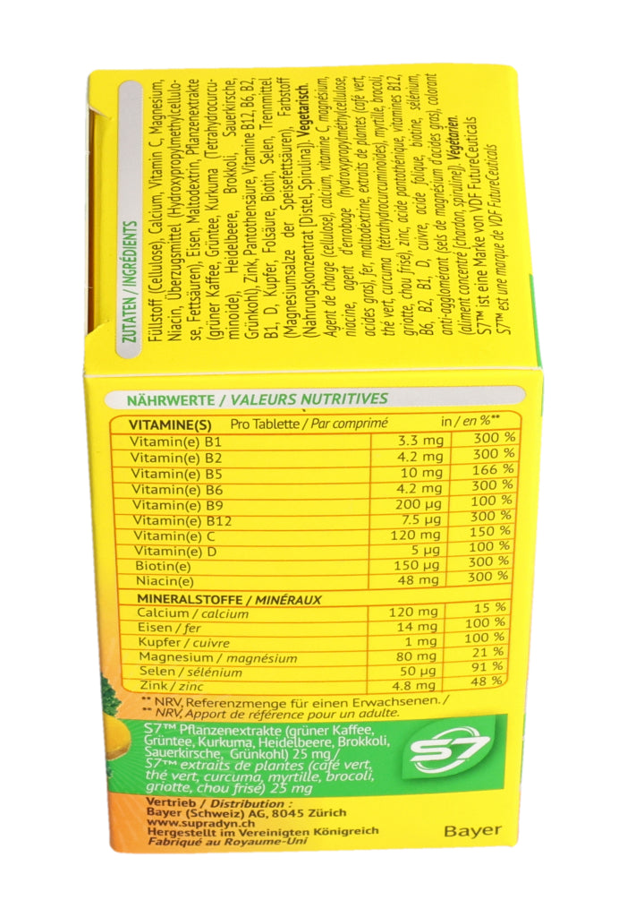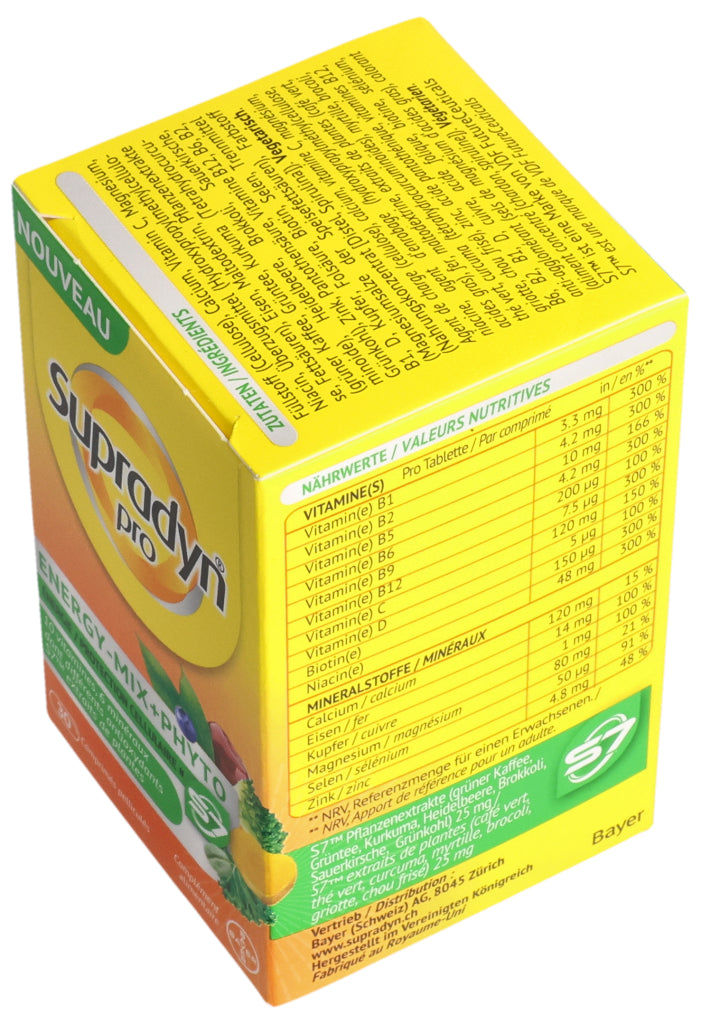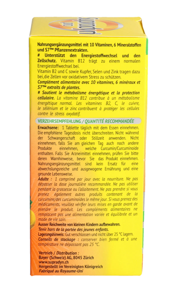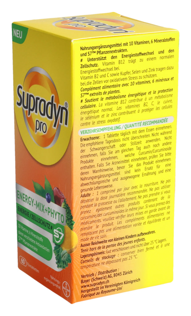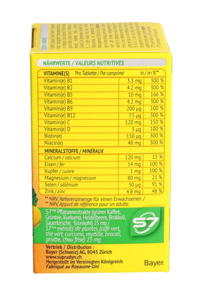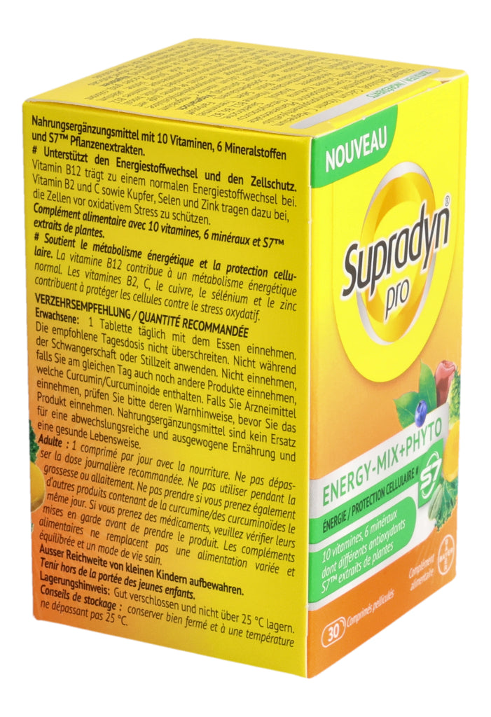 Supradyn® pro Energy-Mix+Phyto enthält 10 Vitamine und 6 Mineralstoffe, darunter verschiedene Antioxidantien*. Mit S7™-Pflanzenextrakten**. Mit 300% der täglichen Referenzmenge für Erwachsen bei den Vitaminen B1, B2, B6, B 12, Biotin und Niacin. Enthält natürliche Farbstoffe.