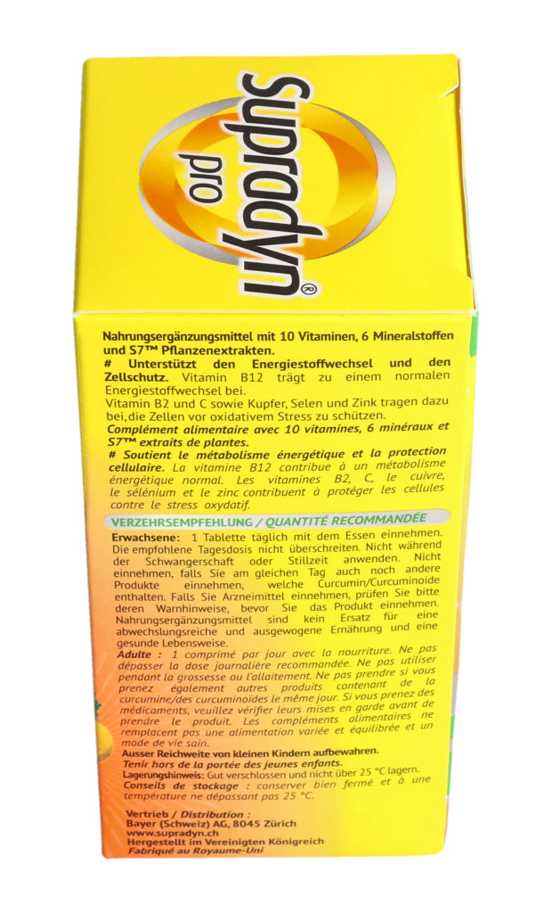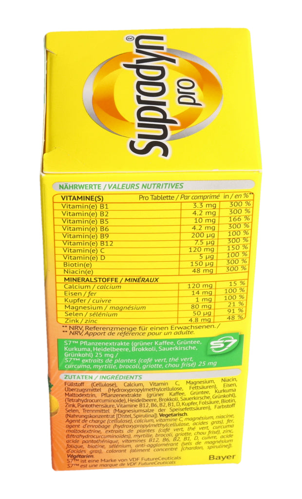 Das Präparat hat den höchsten Gehalt an den Vitaminen B2, B6,Biotin und B12 innerhalb der Supradyn® pro Range.