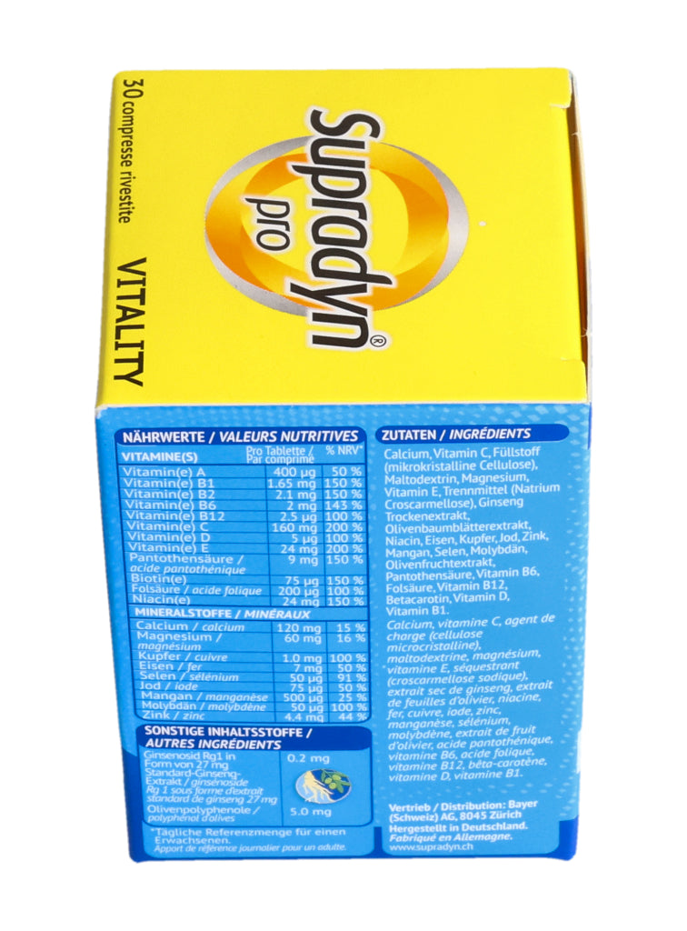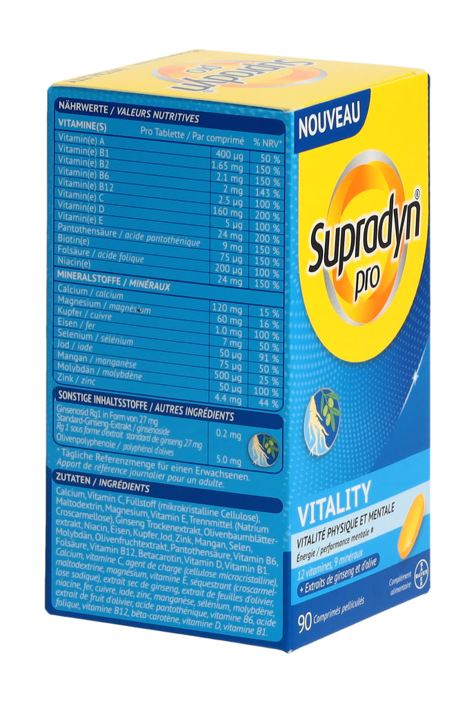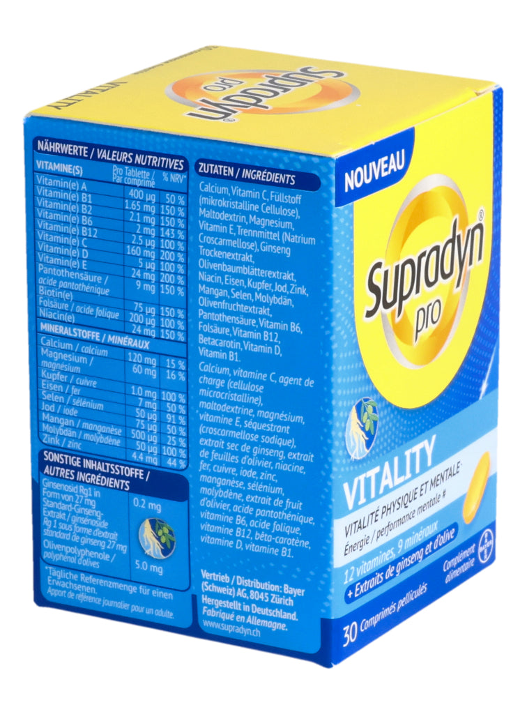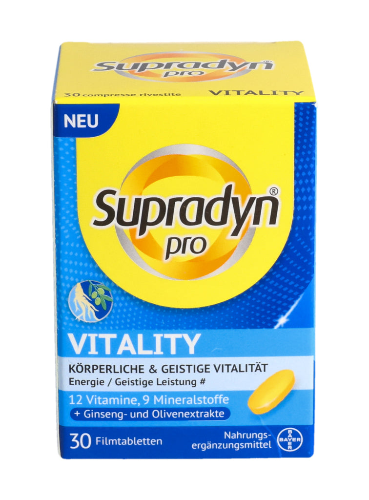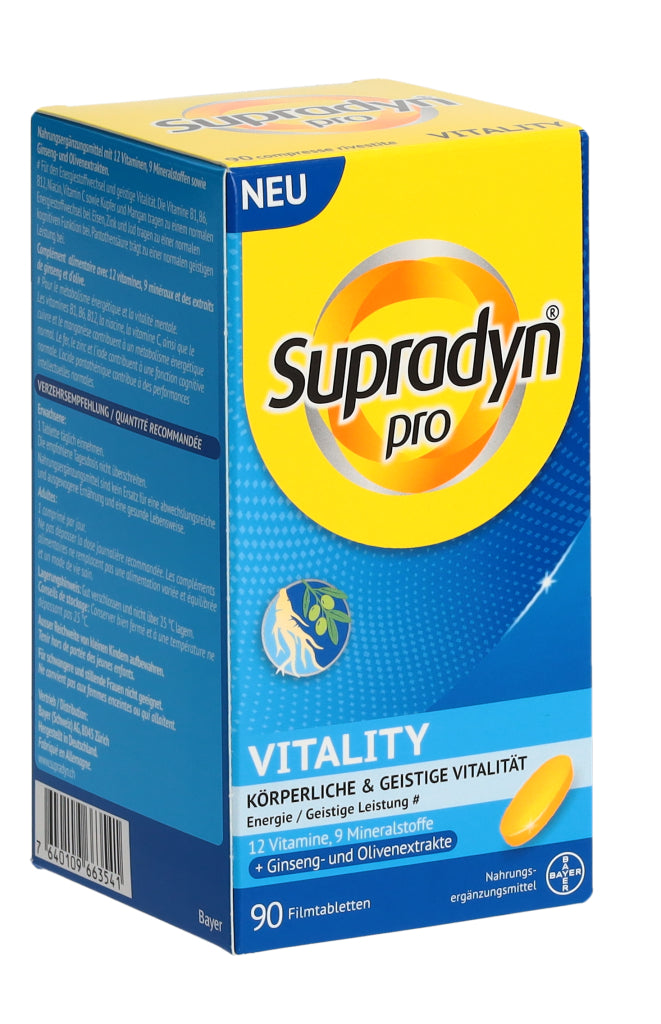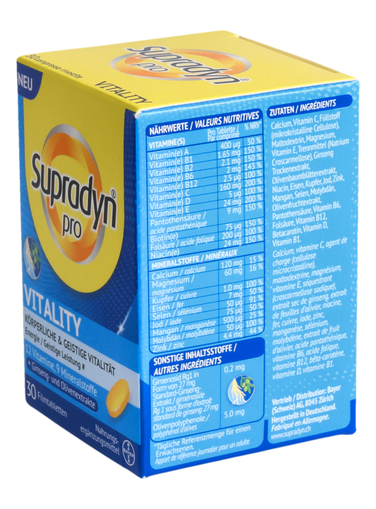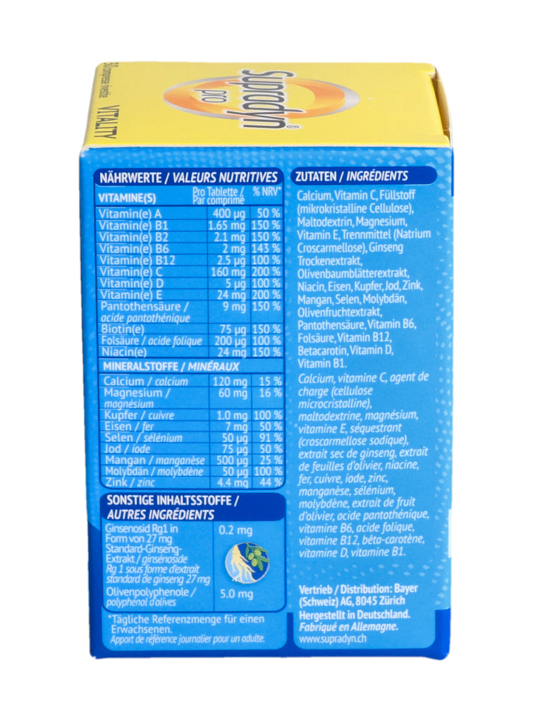Supradyn® pro VITALITY zeichnet sich durch eine einzigartige, moderne Formulierung aus, die nebst 12 Vitaminen und 9 Mineralstoffen auch hochwertige Ginseng- und Olivenextrakte enthält. Die in den Extrakten enthaltenen Ginsenoside und Olivenpolyphenole enthalten bioaktive Verbindungen die bedeutende ernährungsphysiologische Eigenschaften aufweisen.