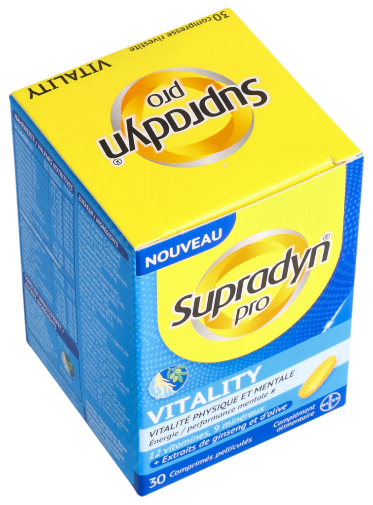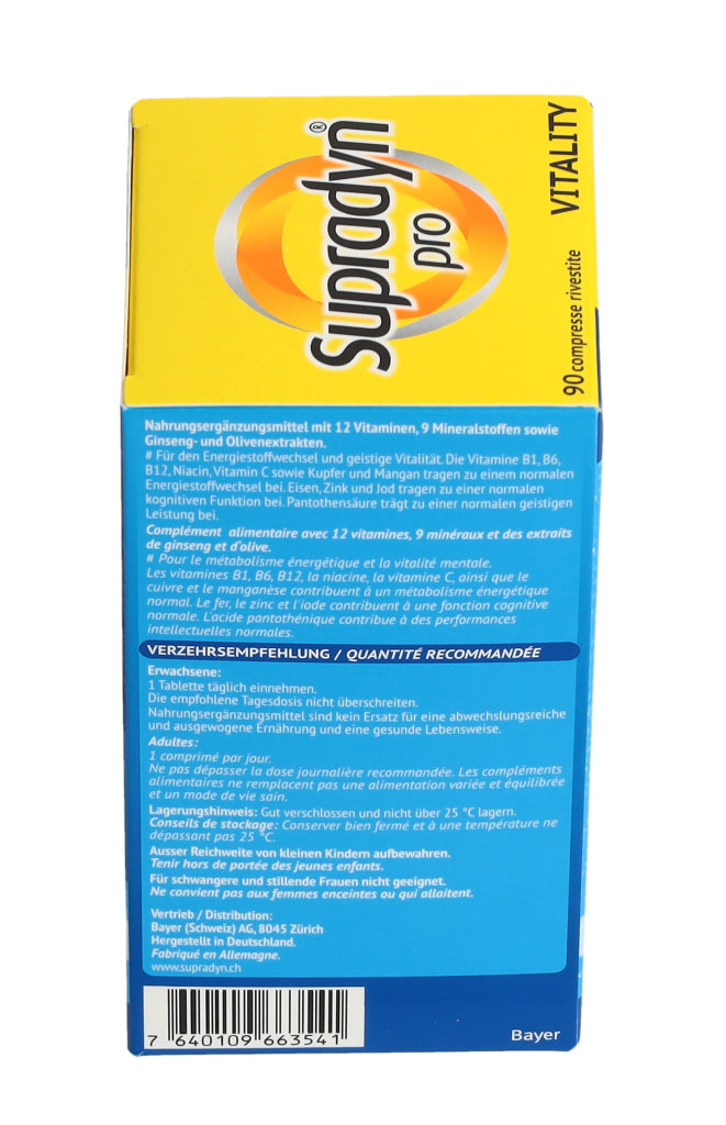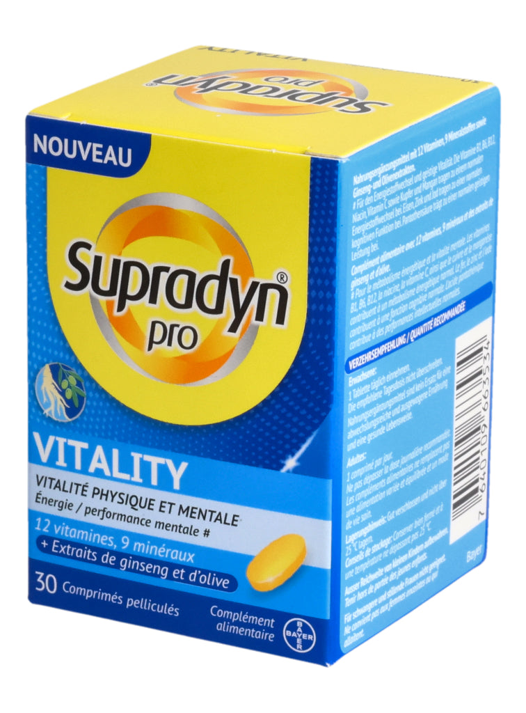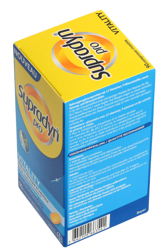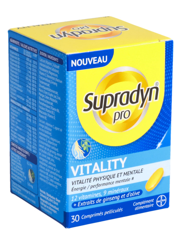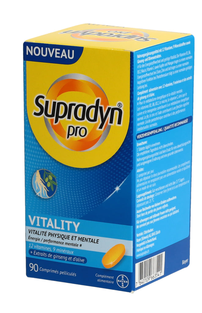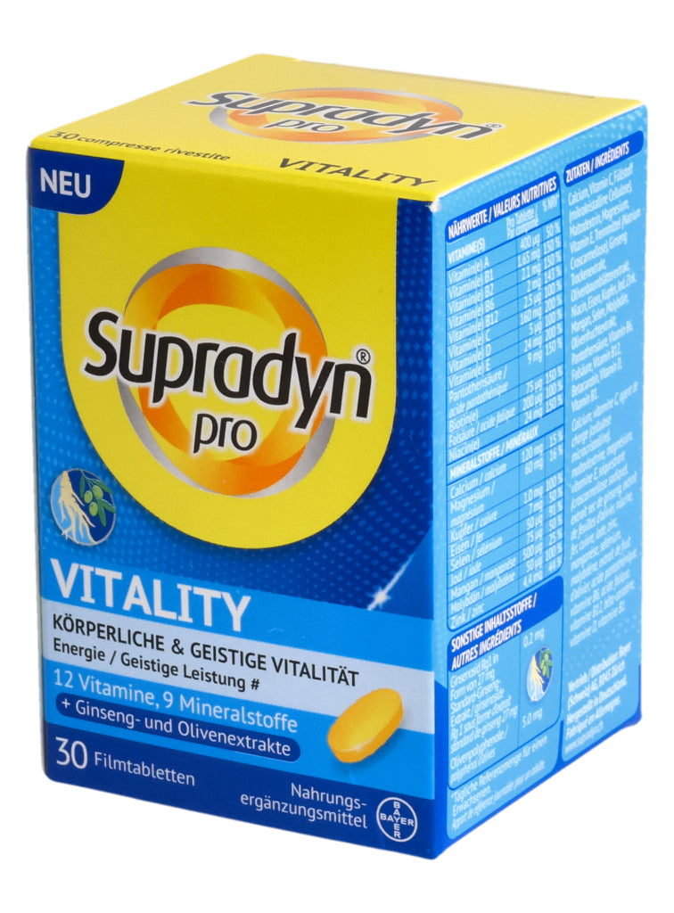 Supradyn® pro VITALITY zeichnet sich durch eine einzigartige, moderne Formulierung aus, die nebst 12 Vitaminen und 9 Mineralstoffen auch hochwertige Ginseng- und Olivenextrakte enthält. Die in den Extrakten enthaltenen Ginsenoside und Olivenpolyphenole enthalten bioaktive Verbindungen die bedeutende ernährungsphysiologische Eigenschaften aufweisen.
