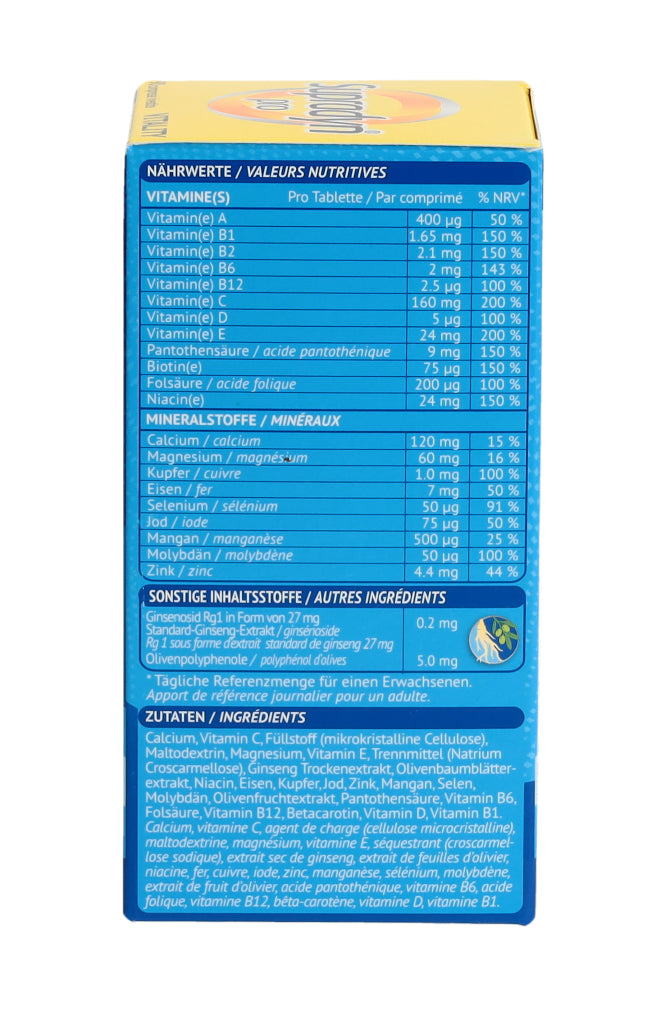 Vitamine, Mineralstoffe, Ginseng-Extrakt, Olivenblatt-Extrakt, Olivenfrucht-Extrakt. Nährwerte pro Tablette: • Standard-Ginseng-Extrakt Panax ginseng C.A Meyer 27mg corresp.: Ginsenosid Rg1 0.2mg • Extrakt aus Olivenblättern 21.4mg und Extrakt aus Olivenfrüchten 5mg corresp.: Olivenpolyphenole 5mg .