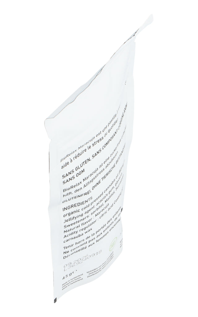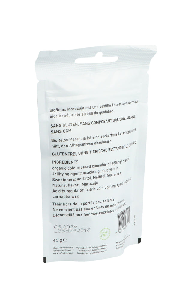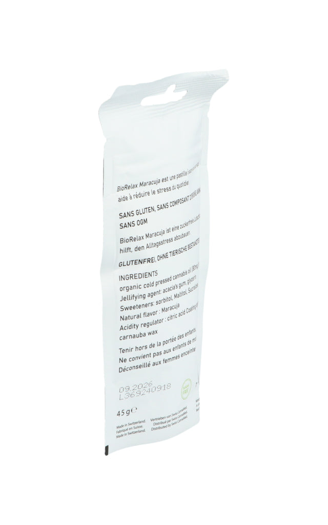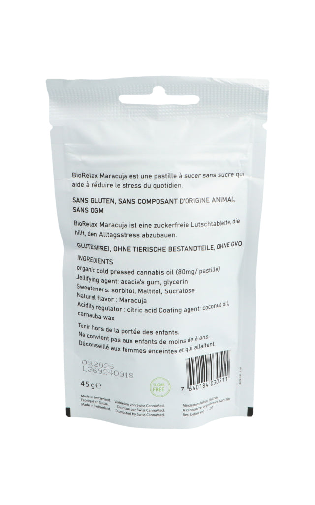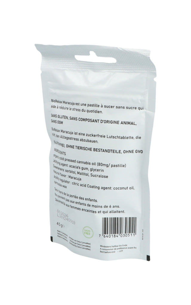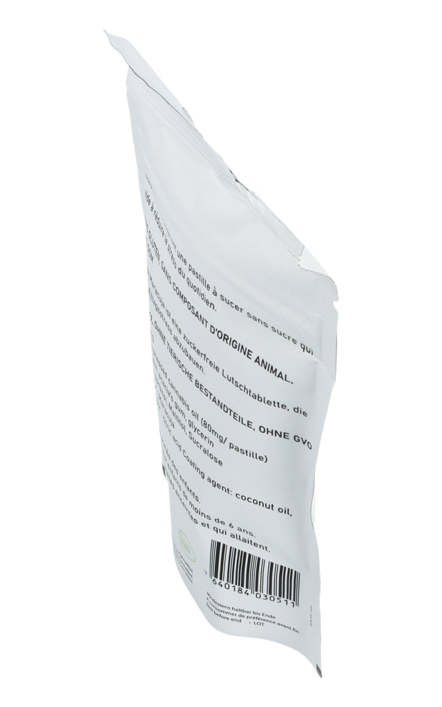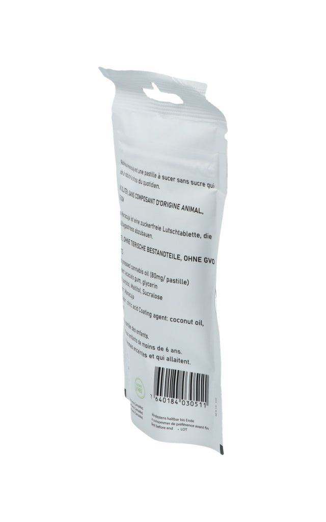 Geliermittel: Akaziengummi, Süßstoffe: Sorbit- und Maltitolsirupe, Sucralose. Hanföl (80 mg / Lutschtablette), Natürliche Aromen: Maracuja,, Säureregulator: Zitronensäure, Beschichtungsmittel: Kokosöl, Carnaubawachs..