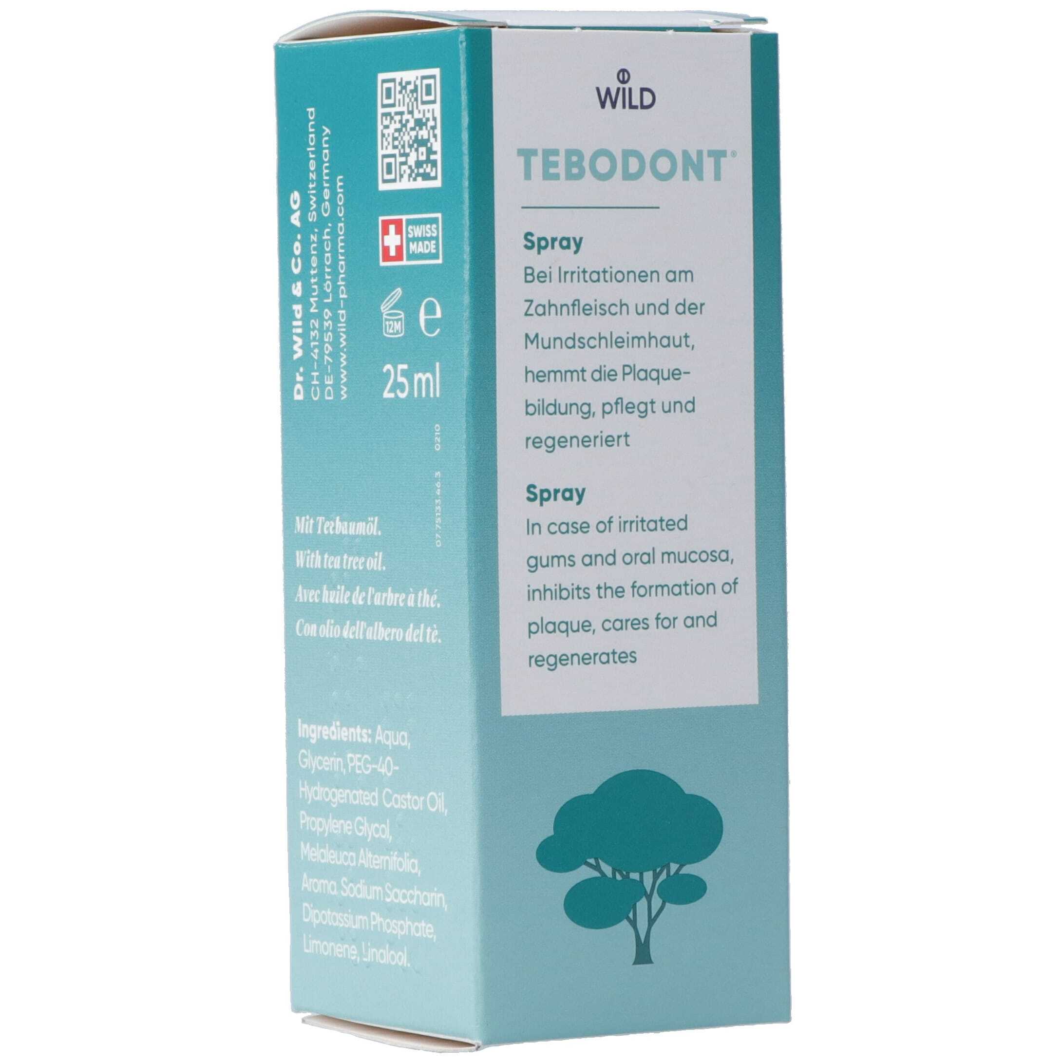 Der Tebodont Spray enthält das originale Teebaumöl aus Australien und wird in der Schweiz hergestellt. Er eignet sich zur Intensivbehandlung bei Irritationen am Zahnfleisch und an der Mundschleimhaut. Der Spray enthält 2.5% Teebaumöl.