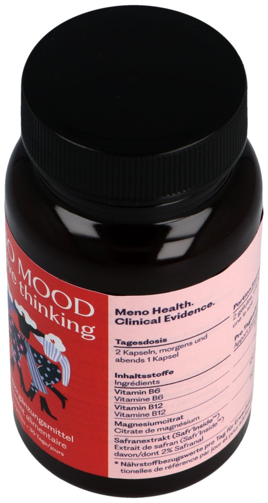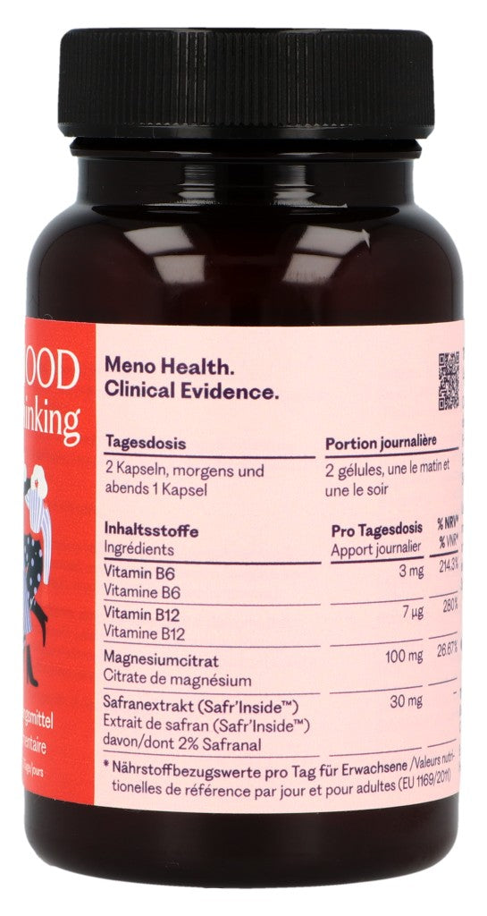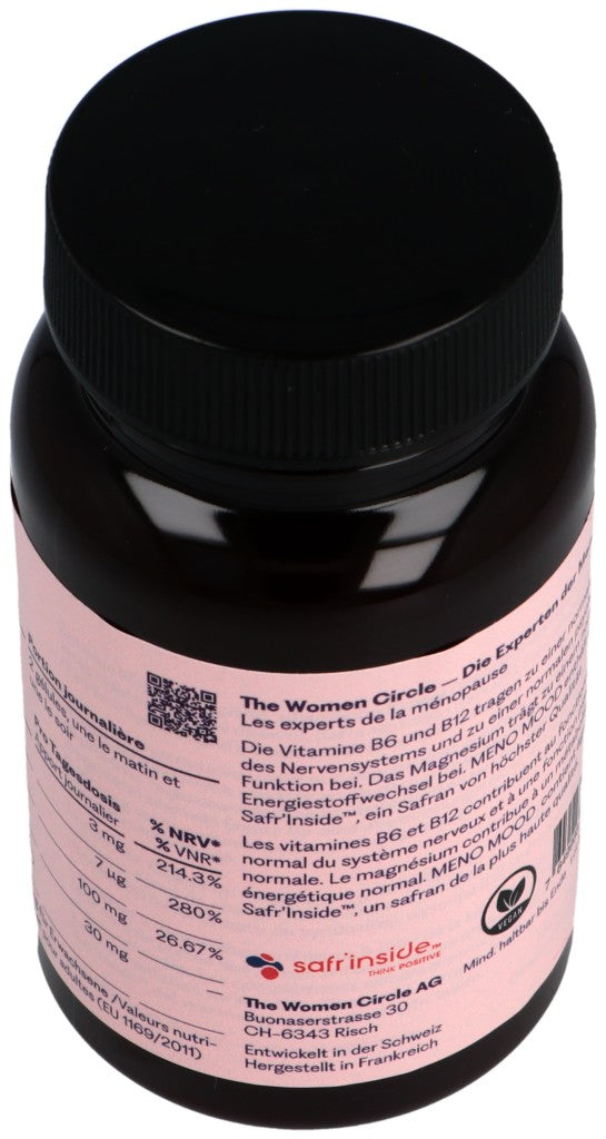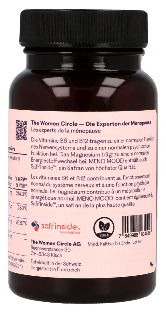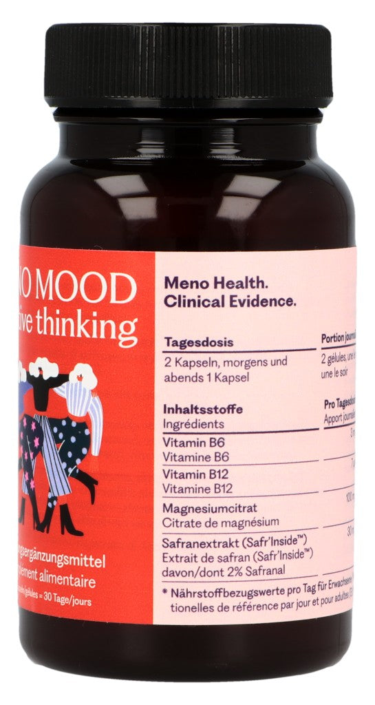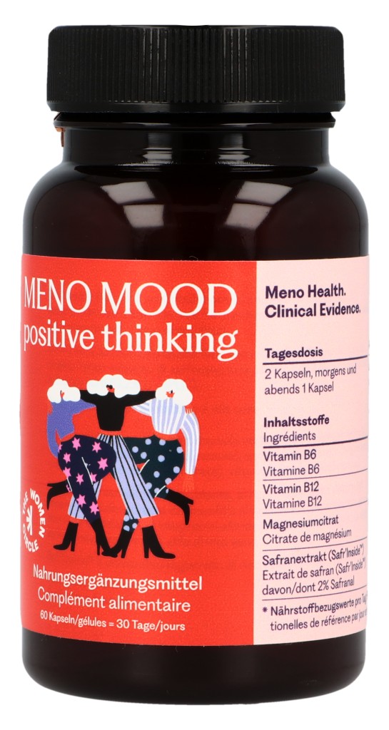 MENO MOOD enthält Safran-Extrakt sowie ausgewählte Mikronährstoffe wie Vitamin B6, B12 und Magnesiumcitrat, die zu einer normalen psychischen Funktion und einer normalen Funktion des Nervensystems beitragen.