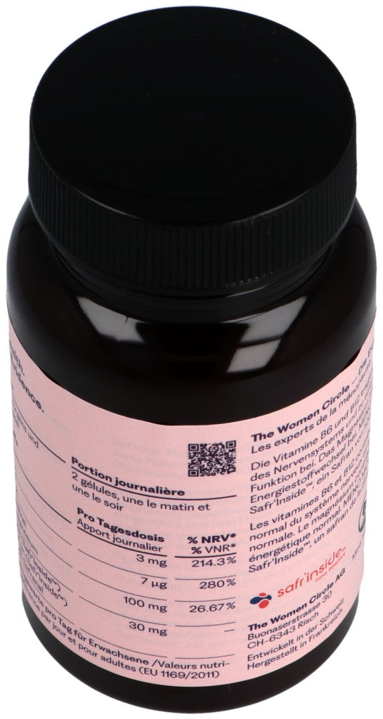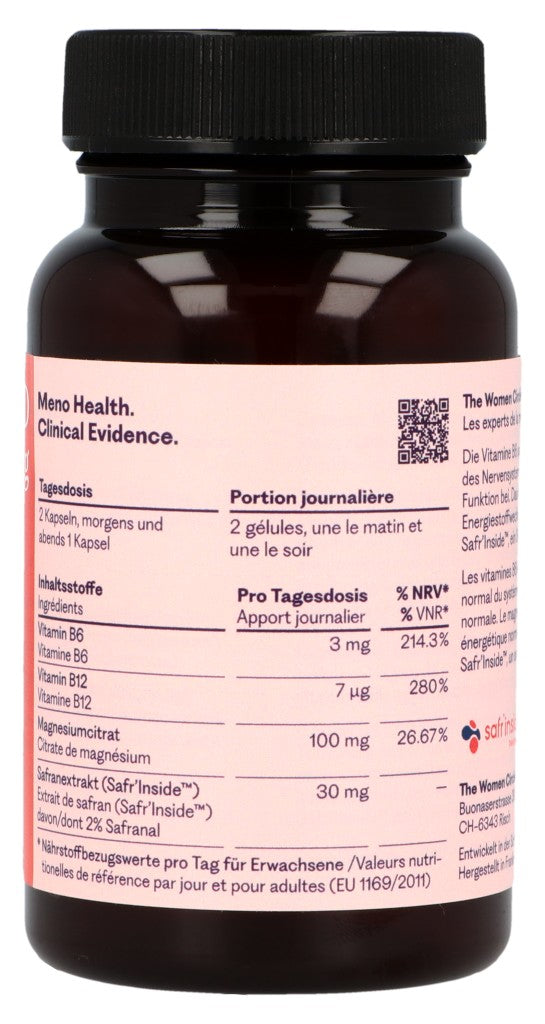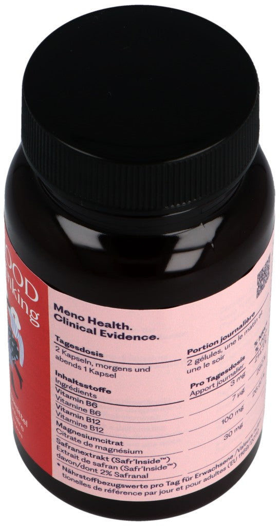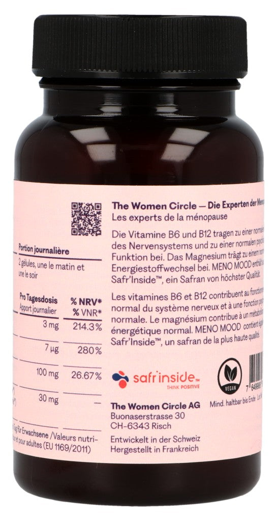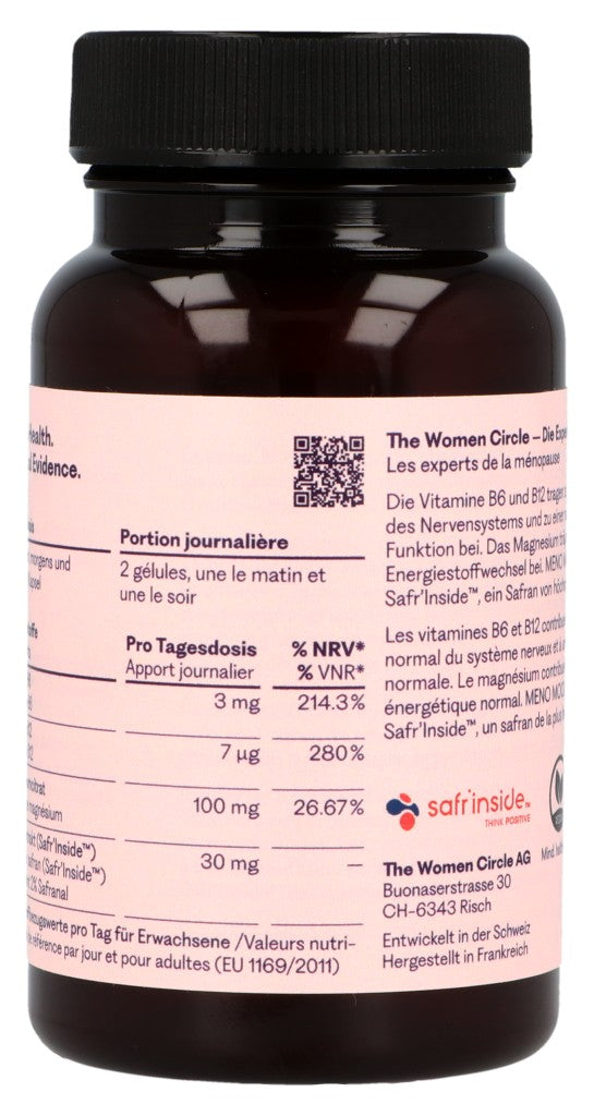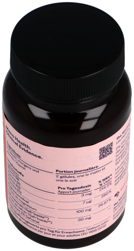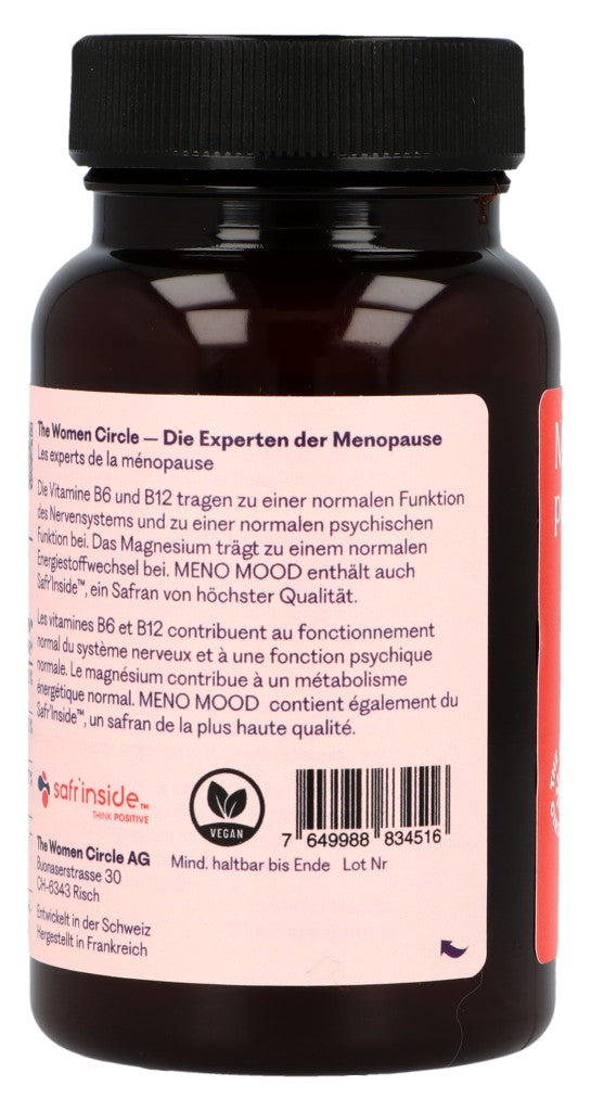 MENO MOOD enthält Safran-Extrakt sowie ausgewählte Mikronährstoffe wie Vitamin B6, B12 und Magnesiumcitrat, die zu einer normalen psychischen Funktion und einer normalen Funktion des Nervensystems beitragen.