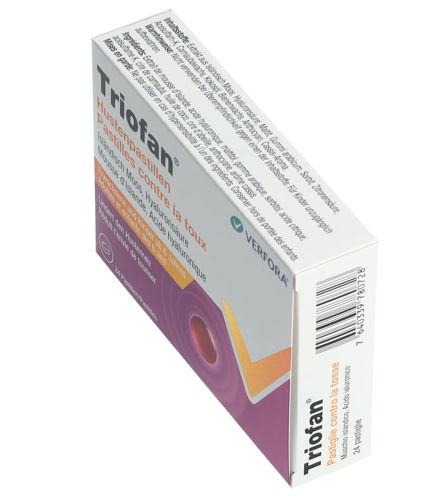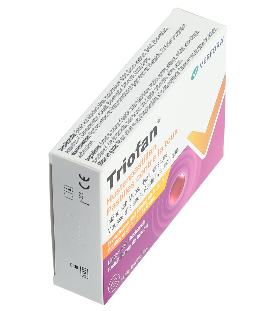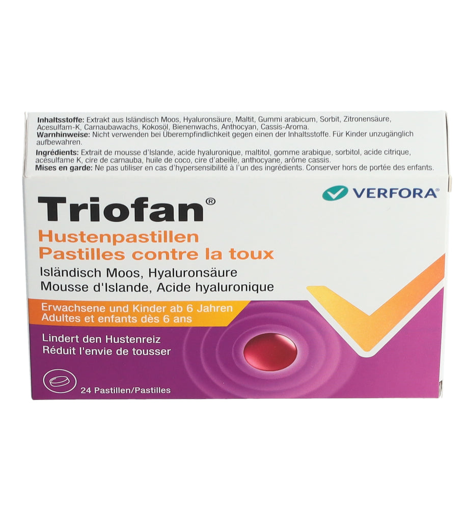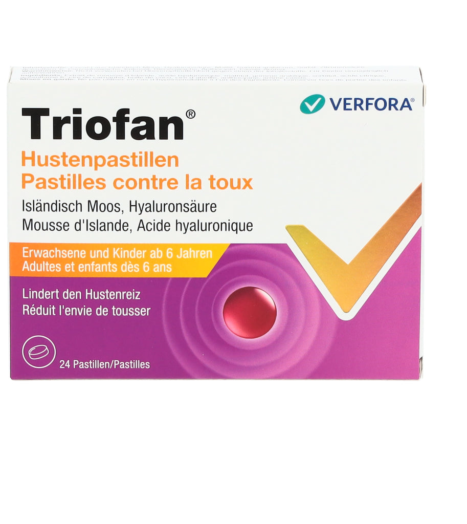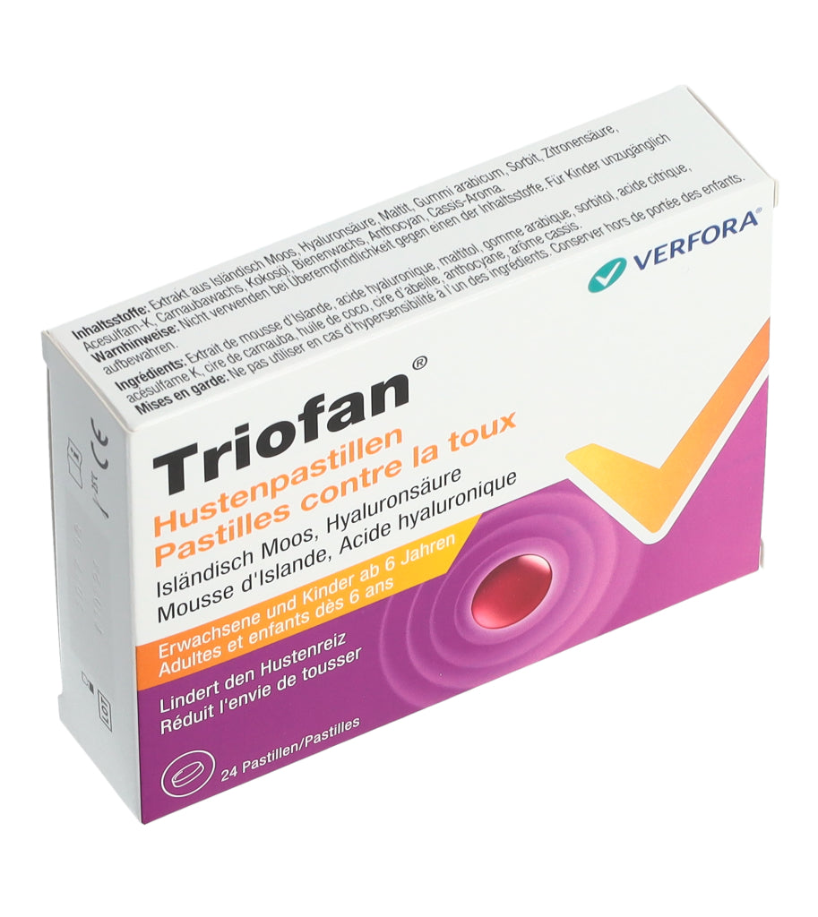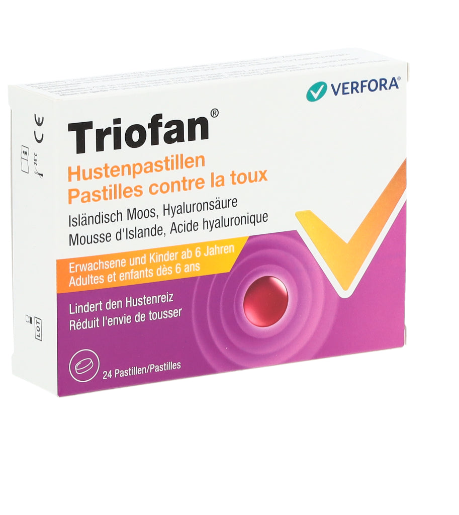 Triofan Hustenpastillen sind in Apotheken und Drogerien in Packungen mit 24 Pastillen erhältlich.