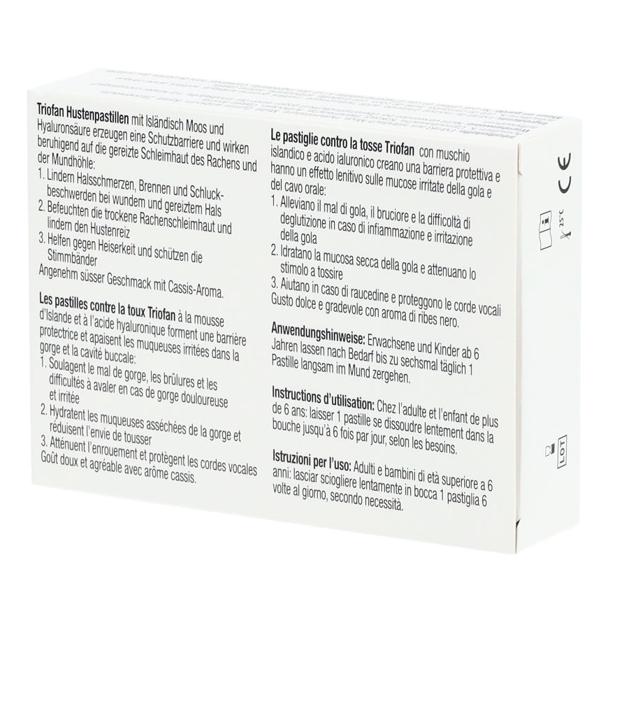 Reizungen, Brennen und Schmerzen werden meistens durch eine Erkältung, eine Halsentzündung oder den Kontakt mit äusseren Faktoren wie trockener Luft oder eingeatmetem Smog und Staub hervorgerufen. Triofan Hustenpastillen enthalten Isländisch Moos mit über 80 % Mucin. Bei langsamem Auflösen bedeckt dieses die Schleimhäute von Mund und Rachen wie ein Balsam und beruhigt die entzündete und trockene Schleimhaut auf natürliche Weise durch diesen Schutzfilm und das Speichern der Feuchtigkeit.