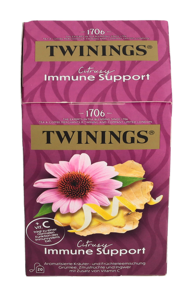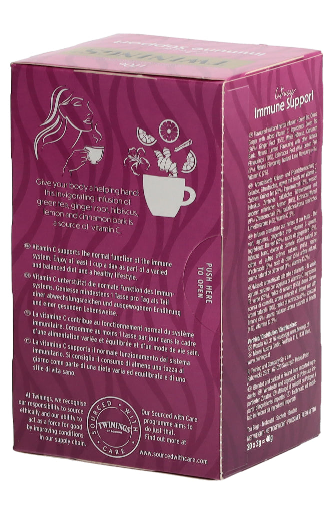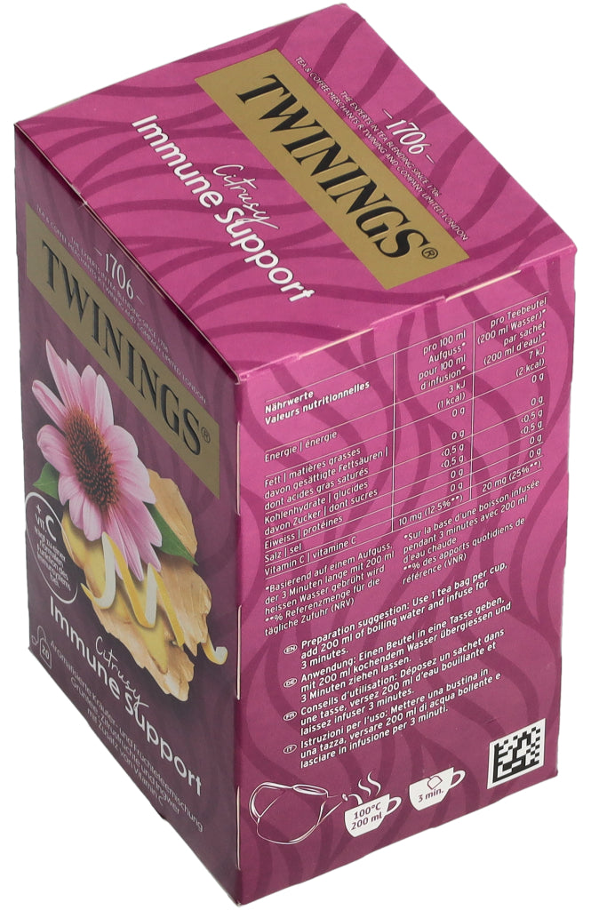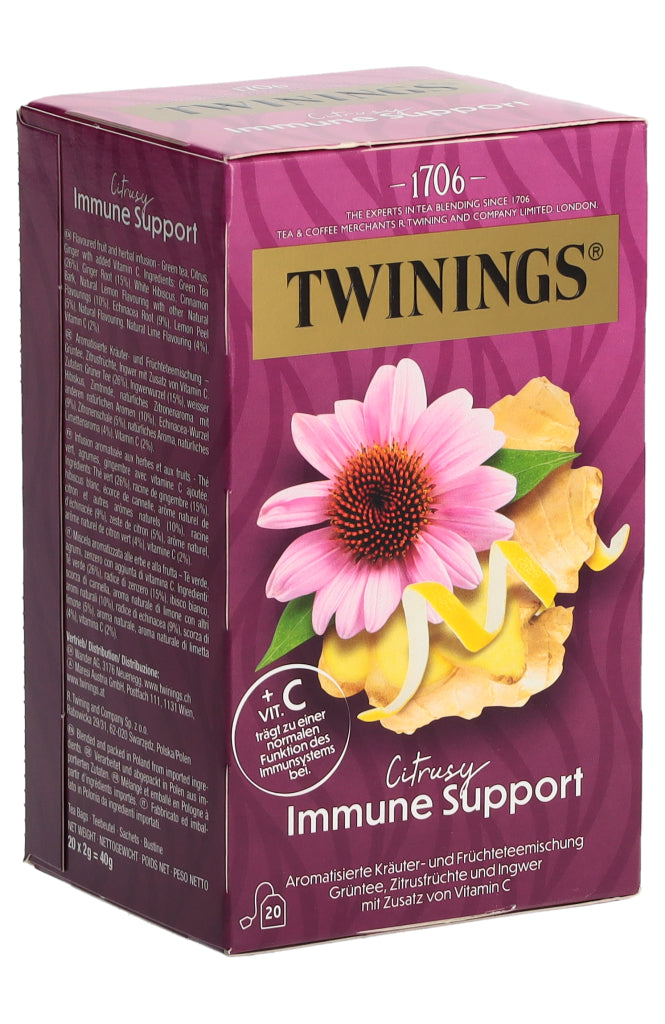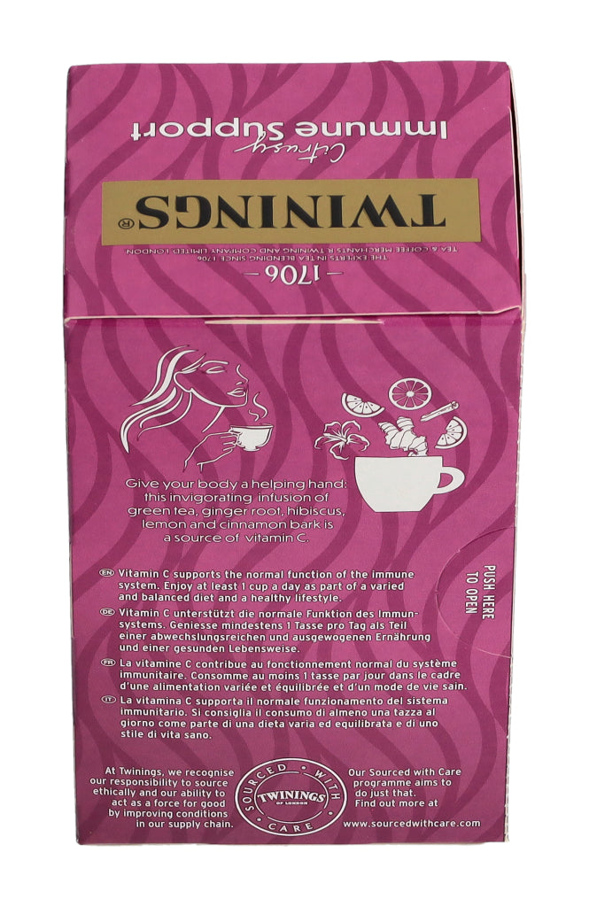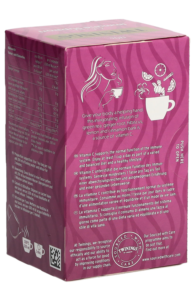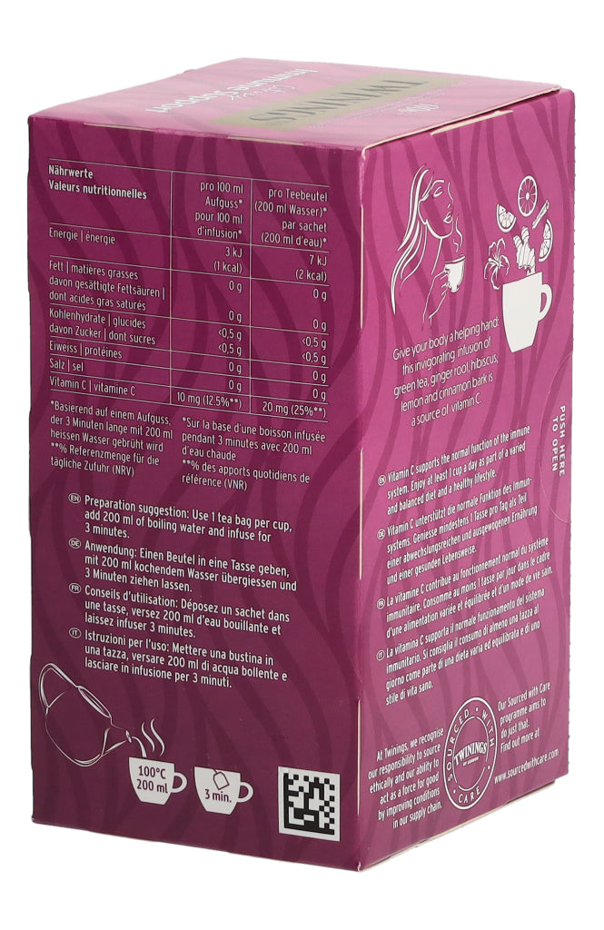 Zutaten: Grüner Tee (26%), Ingwerwurzel (15%), weisser Hibiskus, Zimtrinde, natürliches Zitronenaroma mit anderen natürlichen Aromen (10%), Echinacea-Wurzel (9%), Zitronenschale (5%), natürliches Aroma, natürliches Limettenaroma (4%), Vitamin C (2%)..