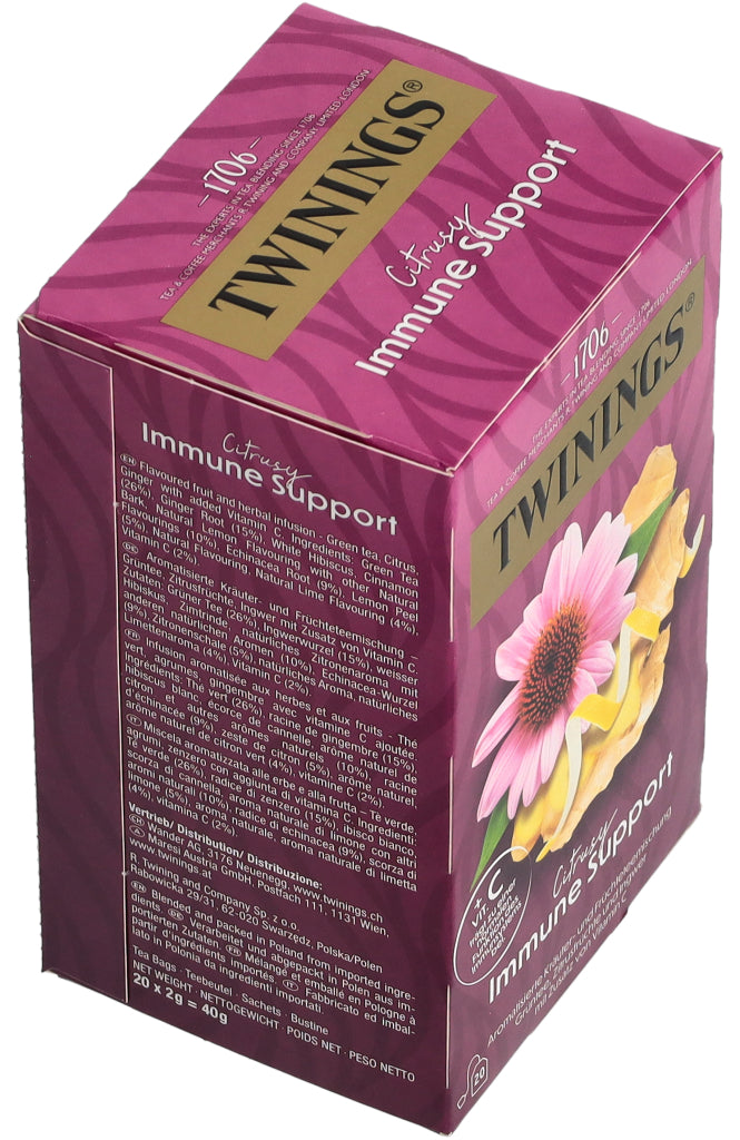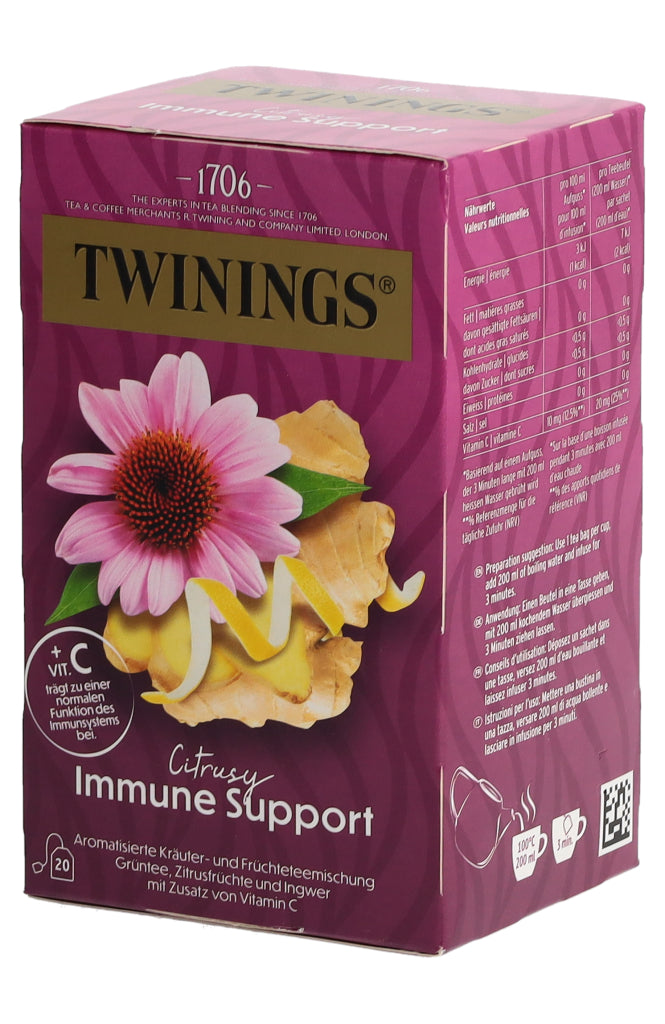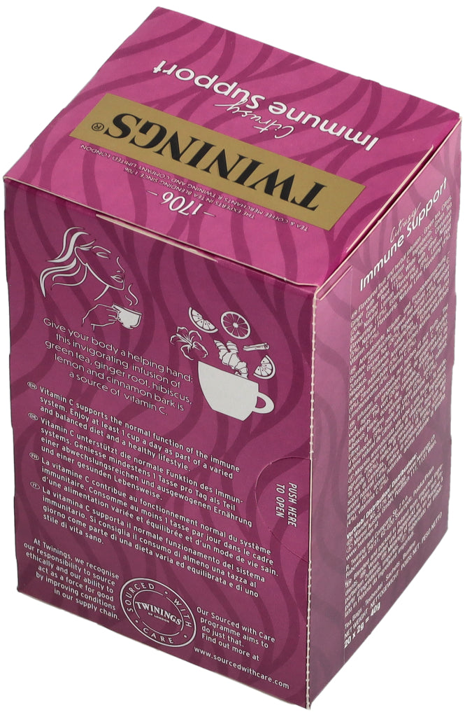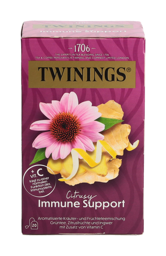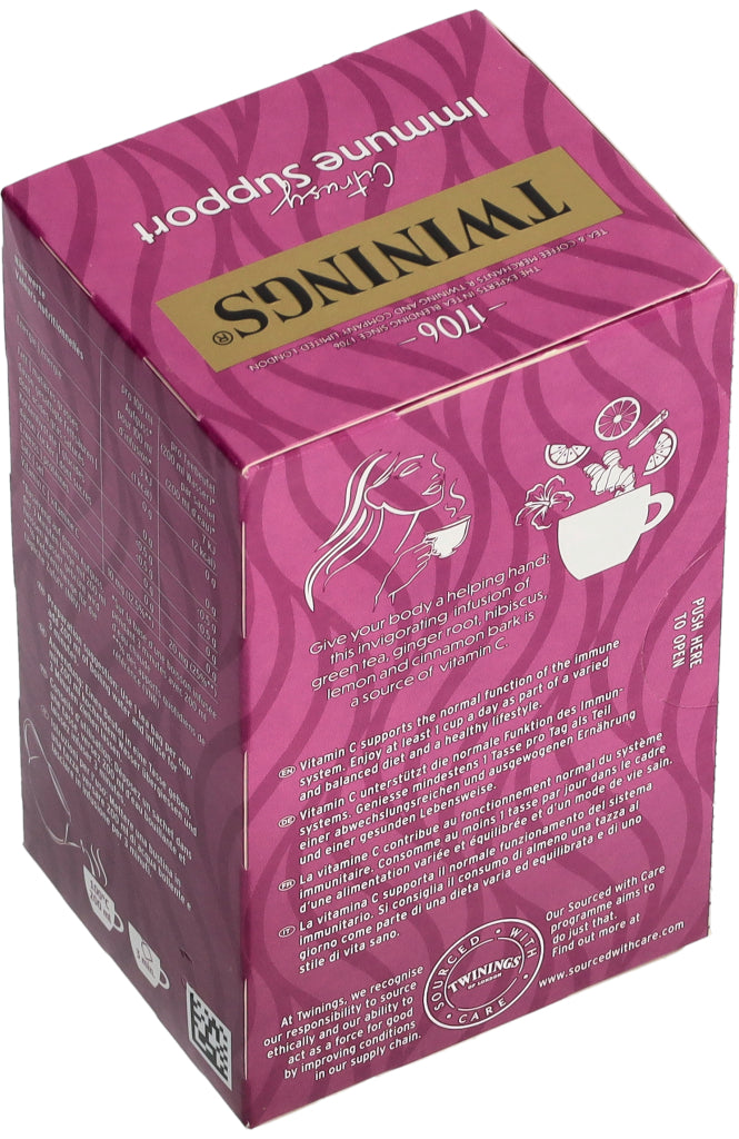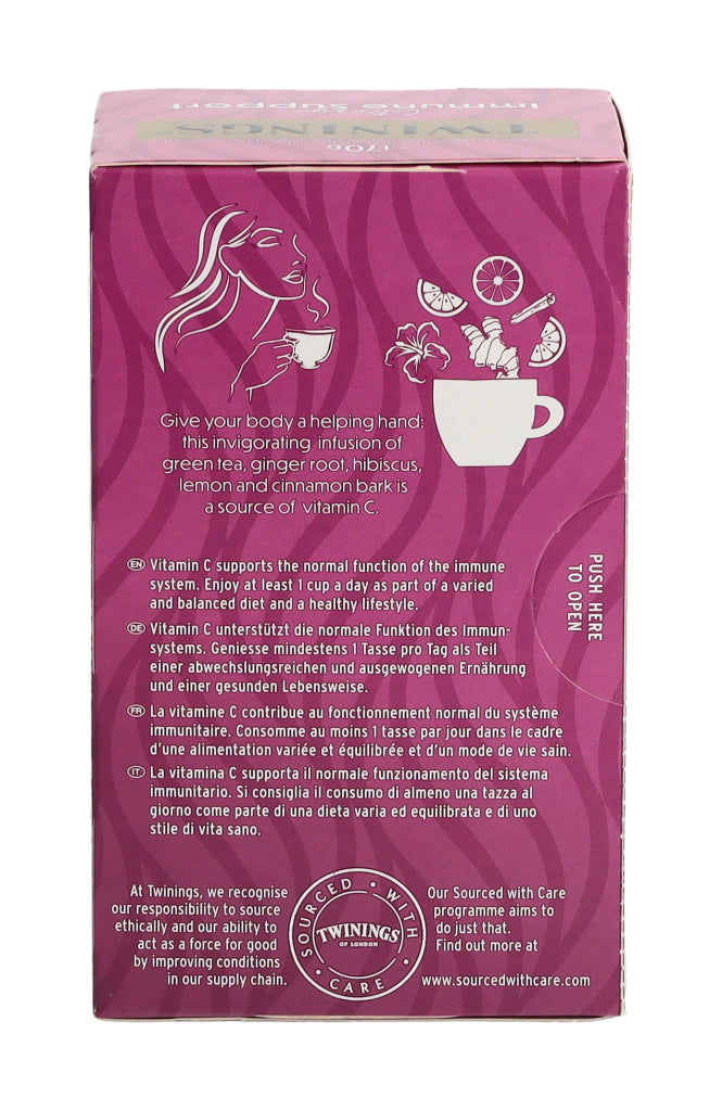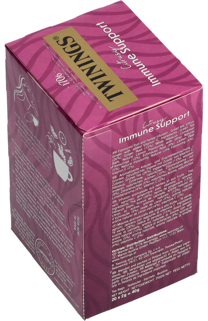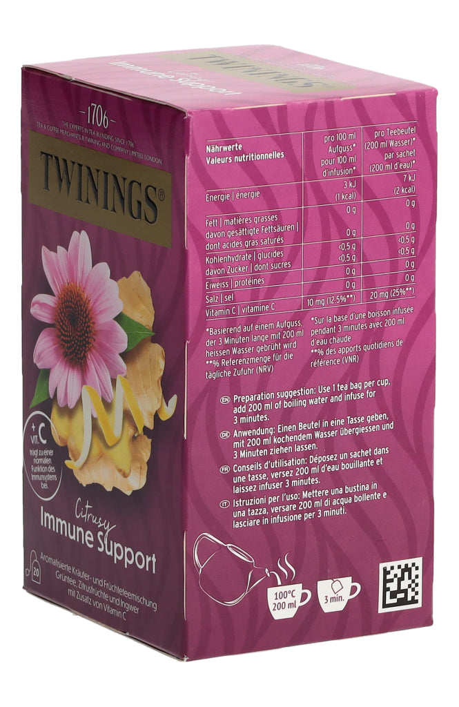 Zutaten: Grüner Tee (26%), Ingwerwurzel (15%), weisser Hibiskus, Zimtrinde, natürliches Zitronenaroma mit anderen natürlichen Aromen (10%), Echinacea-Wurzel (9%), Zitronenschale (5%), natürliches Aroma, natürliches Limettenaroma (4%), Vitamin C (2%)..